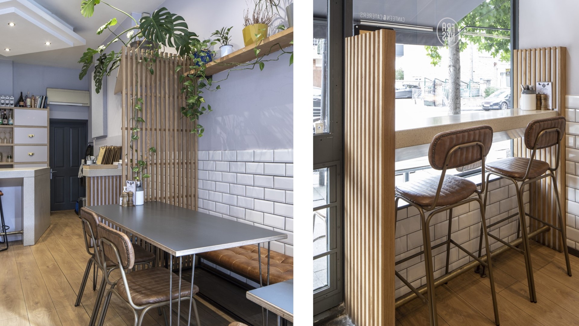 Frank’s Canteen in Islington needed an interior re-design to make it ready for post lockdown shopping and dining. The chef-owner of Frank’s Canteen, a popular Highbury restaurant asked us to integrate the shop space he ran successfully during lockdown with the re-opened restaurant seating area. He wanted the shop area to be visible, but not dominant and not to get in the way of diners. Keeping a keen eye on budget we designed window bars, counters, display shelves and lattice screens to re-organise the space, using birch ply, spray painted MDF and Hi-Macs (an attractive, hygienic composite material) to give the shop and restaurant a smart, clean and relaxed atmosphere.