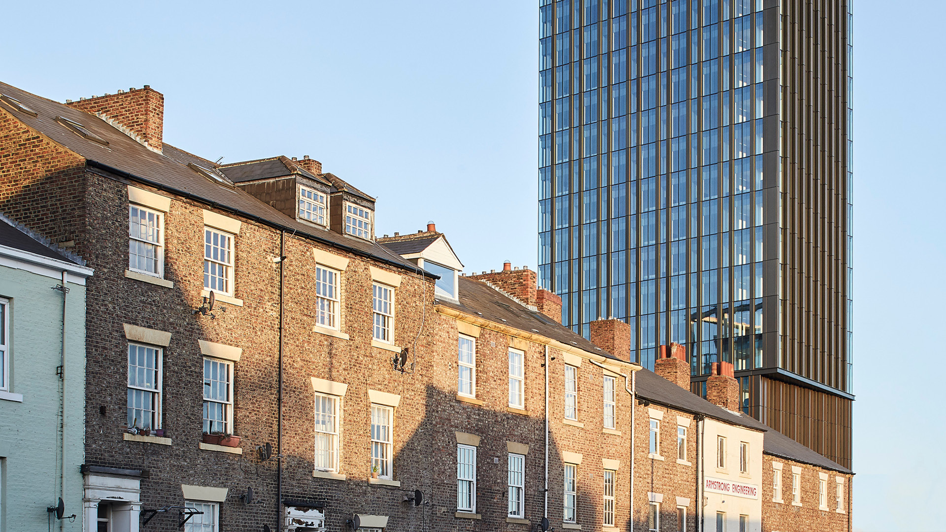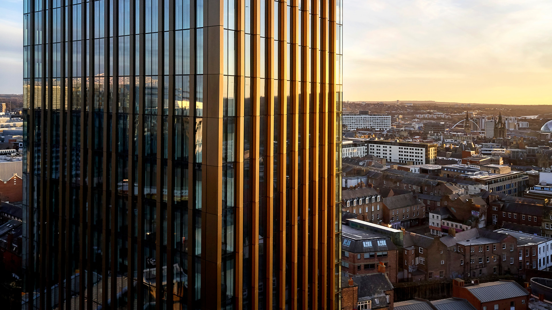 In response to increasing demand for functional city-centre living, FaulknerBrowns envisioned Hadrian’s Tower: Newcastle’s tallest building and the hallmark of a new architectural typology for Newcastle. At the base, solid columns clad in handmade bricks give a sense of human scale and proportion. As you look up, the building’s middle section mirrors the height of the listed Victorian printworks across the street. The tower then reflects the skyline, using a fine grain of vertical glass and bronze-coloured metal elements. The building is angled to align with the historic street geometry – sitting in line with where Hadrian's Wall once stood.