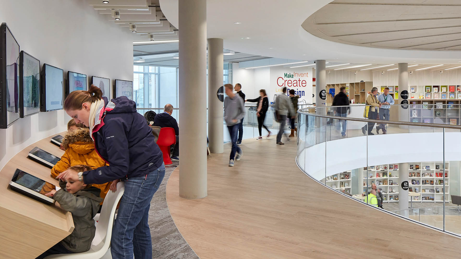 The Word represents a paradigm shift in the community library building typology. FaulknerBrowns centered user experience and spatial design to create a synergy between people, books and culture. FaulknerBrowns were selected to take on this transformative project owing to their history of creating community-focused buildings that inspire a sense of place and belonging. The circular building houses a large, central atrium that links the different spaces and functions, with interactive activities placed closer to the centre and quieter, more private spaces a little more sheltered at the perimeter. The glass façade allows natural light to flood the building, creating a bright environment that reimagines the traditional library stereotype whilst providing panoramic views across the River Tyne, connecting people with place.