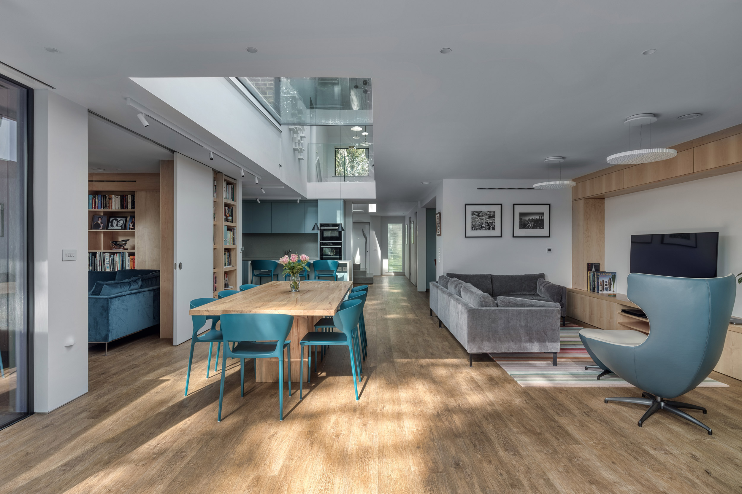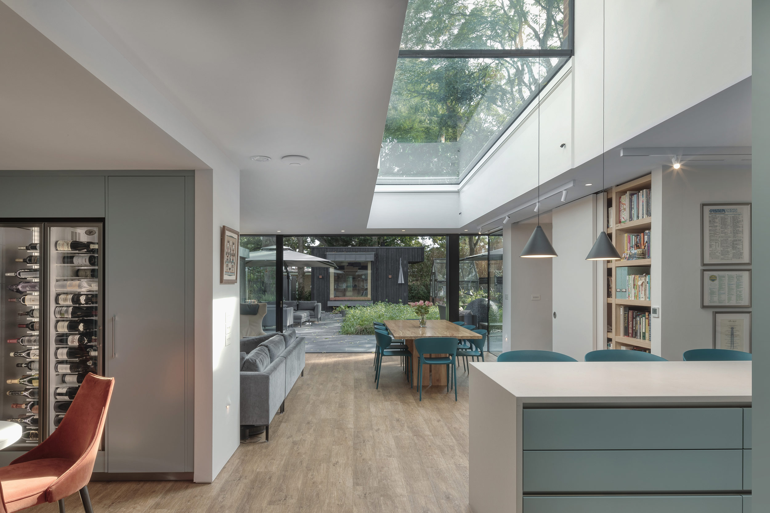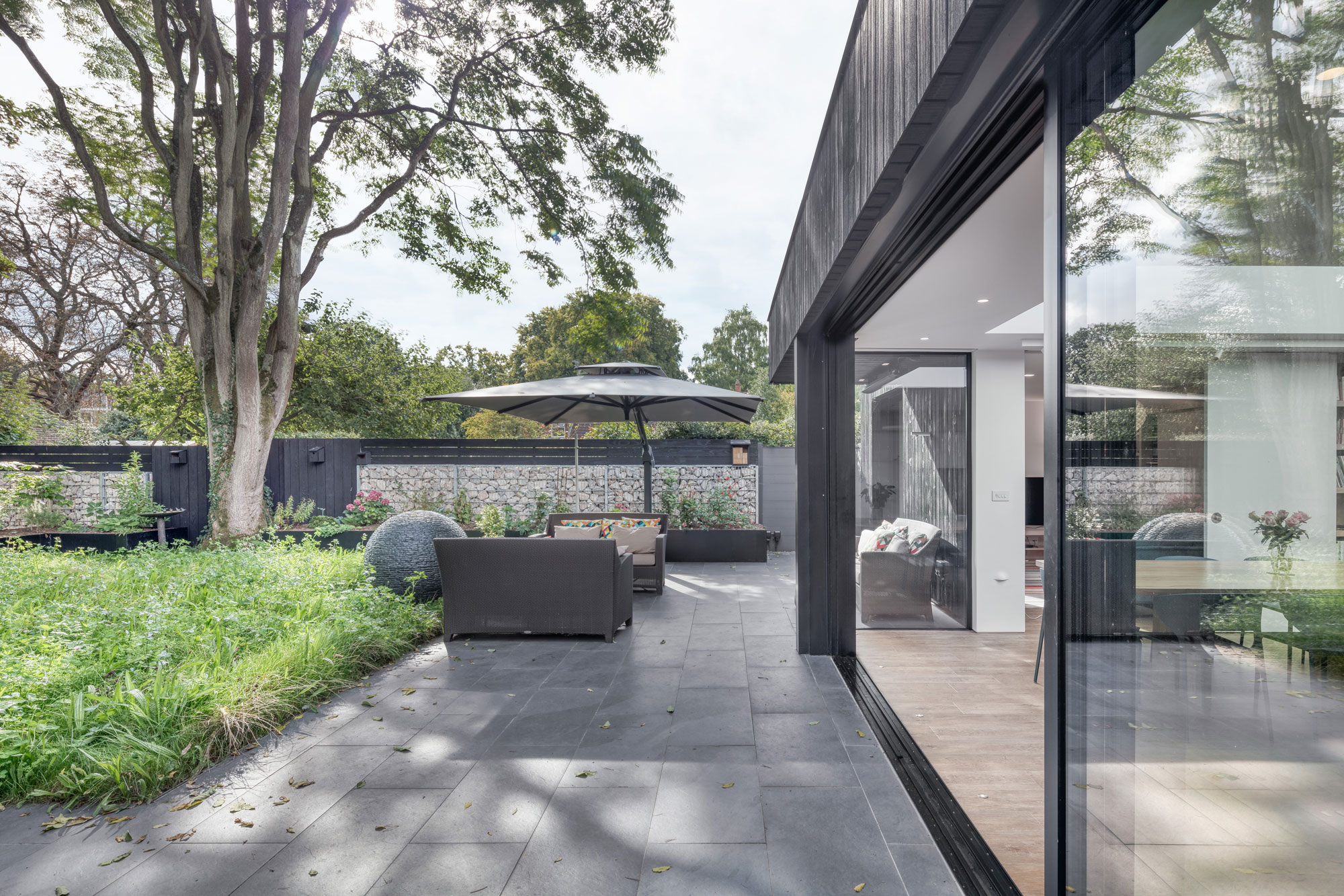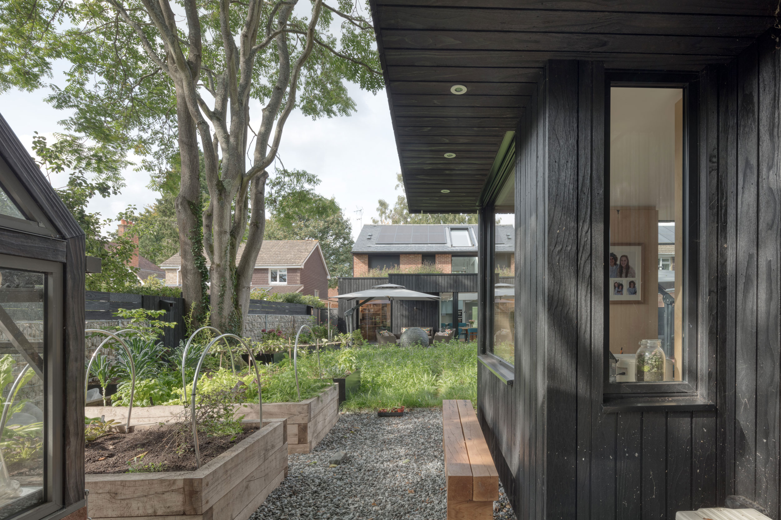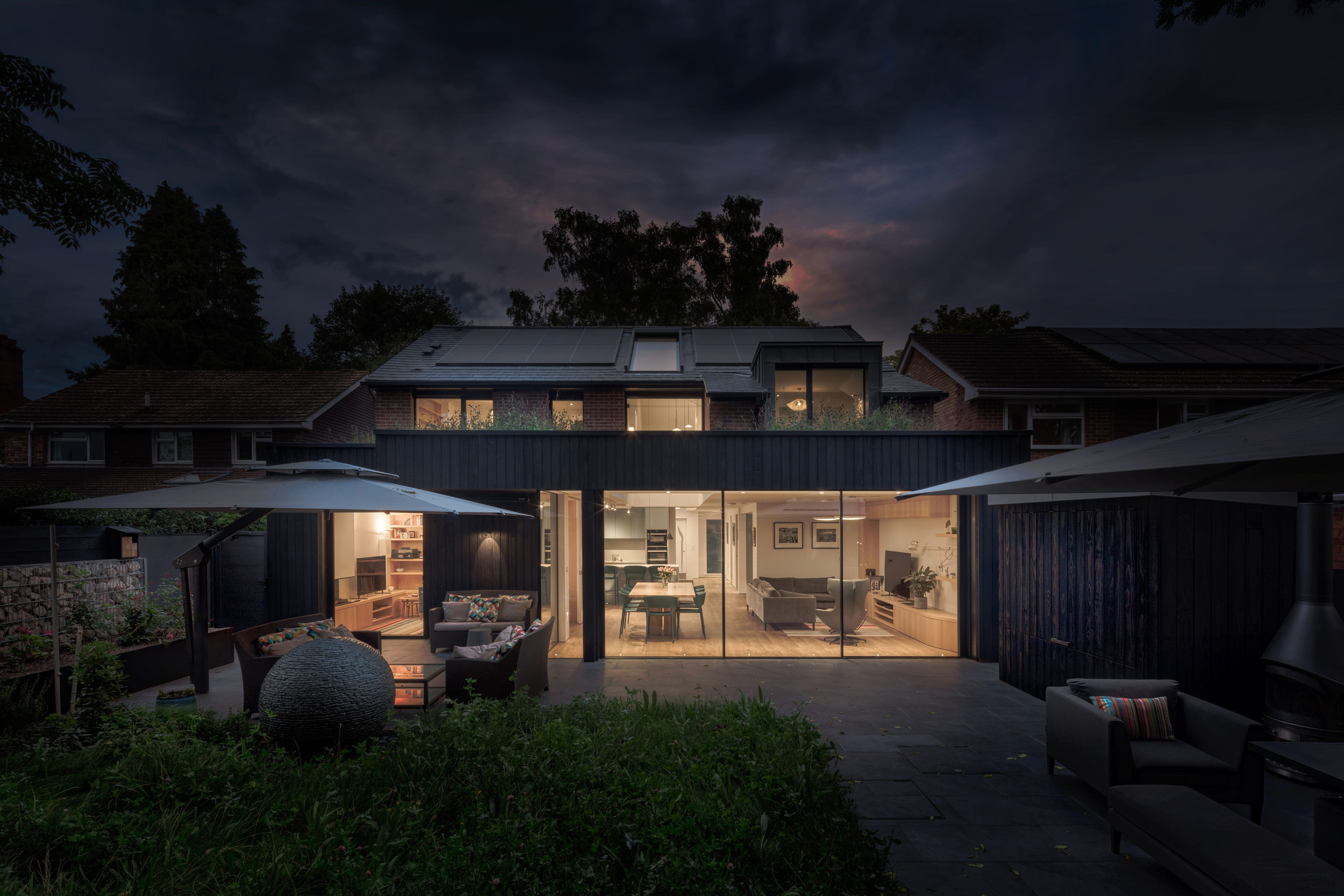 Fleet, Hampshire At first glance, one would not immediately distinguish the façade of this building from others in this leafy suburb. Yet beyond the heavy front door, a home has been rebuilt with an ambitious architectural and sustainable brief. A glazed central atrium splits the house in two providing dramatic views to the roof and garden whilst allowing natural daylight deep into the plan. High levels of glazing with minimal sightlines gives expansive views to the garden. The dwelling incorporates numerous renewable technologies alongside a fabric first approach to maximise thermal performance and air tightness. A garden studio clad in charred timber is carefully situated in a Japanese influenced garden. With a site constrained by established trees, geothermal boreholes were carefully located to avoid root protection areas and link to a ground source heat pump providing heating and cooling to the building. A new basement was formed to accommodate the equipment, with duct routes carefully routed invisibly through the building’s fabric. Photovoltaic panels capture solar energy to help reduce emissions and batteries provide storage for vehicle charging and nighttime use. We were conscious to maintain a balance between building performance and architectural rigour and experience. Spaces are dynamic, flexible and controllable. A bespoke lighting design was developed with the client’s desire to be able to sit outside at all times of the year enabled through the architecture of a large, cantilevered overhang positioned to capture the last rays of the day.