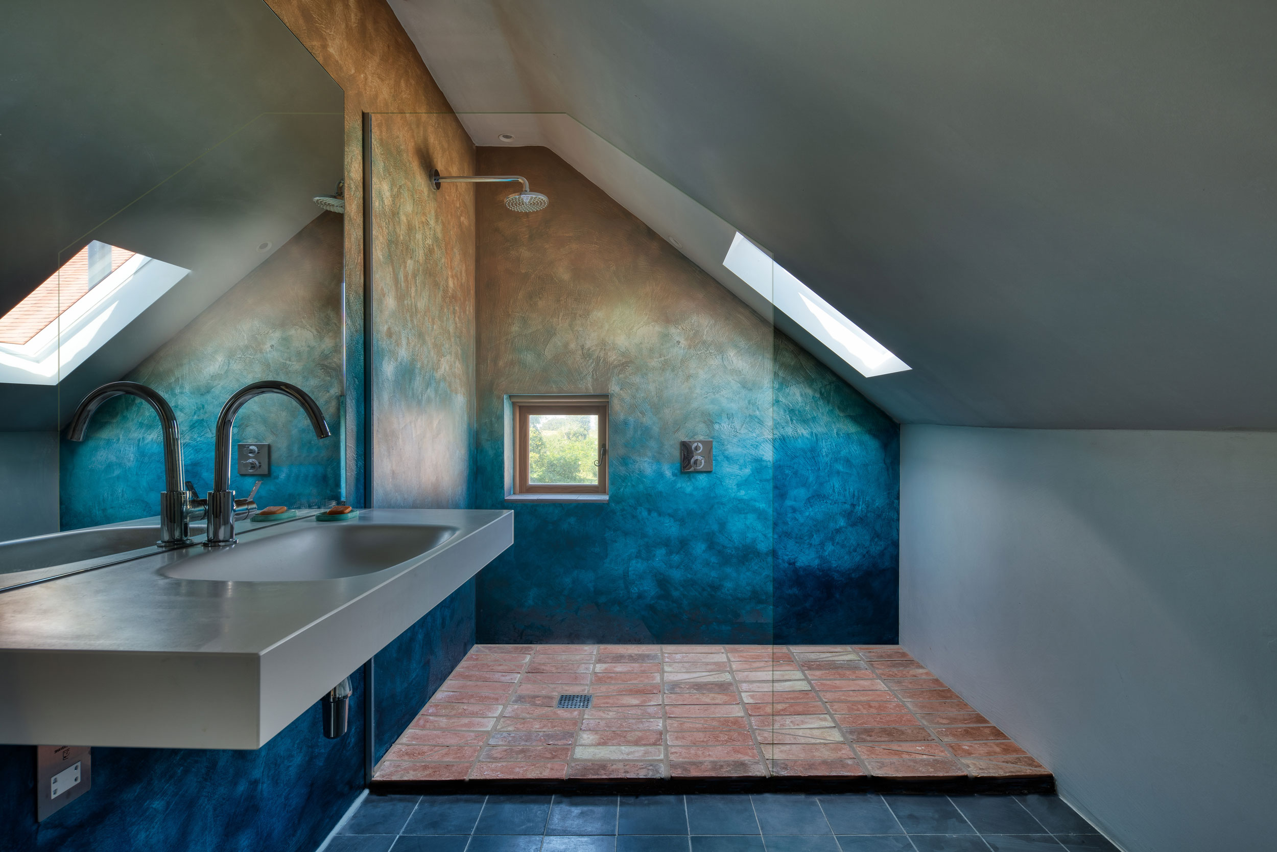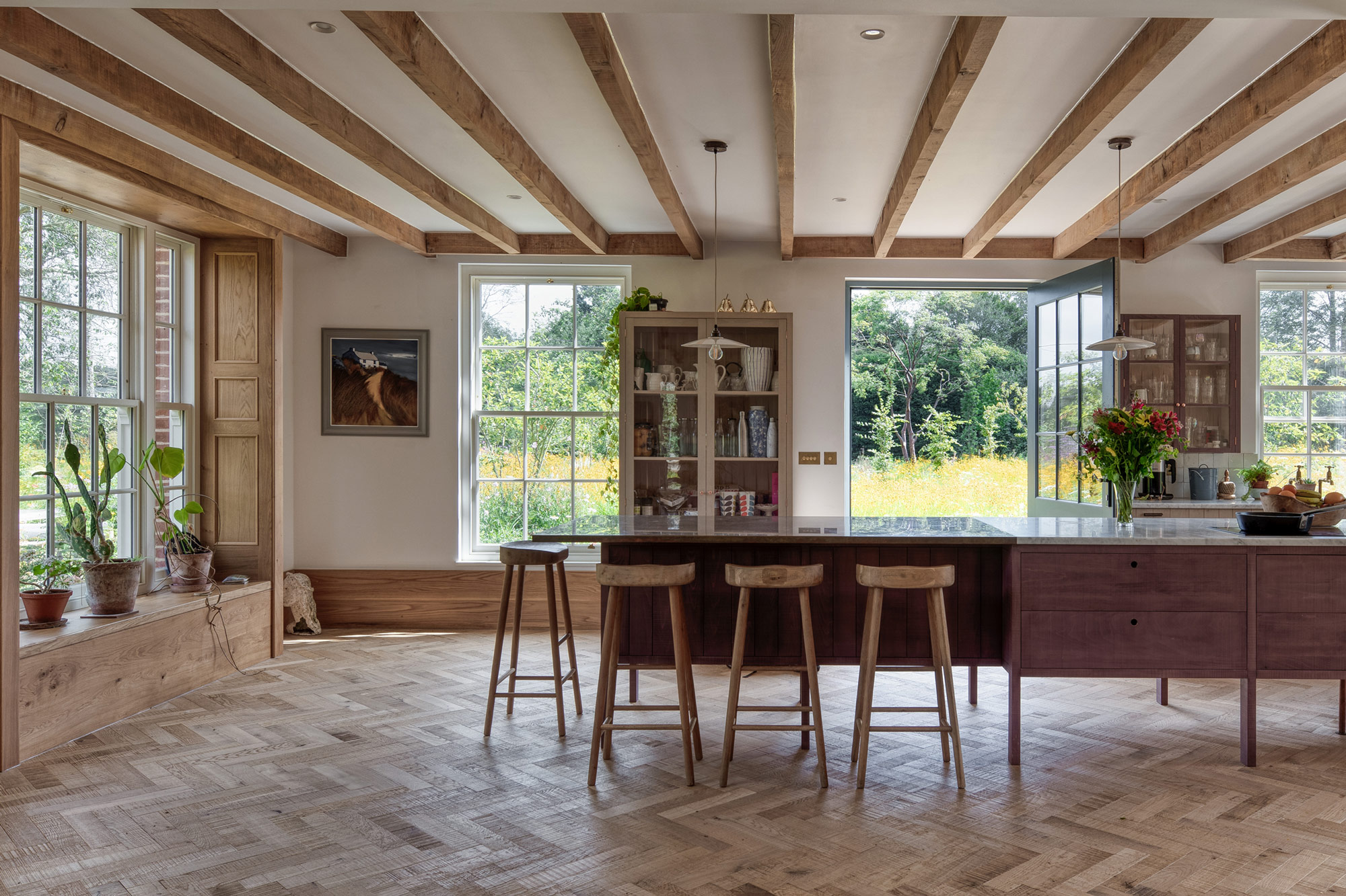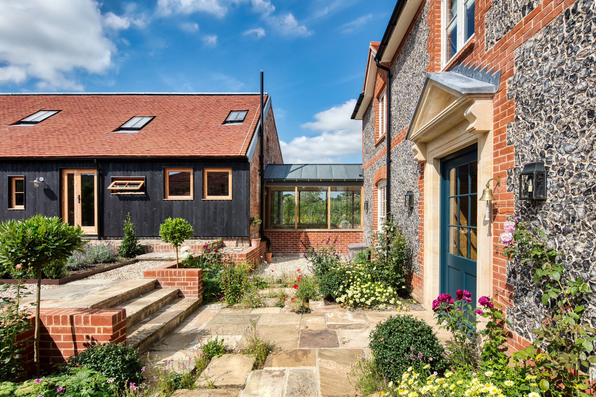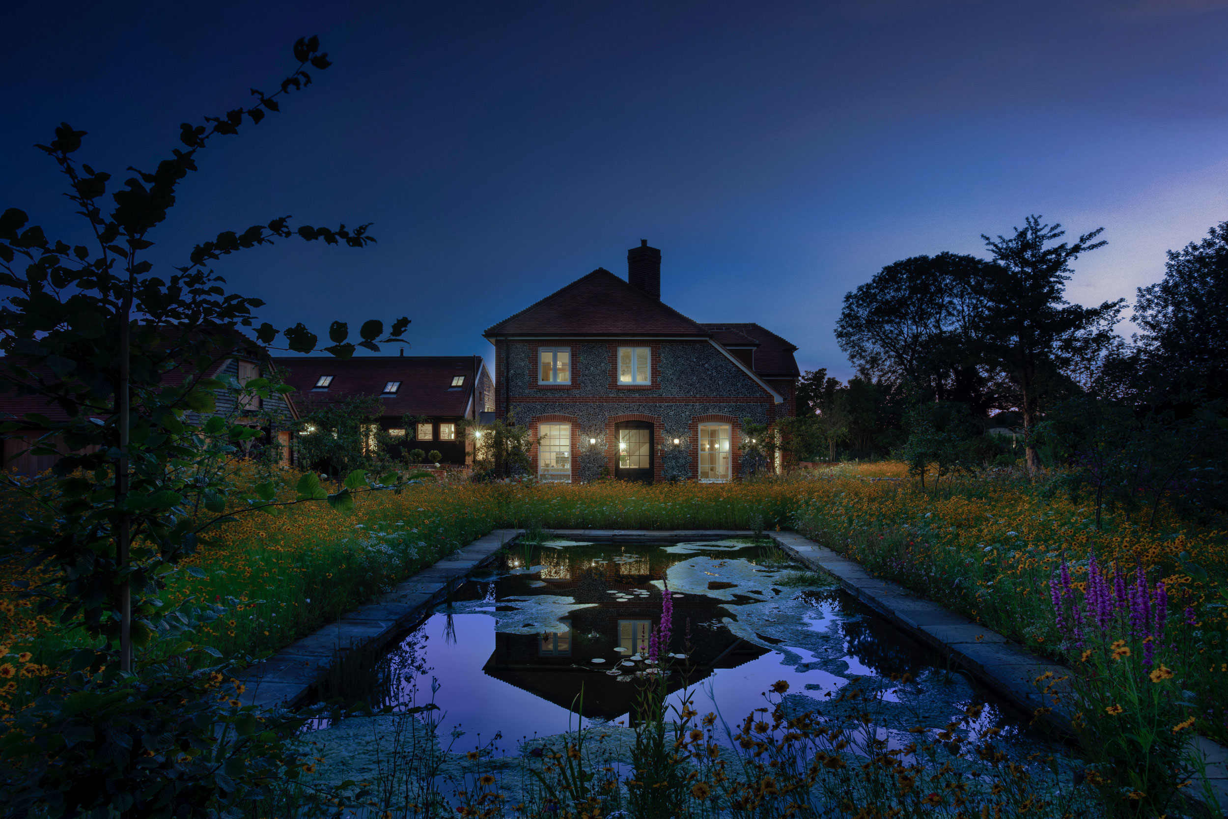 Hopkiln Cottage MIDHURST, WEST SUSSEX 2016 - 2021 Within view of the South Downs Way, the project featured the regeneration of a site previously owned by a local artist. An existing cottage was demolished, re-built and linked to the hop kiln barn which underwent a major overhaul and renovation. The brief was to design a building that appeared like it had always been there. We used local materials and designed details to celebrate the craftmanship of building. Dark knapped flint was hand split on site and installed within a frame of red rubber brickwork. Steep pitched roofs with deep overhangs and handmade clay tiles establish a roof form that seems commonplace within the local vernacular. For the barn, the approach was to conserve and repair sensitively whilst bringing the building and envelope to modern standards for habitable use. It was important to not lose the rugged character of its previous version. Existing rat-trap brickwork and oak trusses contrast against polished concrete floors and the creative use of colour and polished plaster alludes to its past use as a painter’s workshop. New openings in the façade and a mezzanine bring light and new views towards both the Downs and the immediate gardens. We worked with landscape designer Mike Harvey Gardens to create a variety of spaces both formal and wild, blurring the edges of where the gardens stop, and the Downs begin.