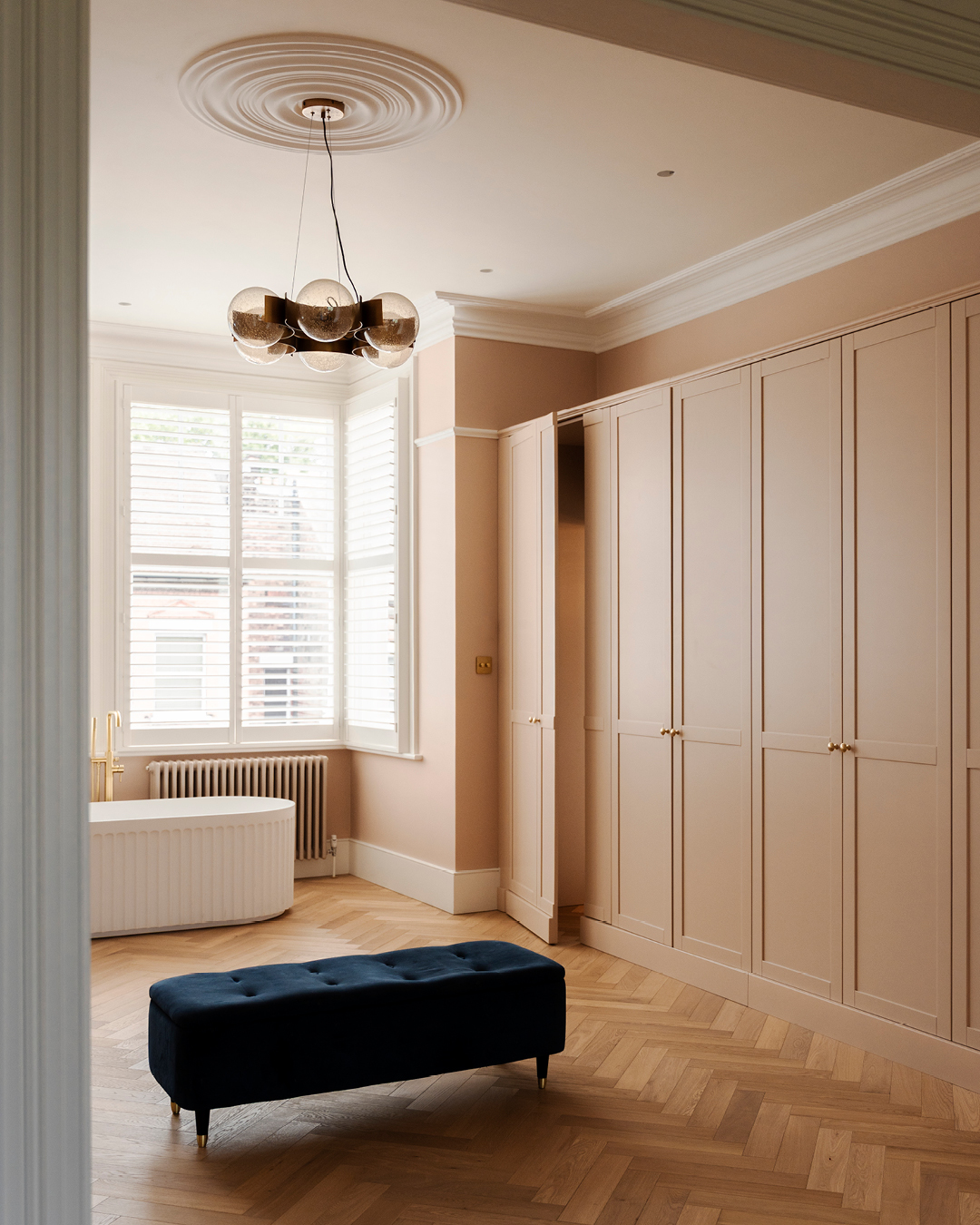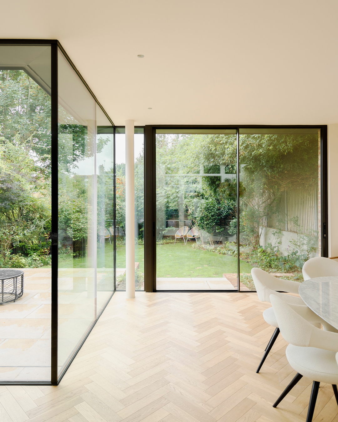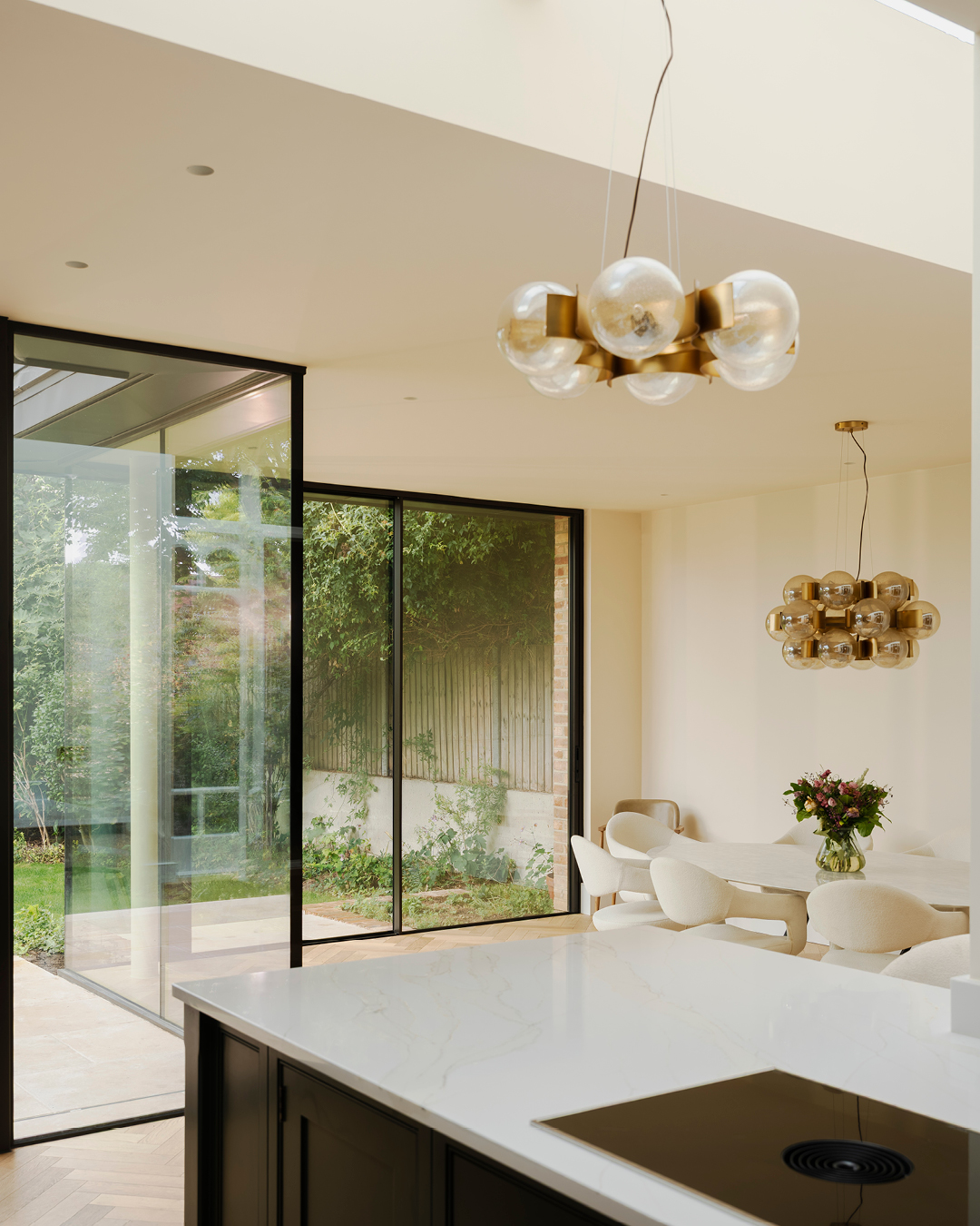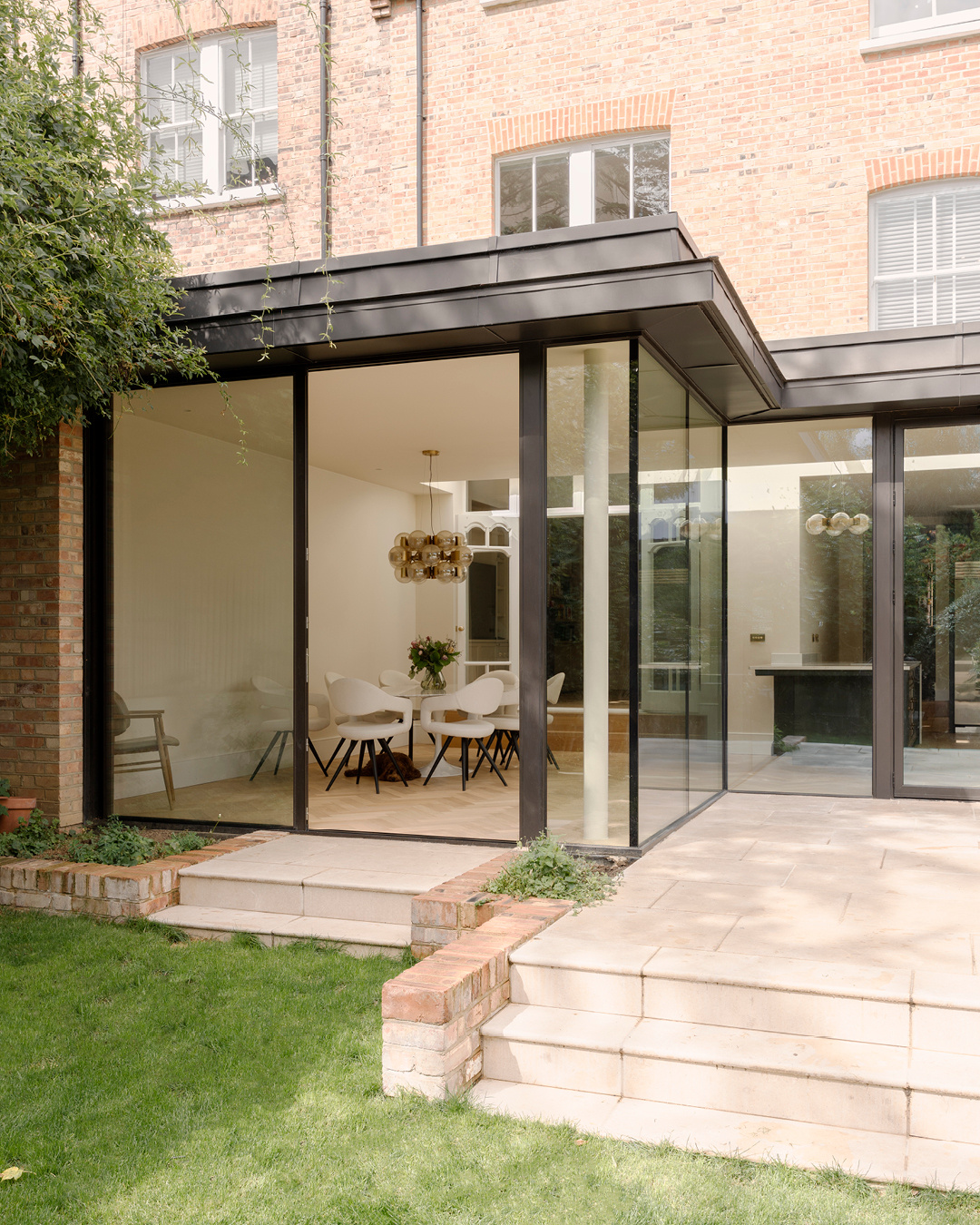 This distinguished red-brick house in Highgate was comprehensively refurbished, and a full-width glazed rear extension added to the rear, transforming the existing property. The property retained many of its original period features, so care was taken to ensure the new additions respected the providence of the existing house. The existing ground floor entrance hall was re-arranged to provide a vista through the house to the mature rear garden, with the existing stained glass, cornices and staircase being fully refurbished to enhance the Victorian characteristics of the house. The 6.3m deep rear extension takes advantage of the planning context, adding 300sqft to the house. Full-height glazing and a full-width rooflight allows natural daylight to permeate the deep plan, creating a harmonious sequence of spaces that calmly transition between the formal reception rooms and the rear extension. The first floor was re-organised to create a large master ensuite, including a bedroom, dressing room and ensuite. Stained herringbone flooring and marble finishes were selected along with bespoke joinery to give the space a luxurious quality to reflect the scale of the rooms. The second floor was re-organised to provide three well-proportioned bedrooms, a utility room and family bathroom. Formwork provided architectural, interior design, joinery design, contract administrator and cost control services.