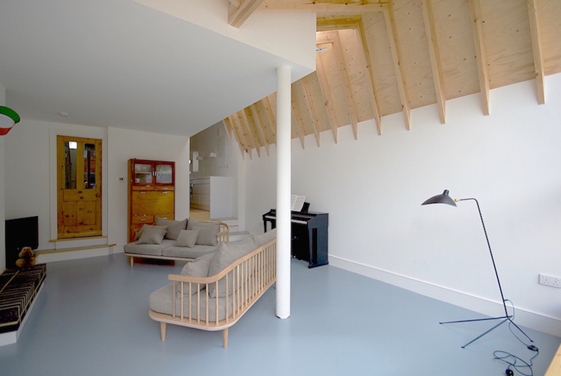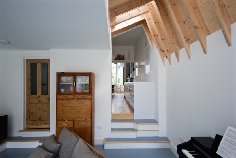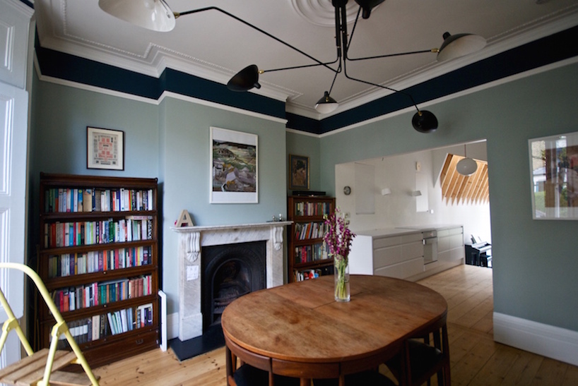 The house had not been decorated for many years and a refurbishment with rear extension was well overdue. A new non-conformist rear extension was proposed. A modern interpretation of the London Roof provides the extension with a unique language for the house. Internally the roof structure is expressed as exposed timber joist with a plywood ceiling which adds a simple but natural warmth to the interior. The roof construction avoids the traditional cold roof construction of slate tile and rafter and instead uses a single ply polymeric roof membrane to provide a lightweight well insulated warm roof construction. A large hexagonal glass window frames views of the small urban garden from the living room. As part of the reconfiguration works the kitchen has been moved into the middle of the house floor plan with an new open plan galley kitchen providing a connection between the lounge to the rear extension and the dining room which has moved to the front bay windowed room. The dining room is now perfectly orientated for the early morning sun-rise to the East and perfect for breakfast. Other works to the house involved the conversion of the original roof space to provide a traditional loft conversion which adds a new floor of accommodation for guests. A wet-room shower room which has been located cleverly on the top floor landing to avoid losing any bedroom space allows the top floor a certain degree of self-sufficency. The house was originally configured as a three bedroom house now provides five bedrooms. As part of the refurbishments the entire house has been rewired with new plumbing throughout. Each room has been provided with hardwired CAT 5 data connectivity which has reduced the reliance on a poor wi-fi signal quality through thick Victorian walls.