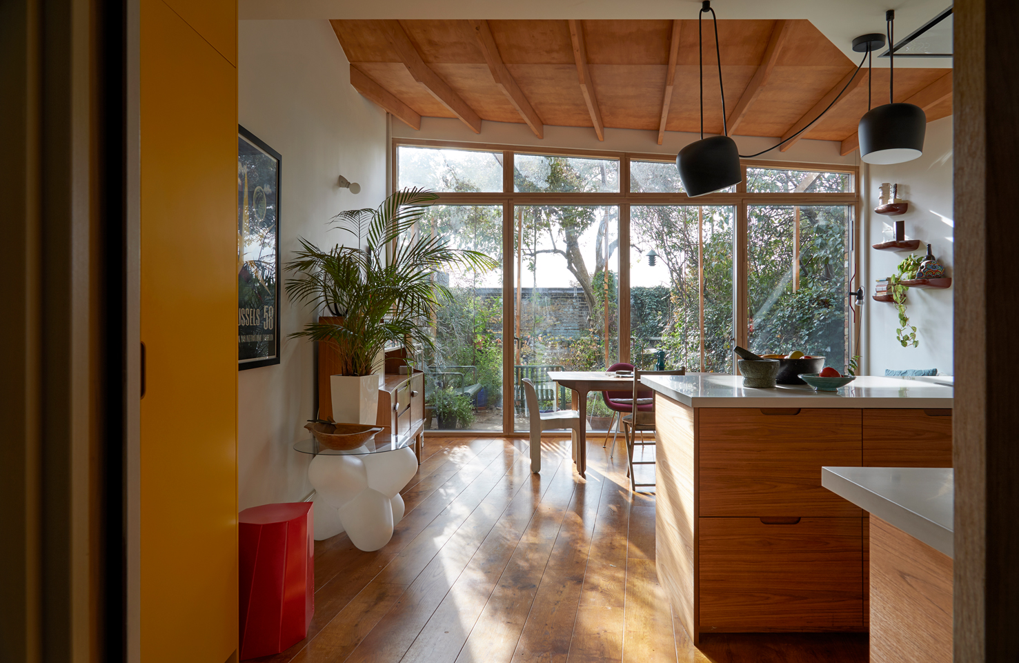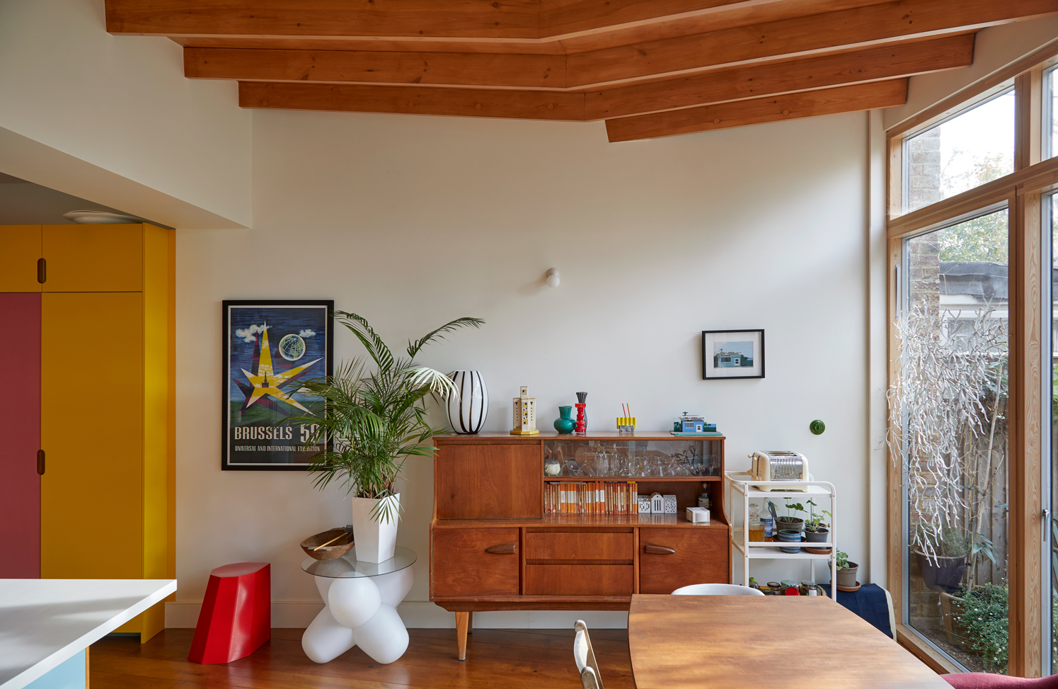 forresterarchitects have completed a distinctly retro style rear extension to a terraced house in East London. A touch of scandinavian influence compliments a way of living with mid-century furniture providing simple lines and natural materials. An inclined exposed roof structure and timber floor provides a visually interesting interior which extends outside to form a garden pergola to a south facing terrace. The new rear garden pergola extension is perfectly orientated enjoying sunshine in the early morning through to the late evening. As well as providing a passive solar shading device to the interior the new pergola defines a wonderful terrace overlooking the garden. The south facing aspect is prefect for the client. A far cry from the large, cold and draughty conservatory space which it replaced.