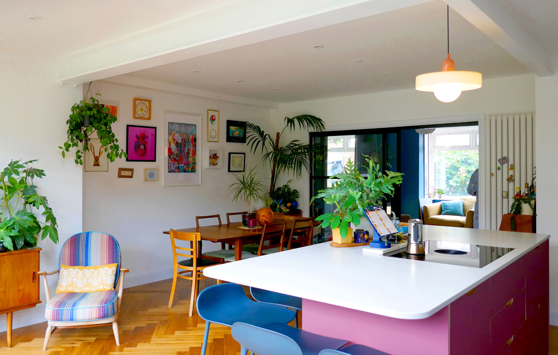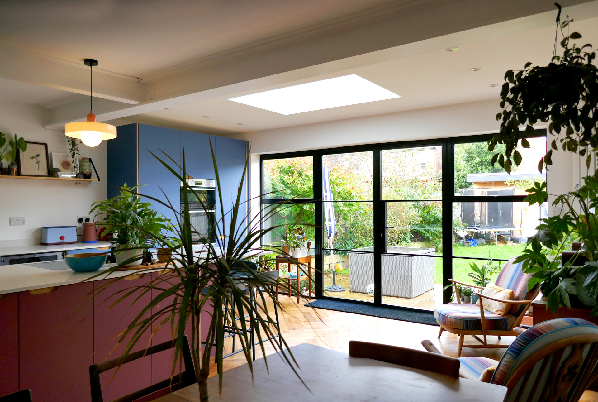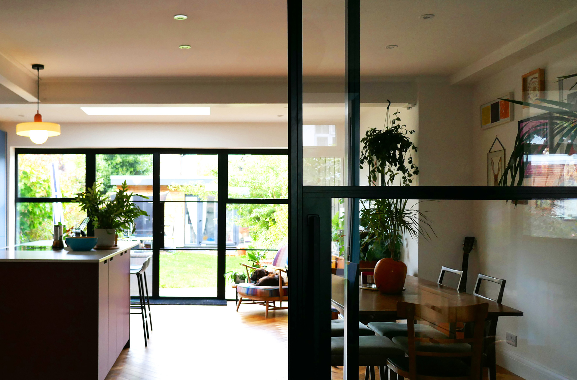 This house already had a 1980s single-storey rear extension which provided extra floor area, but it didn't make the most of the space; with a narrow galley kitchen and dimly lit dining room. Our proposals opened up the space by removing a number of internal walls and the chimney breast to create a generous, open-plan kitchen-diner and sitting area. New crittall-style glazing and a rooflight improve daylighting and the connection with the garden, whilst a new vibrant kitchen improves functionality.