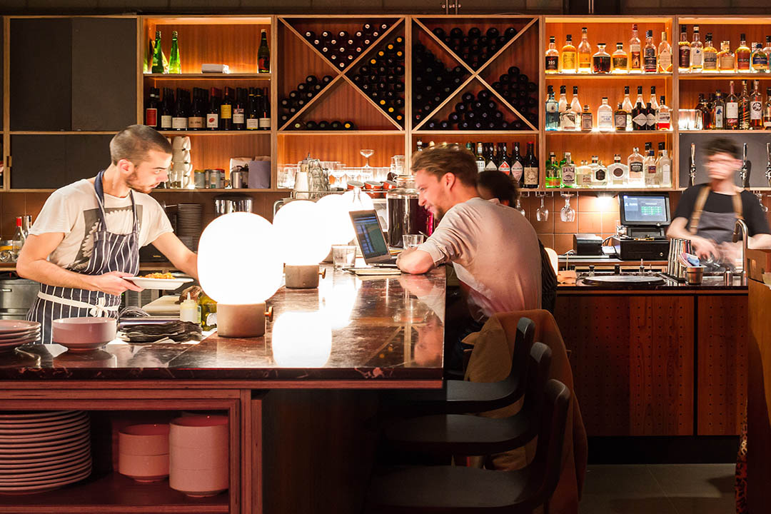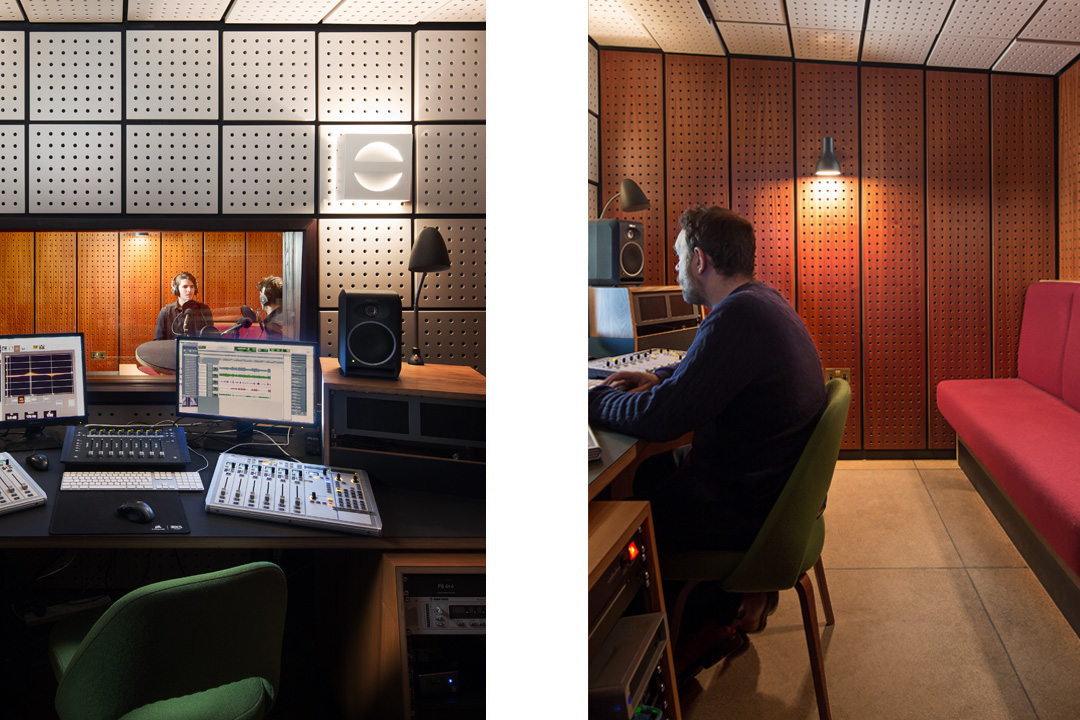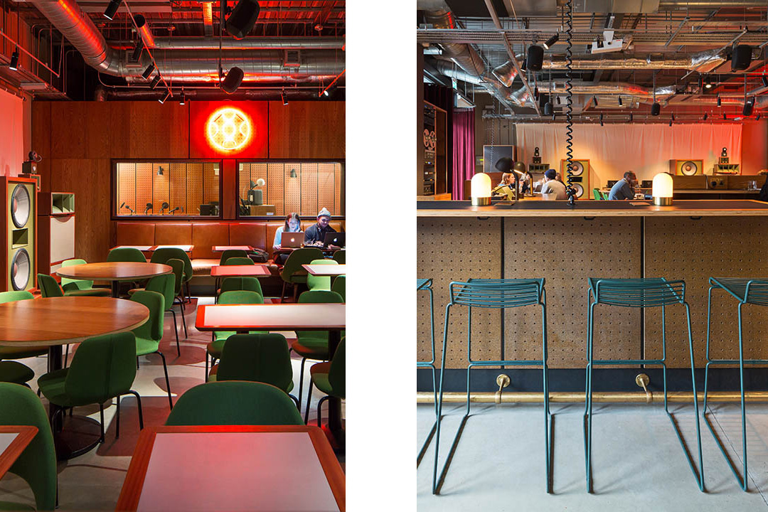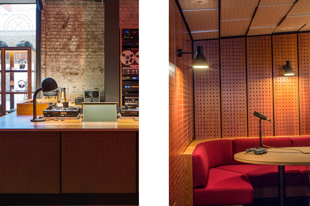 Situated in a double ground floor unit within the listed Granary Building in Kings Cross, Fraher have completed this project in collaboration with Spiritland. Spiritland is a new music brand founded in London, built around excellence in culture, curation and listening. A unique hi-fidelity, hand-built sound system delivers an unparalleled audio experience with a cultural and musical programme to match. Spiritland re-frames the bar and listening experience, delivering drinking, dining, socializing and musical enjoyment in a relaxed setting. Working with Spiritland, Fraher developed a scheme that took inspiration from the warm and atmospheric listening environments of Japanese vinyl music rooms. Imposing floor standing speakers that resemble sculptures and an informal environment that encourages music lovers to explore records and new music was the design ethos for the spaces. Every piece of joinery was designed with Spiritland and made by Shape London, our partner fabricator, providing bespoke joinery that celebrates and presents rare collector’s items as well as accessible technology to the avid listener. Comfort, precision and integrity are reflected in the use of Ash mocca, brass, concrete, red marble, linoleum and sapele faced birch plywood, to create sound studios, collectors cabinets, chef’s table, retail space and bar frontage. This unique offering spans both bar, restaurant and retail environments and includes a recording studio. Completed by an outdoor seating area made of woven timber provides a rhythmic feature which frames the entrance to the unit. Fraher provided a full RIBA service.
