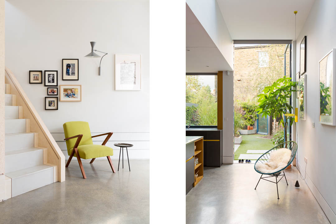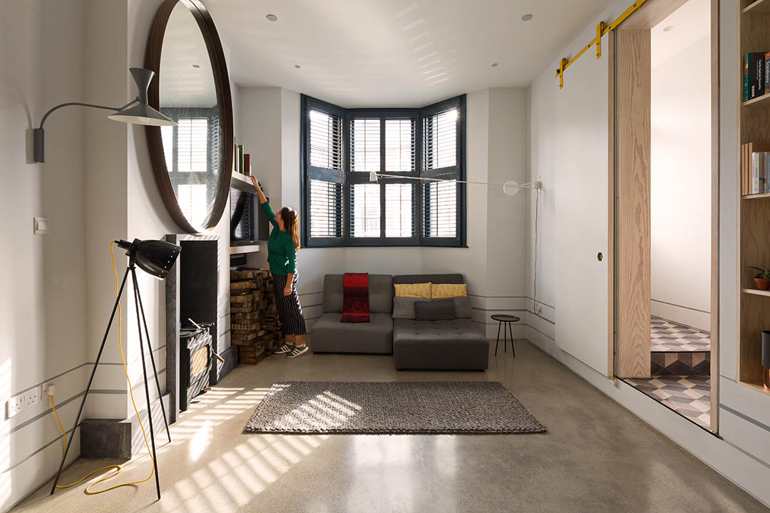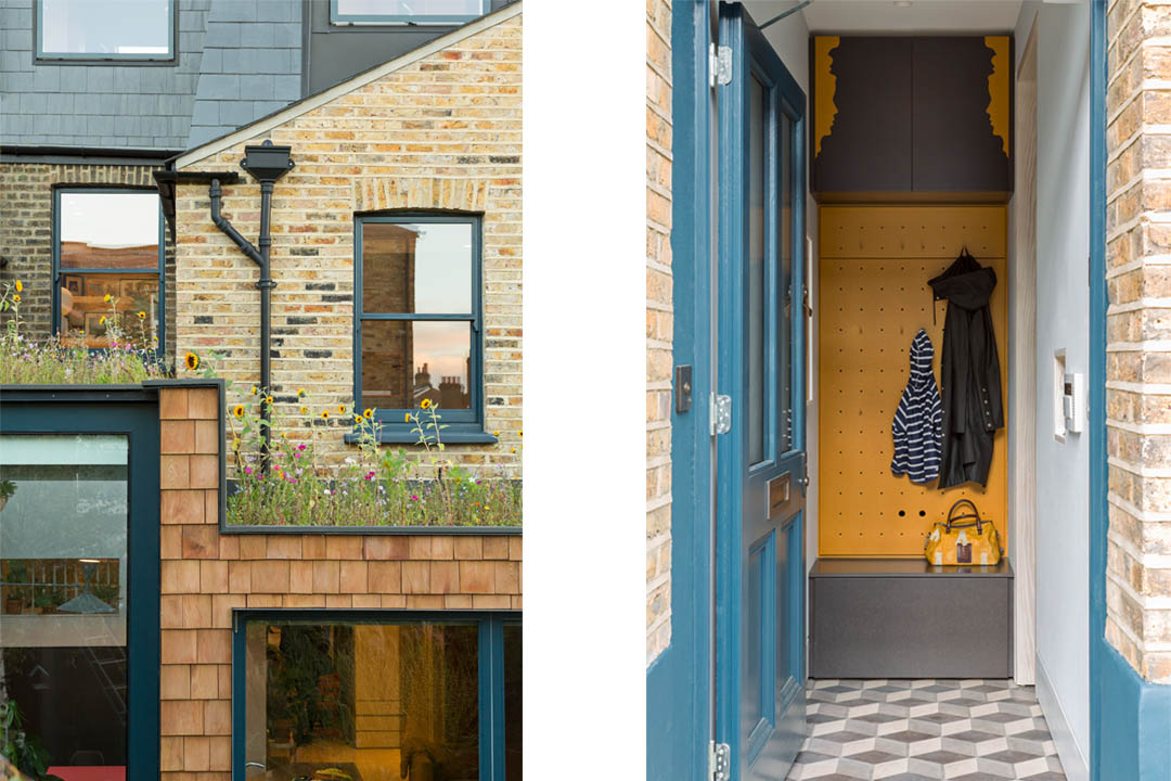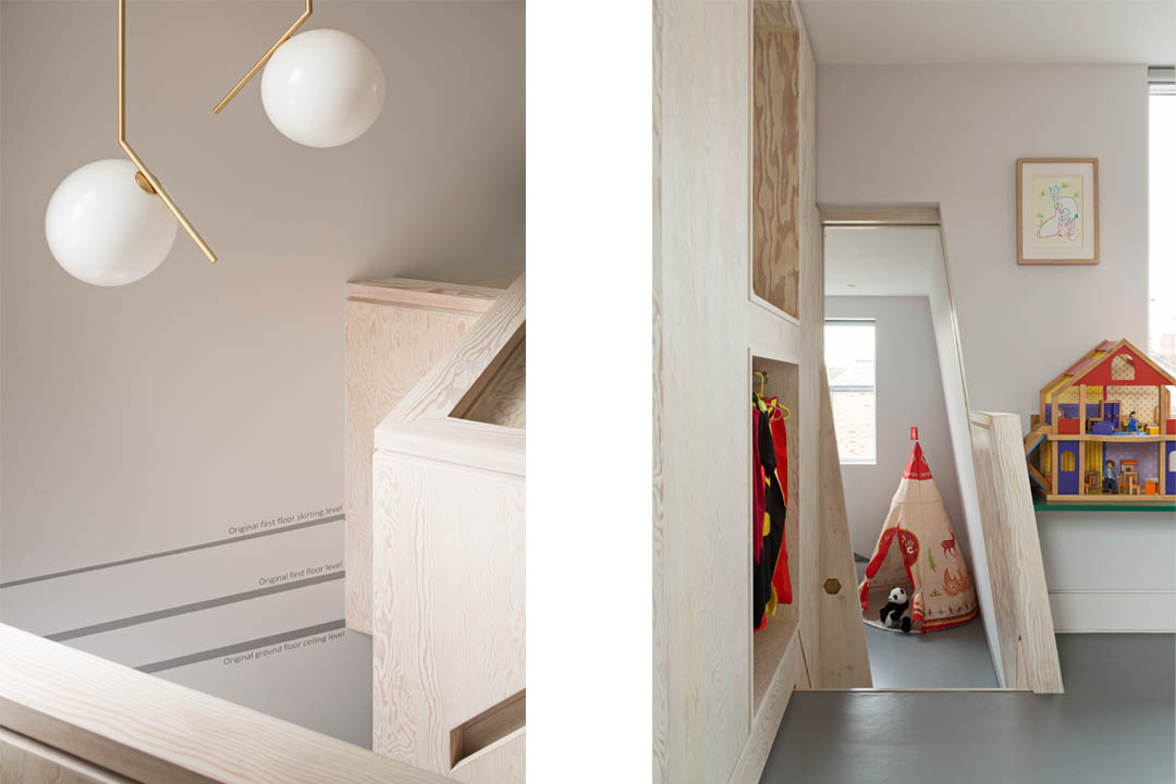 The typical terrace 2 up 2 down house layout suffers from a narrow plan form with a set of corridor like circulation spaces. Ground floor spaces are often rooms off this cellular corridor with bedrooms at first floor compromised due to the non active circulation space that runs from front to back of the building. The project looked to challenge the traditional layout by using the staircase to cut across the building. This removed the dark corridor and landing spaces and instead liberating the plan installing a CNC cut dynamic staircase with active landing study and playroom spaces. The existing internal walls, chimney breasts, staircase and floors were removed, retaining only the facade, to enable the building floor levels to be dropped to create a sunken ground floor plan that enables a generous floor to ceiling height at loft level. All new elements to the building are clad in douglas fir to create a visual legend for the building, whilst the existing walls are retained as painted plaster. Removed floor levels are traced onto the walls, whilst locations of the existing building features such as the roof, staircase and decorative plaster work is cut into the faces of the joinery. High levels of insulation, solar hot array and a wildflower roof lower the carbon footprint of the building, whilst the stripped out existing house provides firewood for the stove. The old house heats the new.