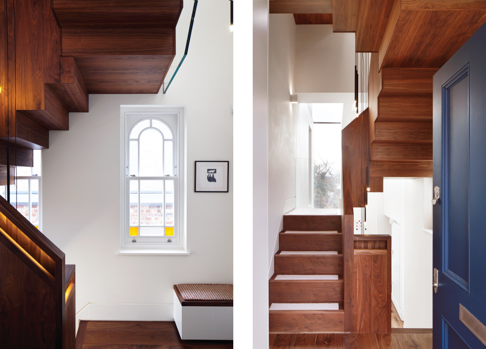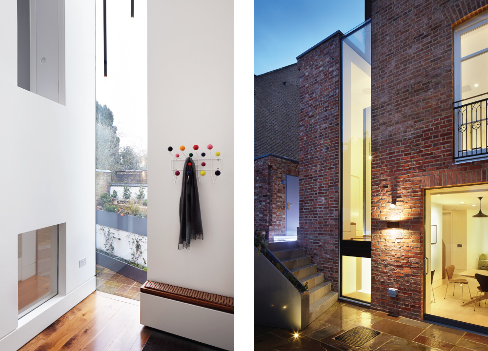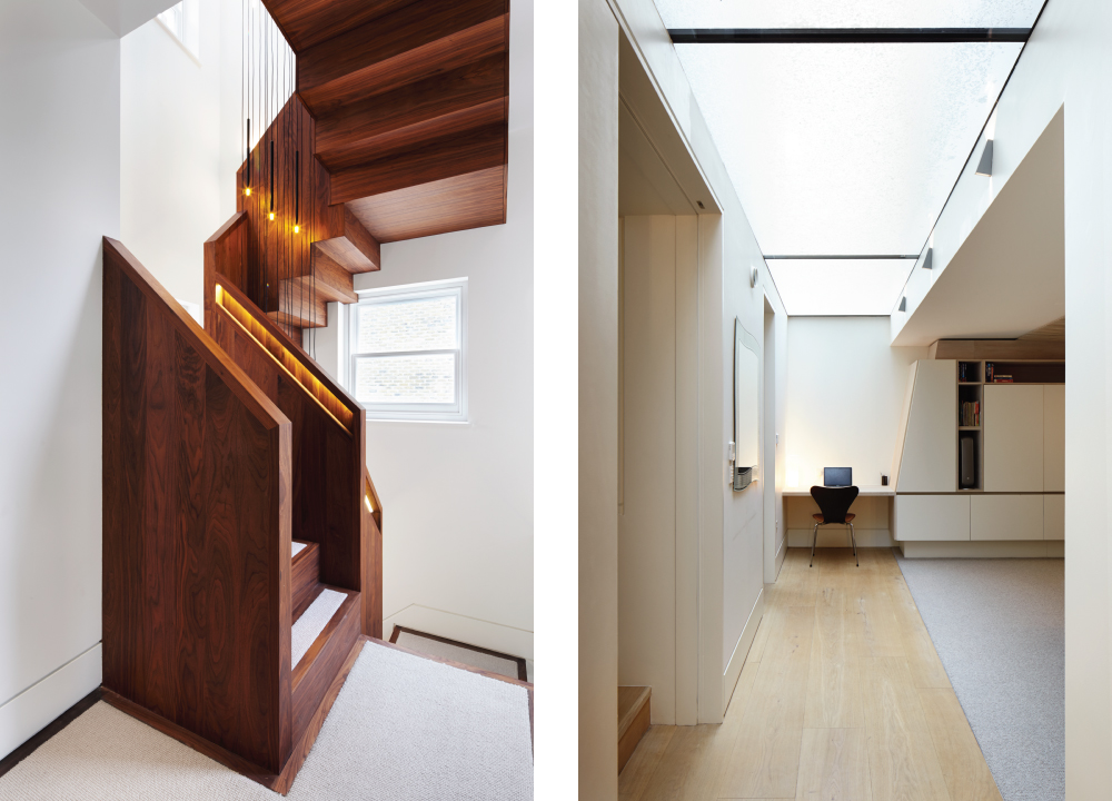‘The Lantern’ project involved the complete basement, ground and first floor extension and refurbishment of a Locally Listed Residential Building in South West London. The Client asked us to transform the existing building into a series of spaces that had a strong reference to Eastern Design influences whilst manipulating daylight and threshold conditions. A feature American Black Walnut staircase wraps itself up through the building, connecting the habitable spaces through its tree like presence. Half landings, internal openings and unusual apertures encourage the notion of creating internal courtyards of living spaces that are all strongly connected to one another. At the top of the house sits a roof top study for the client, over-looking the four storey central staircase. At the bottom of the staircase the tree like form wraps itself onto the ceiling of the basement rooms as the roots of the staircase in plywood ribbons, thus connecting this vertical building thematically as well as spatially. The planning process was complex for this building and led to months of negotiations with the local planning department eventually agreeing with a limit in place to the height of the extension. The brick cladding pays respect to the existing building, whilst be separated away from the historic fabric of the building by a glass slice. The existing building fabric has been fully insulated and taped to create an air tight building. All the joinery for the project was designed, fabricated and installed by Fraher Architect’s sister company (Fraher and Co). Fraher Architects provided a full RIBA service.