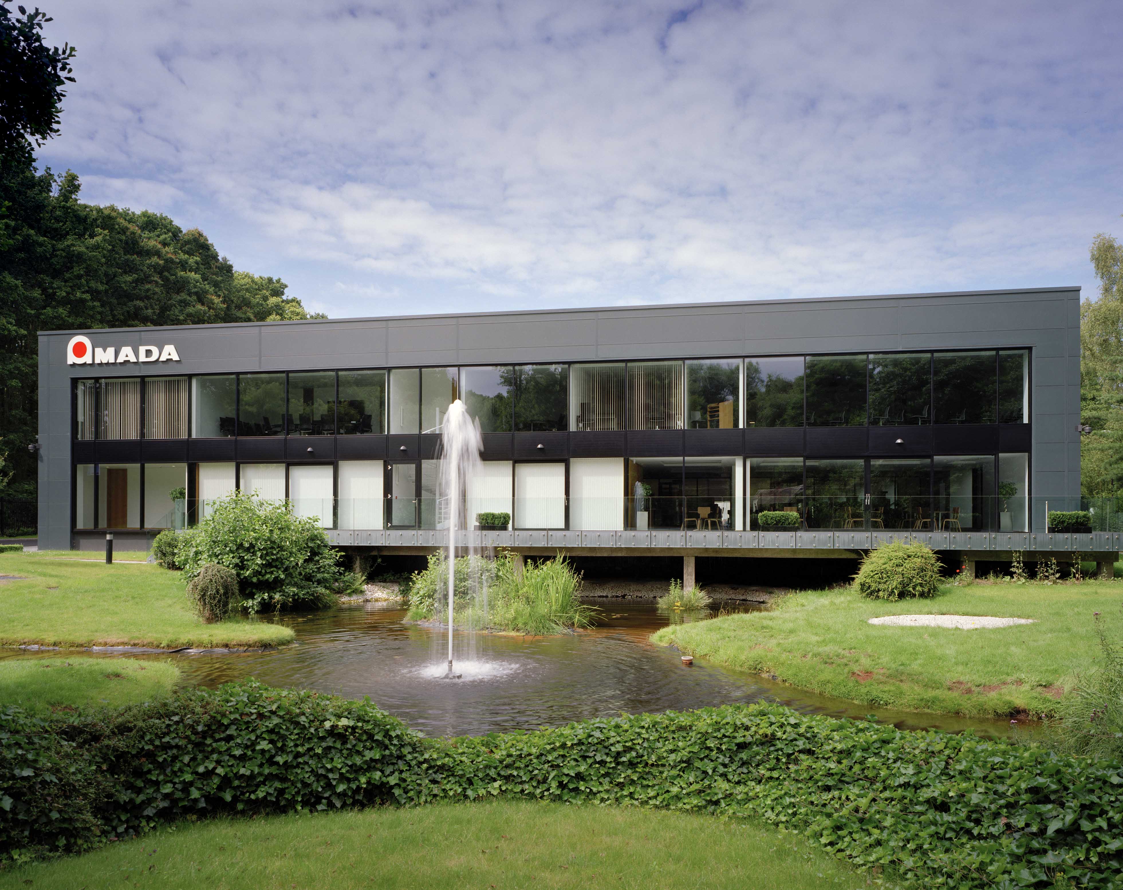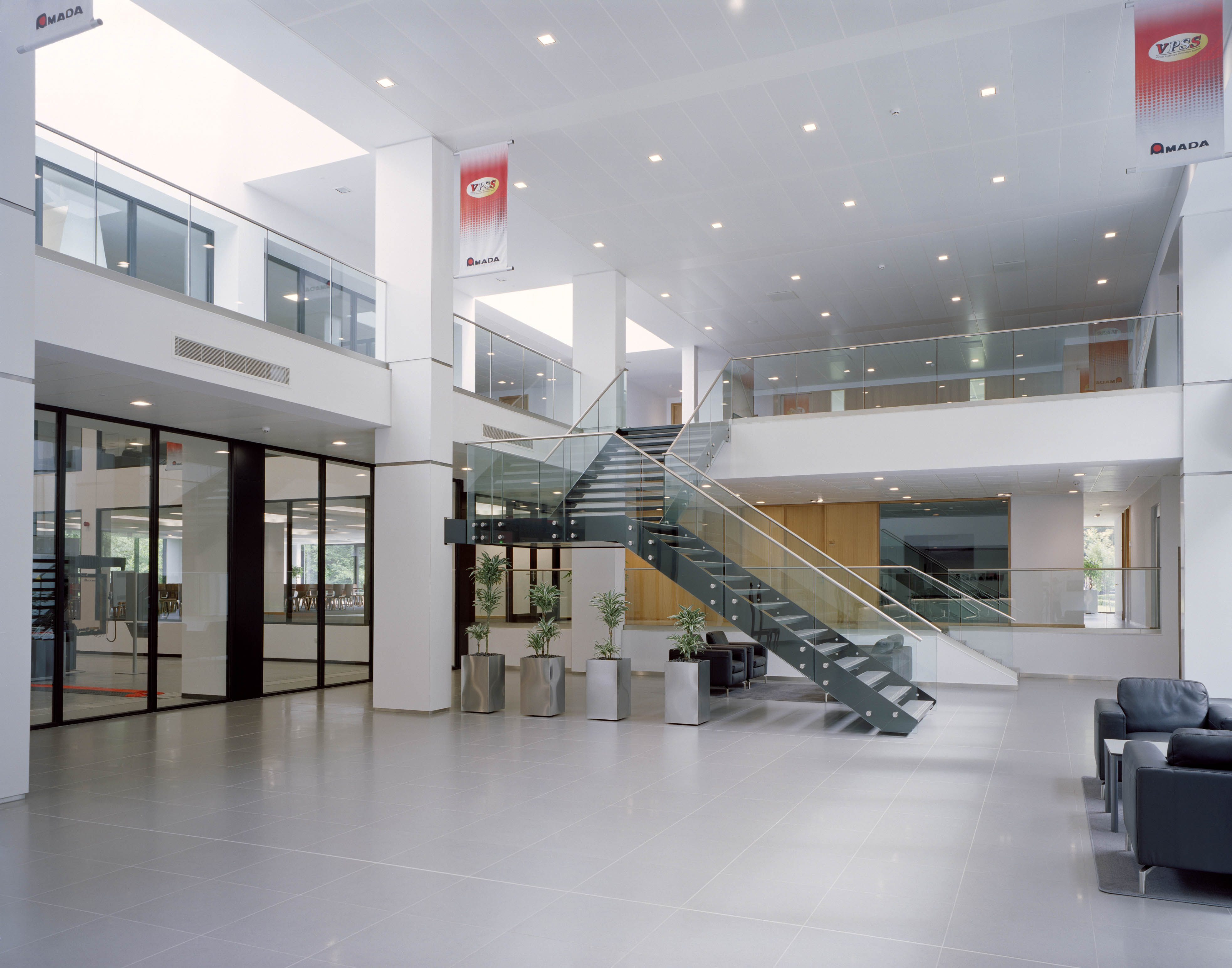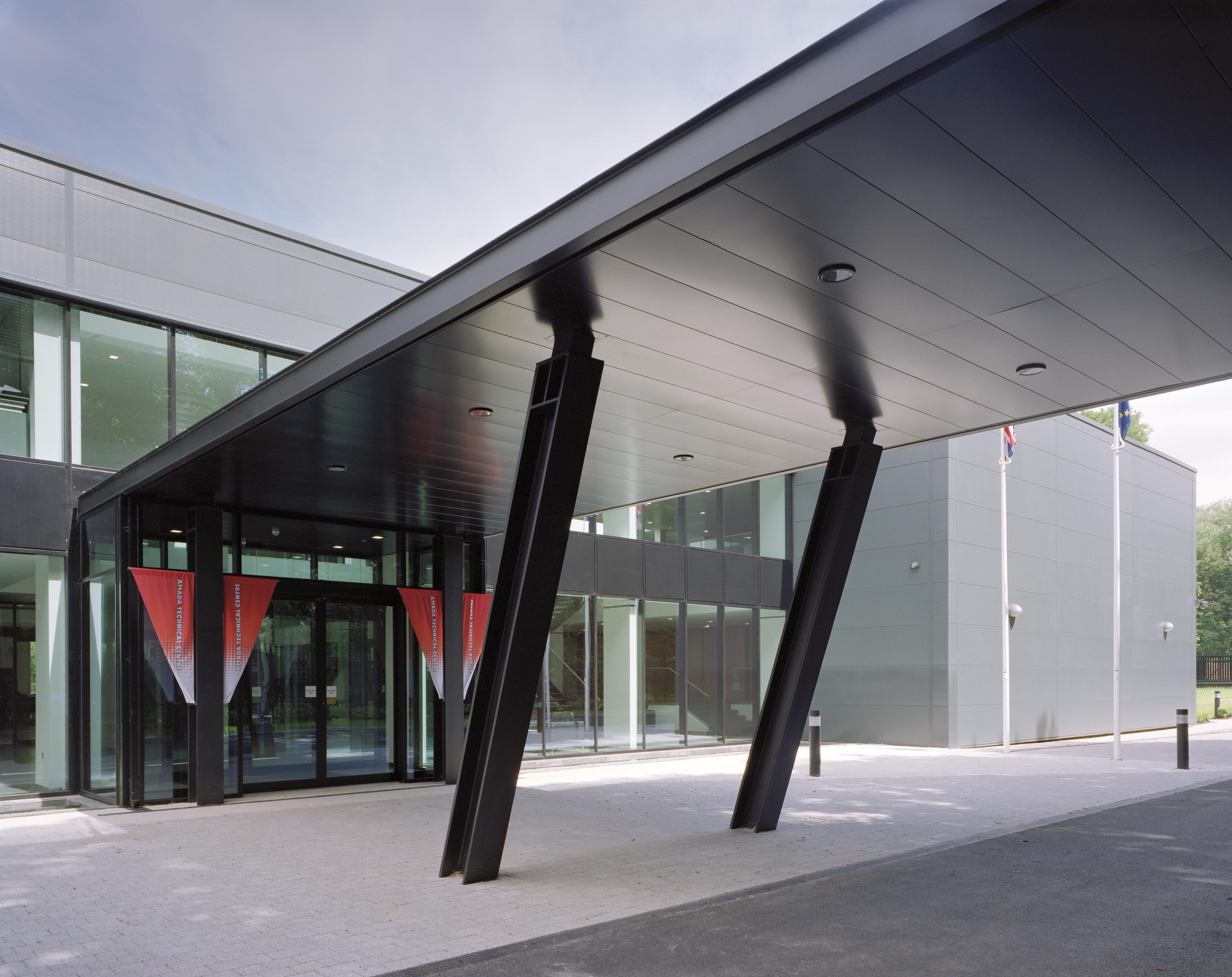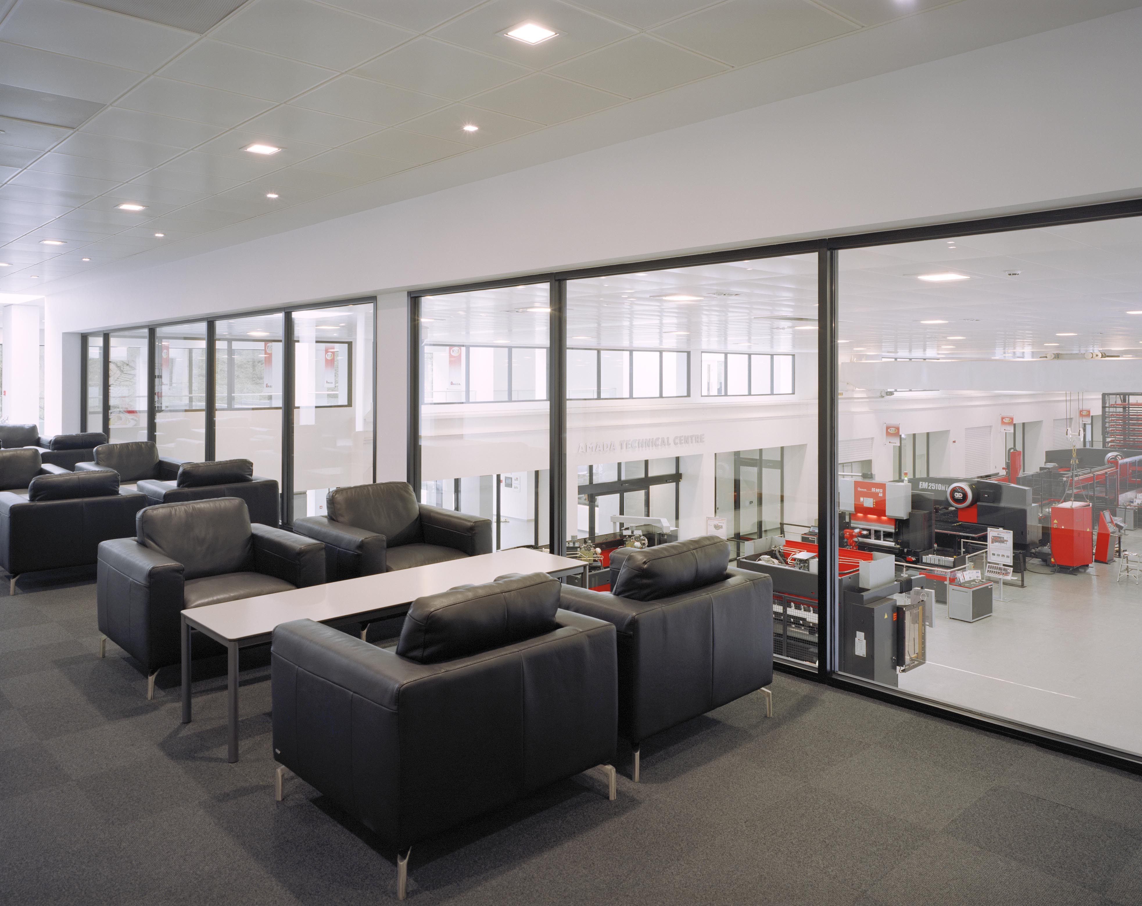 Amada UK, the British subsidiary of a global Japanese machine tool manufacturer, commissioned the refurbishment and extension of their existing headquarters building. Originally designed by Glazzard Architects in the mid-1980s, the building had remained largely unchanged since its construction. The project was driven by the need to align the building with the client’s updated corporate identity while significantly improving environmental performance and internal working conditions. The original architecture was characterised by an elaborate exposed structural steel frame, which formed a dominant visual element of the building. The revised corporate design language required a more controlled and refined interior environment, leading to complex alterations that enabled the structural framework to be fully concealed while maintaining the integrity of the existing structure. The refurbishment was undertaken in carefully managed phases to allow the building to remain operational throughout construction, ensuring business continuity while delivering a comprehensive upgrade. Location: Kidderminster Completed: 2014 Photography: Alistair Carew-Cox Client: Amada UK Type: Commercial -New Build / Retrofit