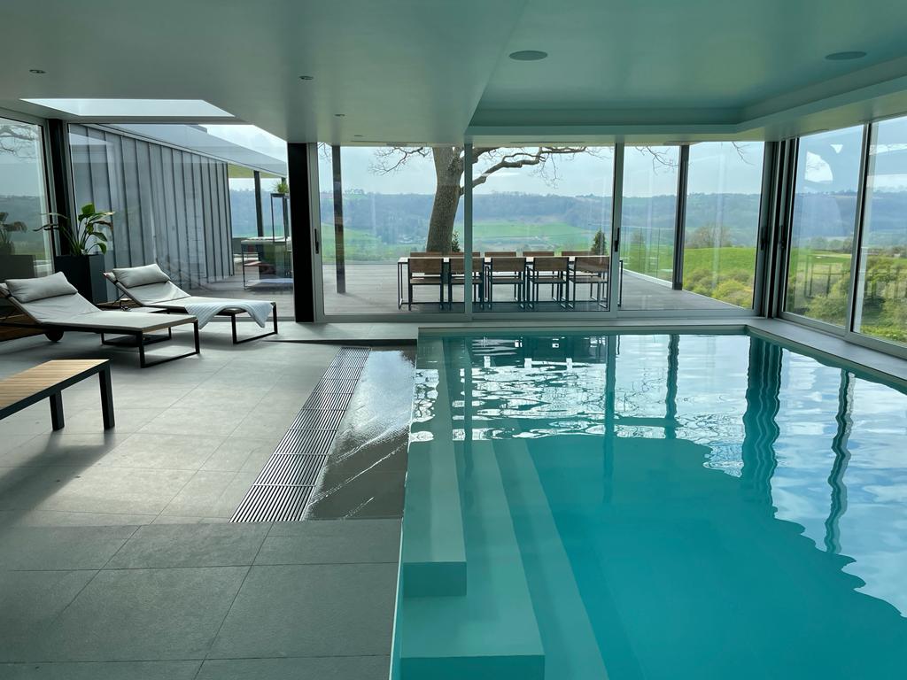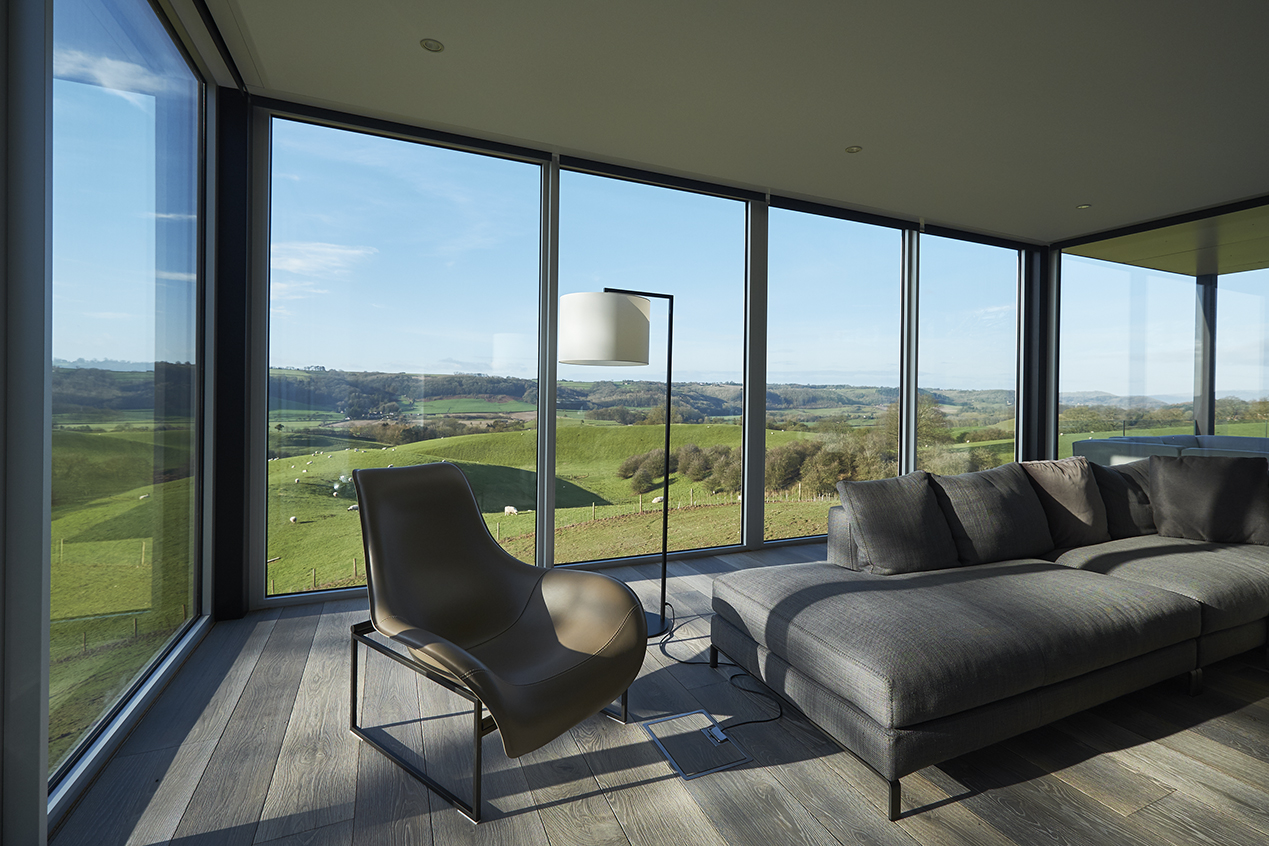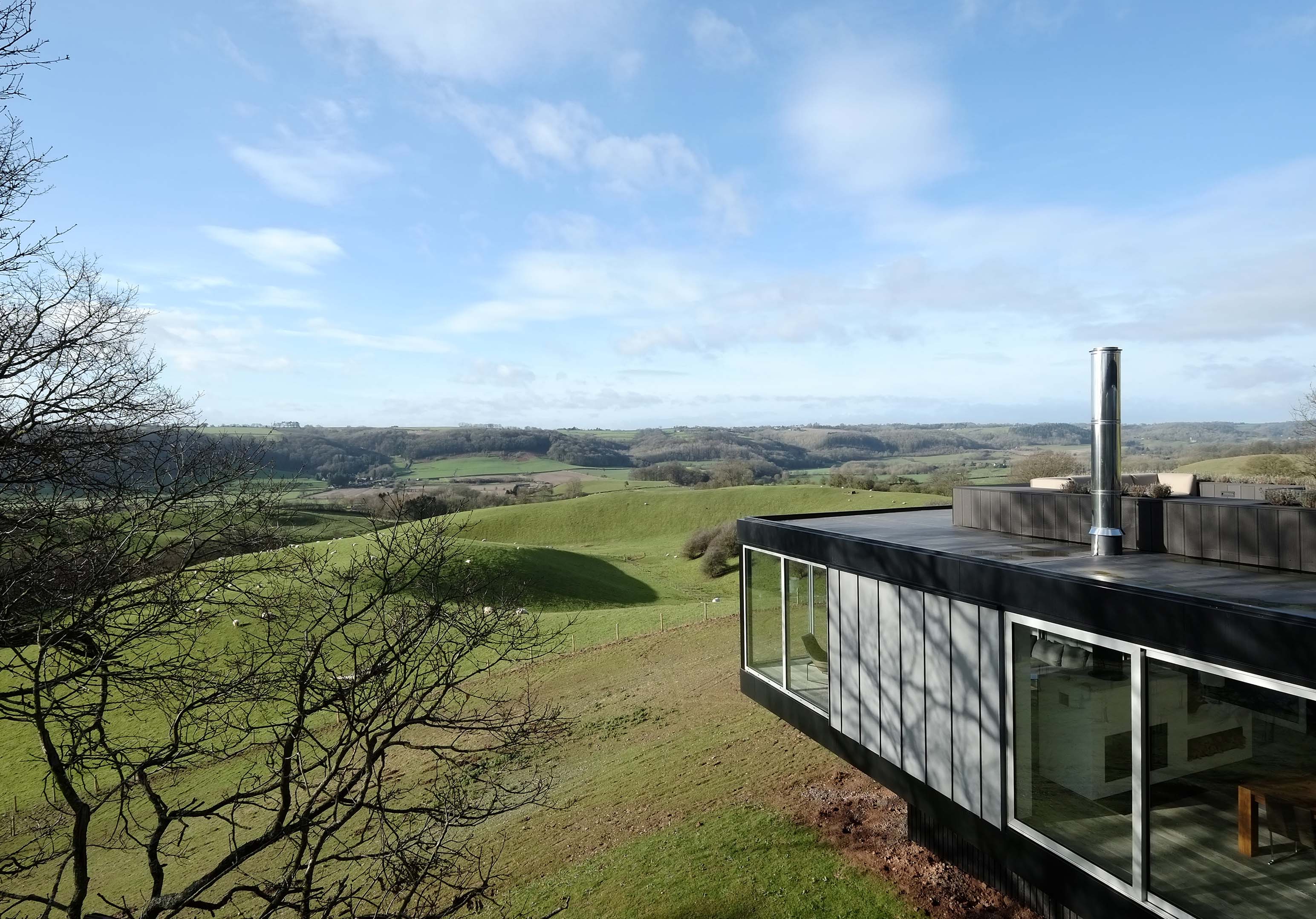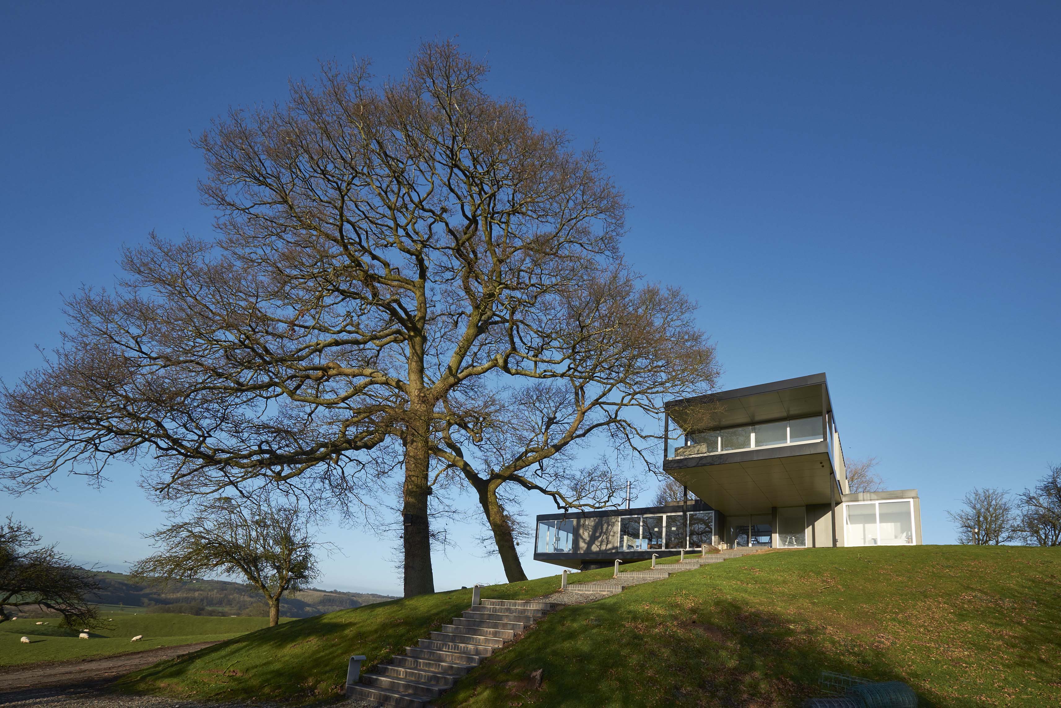 The dramatic topography of the site offered an opportunity to explore the contrast between the surrounding rolling landscape and a strong linear architectural form. Perched high on a hilltop, the house is carefully arranged to respond to its natural setting and maximise long views across the countryside. The master bedroom is positioned within a large cantilever above the main entrance. This elevated space opens onto a deep external terrace set within the canopy of mature oak trees, providing both privacy and a strong connection to the landscape. Glazed on three sides, the room captures early morning light while framing expansive views across the valley. The orientation of the house responds to the movement of the sun across the site. Mature oak trees along the southern boundary provide natural shading to the kitchen and dining spaces, allowing filtered daylight to illuminate the interiors throughout the day. To the west, a generous external terrace forms an outdoor living space, complete with a sunken hot tub and seating area. Positioned to overlook the valley, the terrace takes full advantage of the evening sun and the dramatic setting of the site. Location: Shelsley Beauchamp Completed: 2016 Photography: Alan Miller Client: Private Type: Residential - New Build