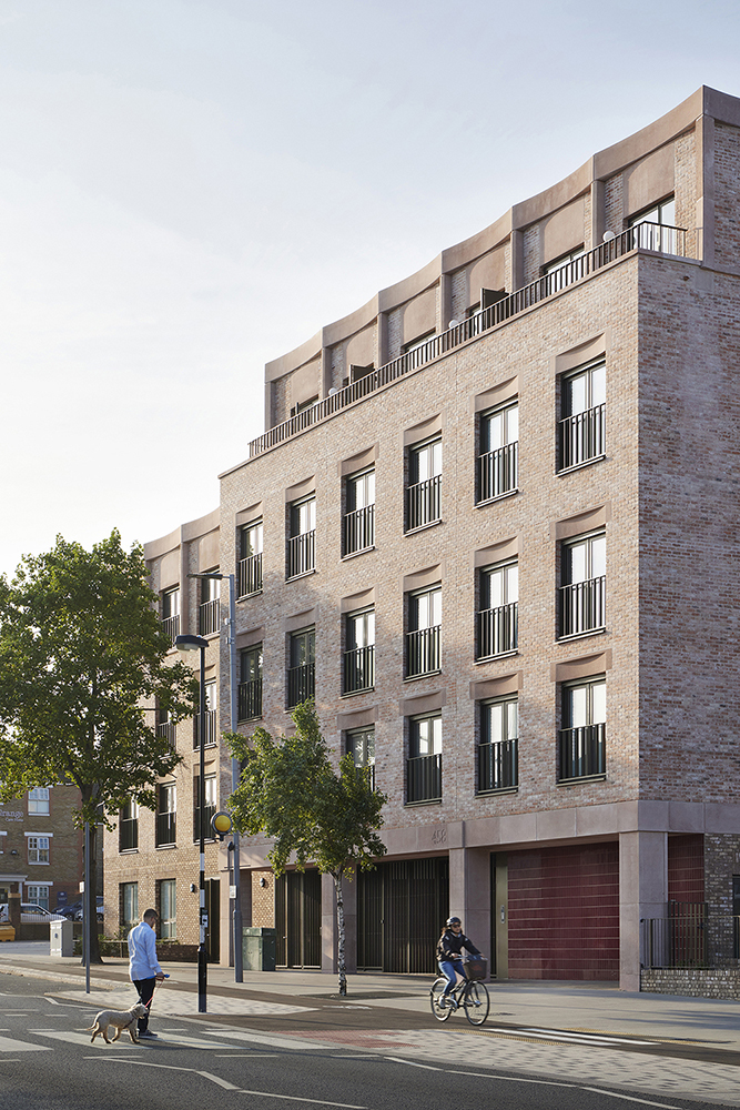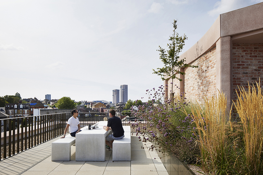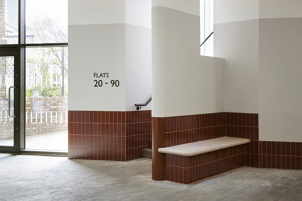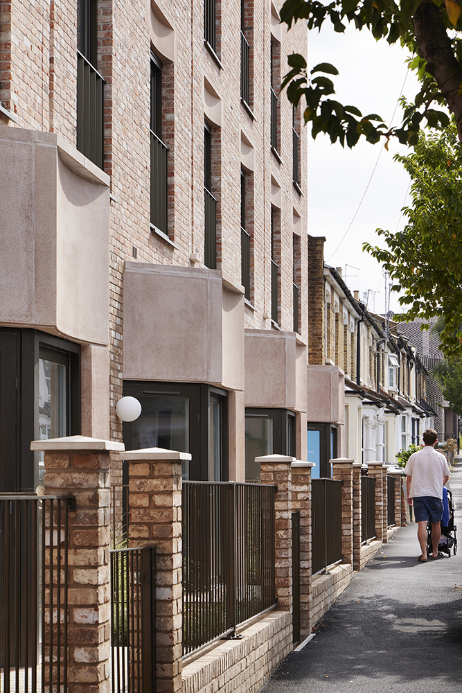 Forest Road provides 90 affordable one-bedroom homes for local first-time buyers in Walthamstow, on a prominent site opposite Lloyd Park and the William Morris Gallery — the Grade II* listed former home of the Arts and Crafts activist. The building is designed by Gort Scott for Pocket Living. The triangular site has contrasting contexts, with two-storey Victorian terraced houses lining streets on two sides and the arterial Forest Road as its main frontage. The scheme sensitively negotiates these differing characters with a sculpted massing that steps up from three to five storeys on Forest Road, reinstating active frontages on all sides that were part of the historic urban grain. Communal spaces have been thoughtfully integrated into the design to foster a sense of community and wellbeing among residents. Shared spaces include two roof terraces with views of Lloyd Park and a south-facing communal courtyard. Gort Scott evolved the language of brick and precast concrete decorative details first developed at nearby Gainsford Road (Gort Scott for Pocket Living, completed 2018, Locally Listed 2024), maintaining visual continuity across the two schemes to create a relatable identity.