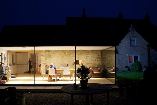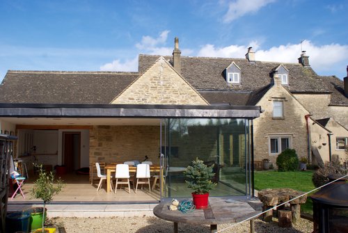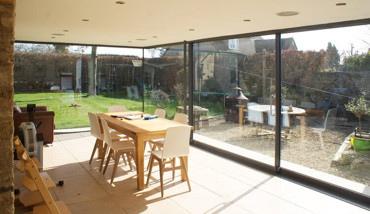 Blueboys House, Minchinhampton, near Stroud, is a Grade-II Listed historic Cotswold house. The project added a stunning contemporary glass extension to the traditional natural Cotswold stone. Simple and carefully crafted details create a timeless elegance. Thin framed sliding glass doors with a glass to glass detail at the corner open the space to the garden, with a seamless threshold between the inside and the outside. The design also includes a single slim steel post to maximise views from the new kitchen dining space. The sustainable design included high performance double glazed doors help to retain heat, while underfloor heating provides year round comfort. The elegance and lightness of the extension complements the original natural stone walls. This creates an interplay between old and new, with a daylight filled new living space attached to the more intimate and cosy spaces within the original traditional Cotswold house.