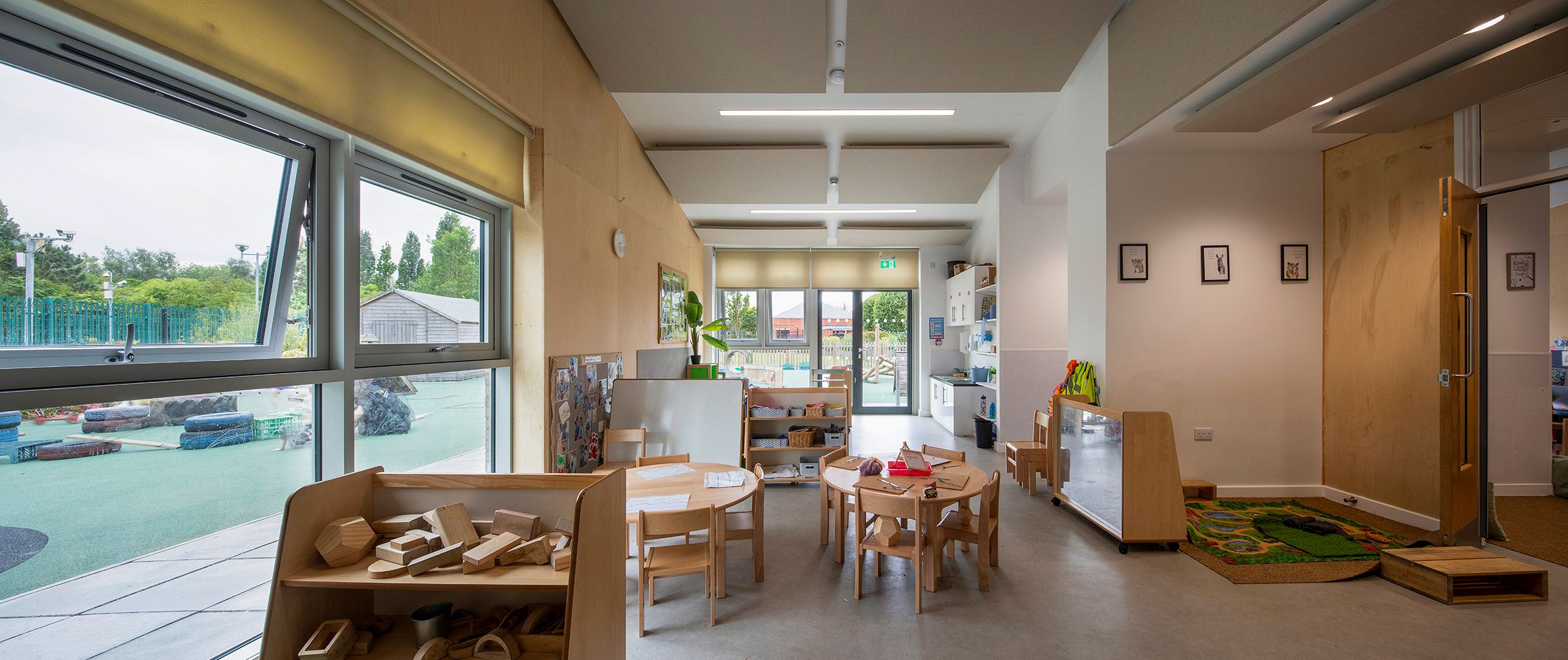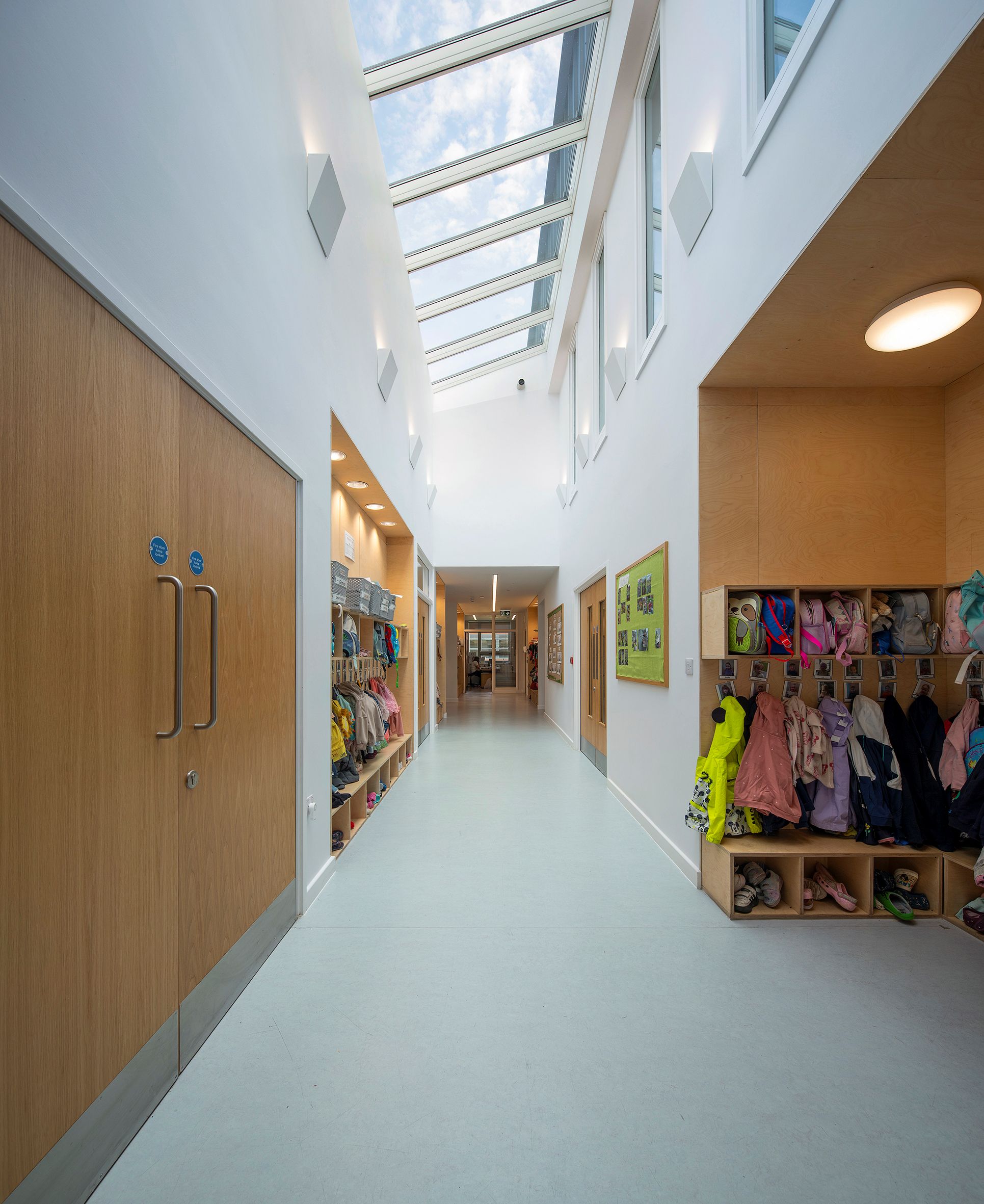 The simple yet distinctive buff clay building creates a welcoming image with pitched roofs forming a building of both domestic scale and civic presence. Internally, the spaces are friendly, un-institutional, light and inviting, designed from child’s eye level.