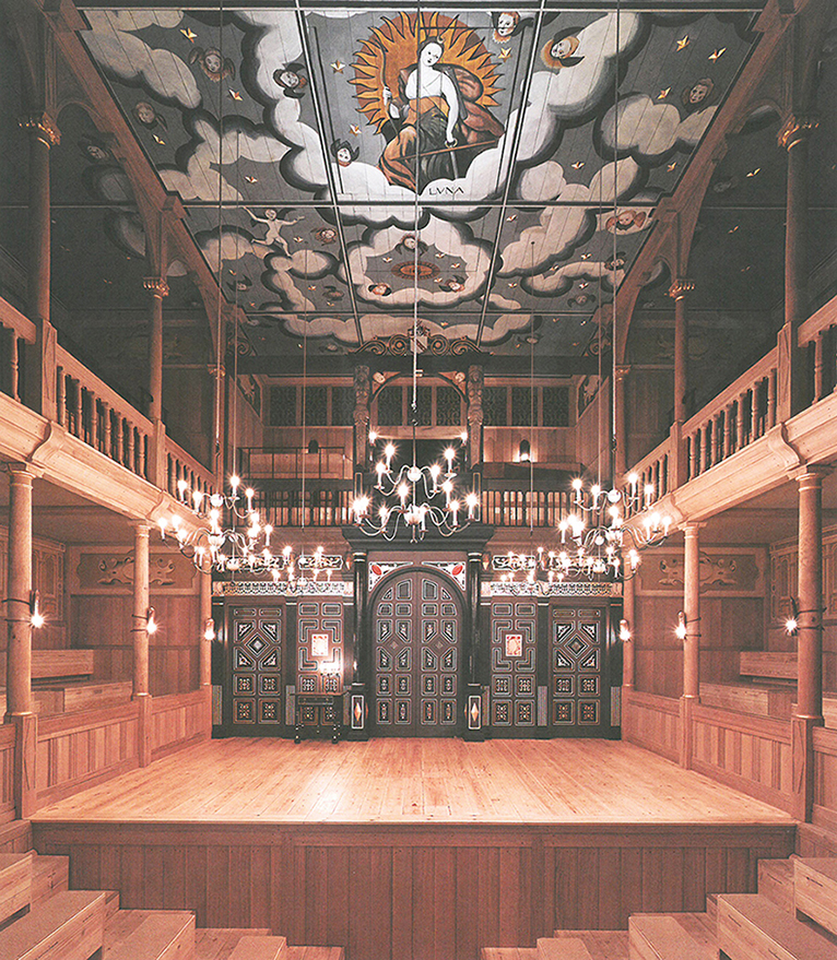 It had always been the intention to build a small (350 seat), indoor auditorium as part of the Shakespeare’s Globe complex, but it was not until 15 years after the opening of the Globe Theatre that the Sam Wanamaker Playhouse project was started. Intended as a representation of the Blackfriars Theatre, used by Shakespeare’s company in the early seventeenth century, it is a foil to the much larger open air Globe. Greenfield’s focus was on the auditorium design, which fitted inside a pre-existing shell that had been built in the first phase but used as a rehearsal studio in the interim. Taking the role of ‘reconstruction architect’ and working with scholars and specialists, particularly Professor Martin White and Peter McCurdy of historic timber frame company McCurdy and Co, a reconstruction of an indoor Jacobean private playhouse was created. The oak frame galleries, together with ceilings and walls decorated with exuberant paint and gold leaf decoration, and plays performed by candlelight, have resulted in a unique addition to London’s theatre scene. It opened in January 2014 with ‘The Dutchess of Malfi’ and Gemma Arterton playing the title role. It has also become a celebrated venue for early music. Shakespeare’s Globe McCurdy & Co SPAB Review