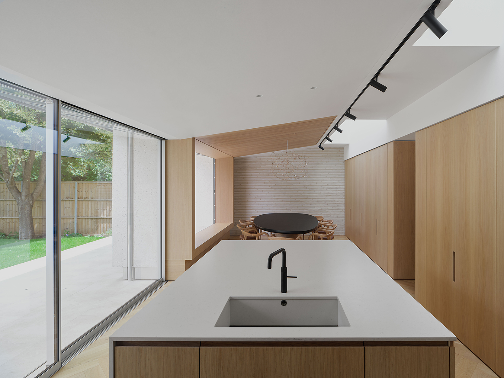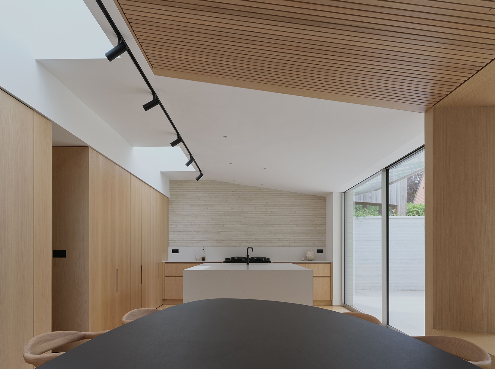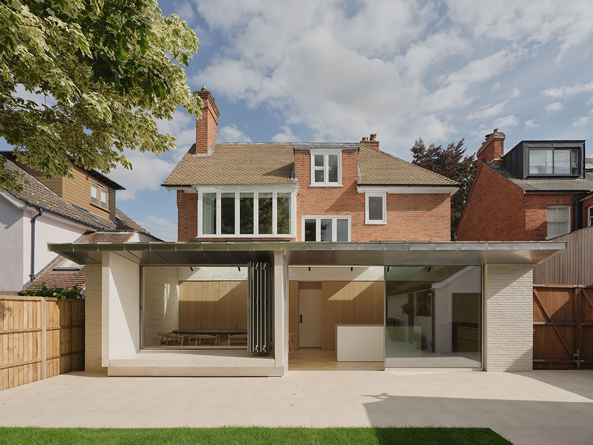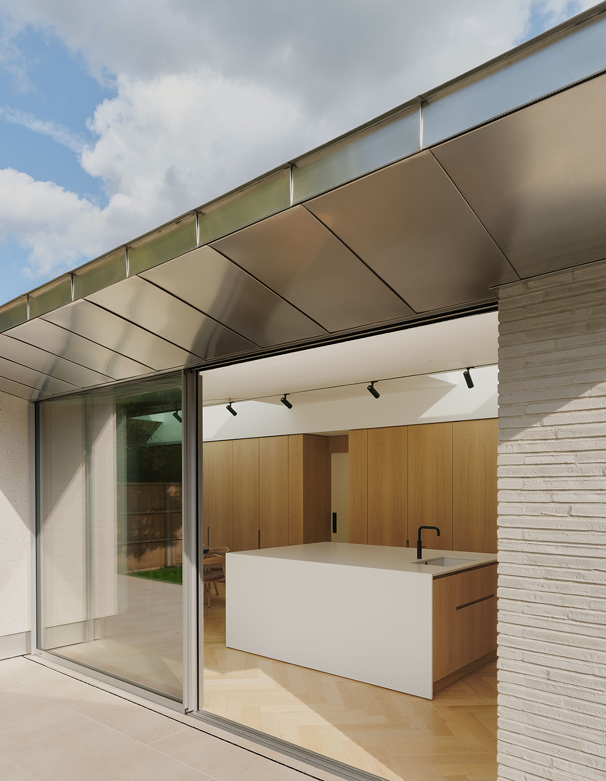 Set within the Henley-on-Thames Conservation Area, Baywing House was conceived as much more than a simple rear extension. Our brief was to deliver an addition that would be rich in materiality, filled with natural light, and functionally seamless—an elegant architectural response that both complements and elevates the existing villa. The result a refined, sculptural form—its shimmering aluminium roof, subtly reminiscent of an airplane wing, gently slopes towards the garden, providing shelter and shade via a generous overhang. Rooflights are positioned tight to the original structure, drawing daylight deep into the heart of the plan. Internally, the new spaces unfold across the rear of the house in a sequence designed for modern living: cooking, dining, and relaxation areas flow effortlessly together. Bespoke full-height joinery conceals a luxurious contemporary kitchen—with all storage and appliances discreetly hidden behind seamless fronts—and also includes a secret passage through to a refurbished snug and children’s playroom. The wing rests on a polished concrete bay oriented to catch the evening light. Deep window seats flank sliding-folding doors, which open wide to dissolve the boundary between inside and out. For the concrete, a bespoke mix was developed using White Dolomite aggregate, carefully paired with white handmade Danish bricks to create a coherent material language inside and out. A new first-floor bay above increases light and space in the master bedroom, helping to rebalance the rear elevation without requiring substantial alterations to the existing upper floors. At the heart of the new dining area, a sculpted oak window seat and slatted ceiling with concealed lighting frame a striking cloud chandelier. The centrepiece: a bespoke, pebble-shaped dining table designed for both intimacy and occasion—narrow enough at one end for dinners à deux, broad enough at the other to host twelve. All joinery, including the table, was exquisitely crafted in collaboration with Joe Mellows Furniture. The kitchen is arranged around the clients’ cherished reconditioned Aga, now reimagined within a sleek, contemporary setting. Every element was tailored to achieve the clients’ wish for thoughtful organisation: full-height cupboards with pocket doors hide a coffee station, larder, fridge-freezer, and even a mirrored bar. Folding screens match the joinery, allowing the snug to be either revealed or discreetly tucked away. Baywing House is a celebration of careful craftsmanship, contextual sensitivity, and considered design—a quietly transformative addition that brings balance, light, and enduring elegance to a much-loved family home.