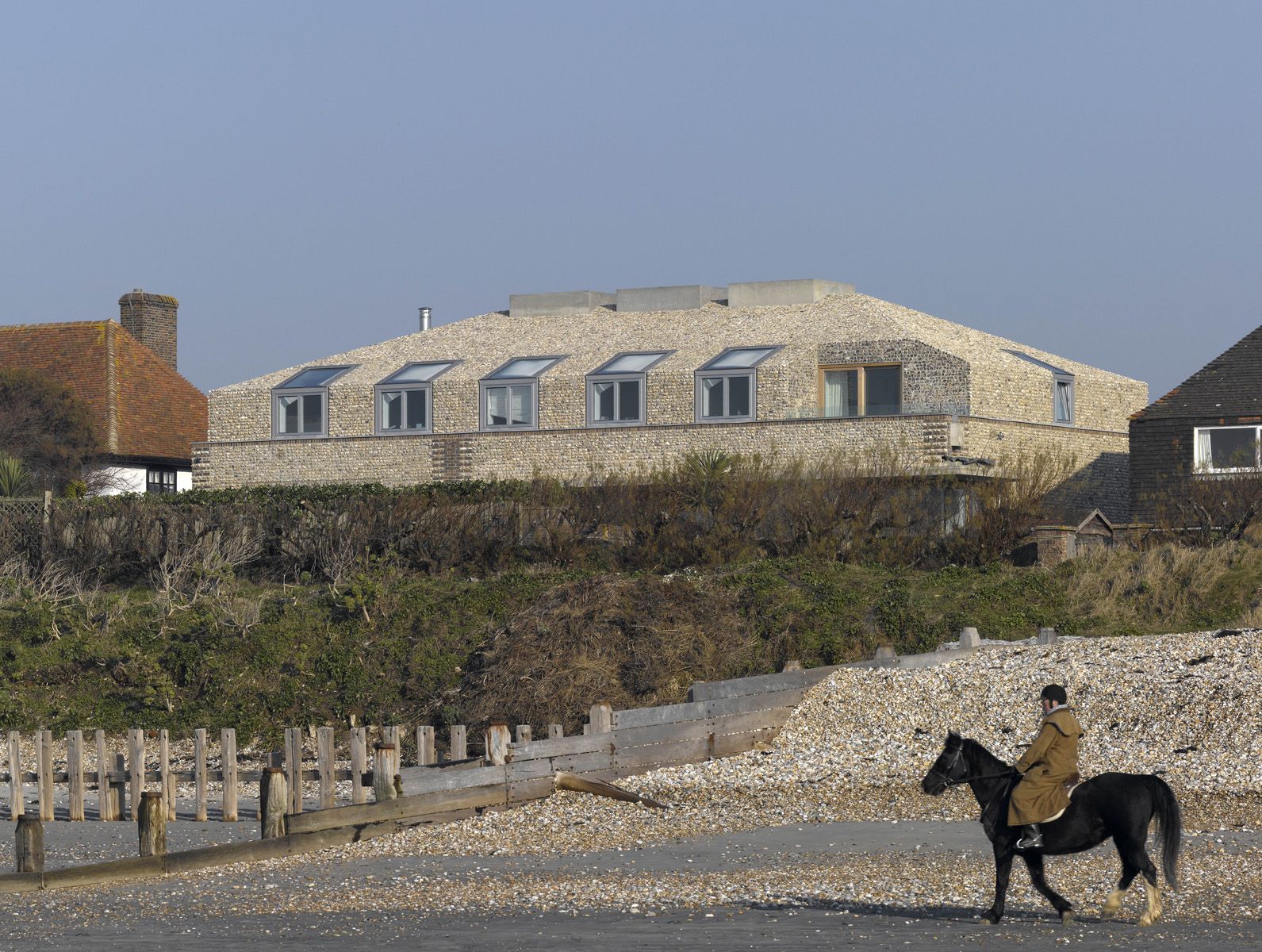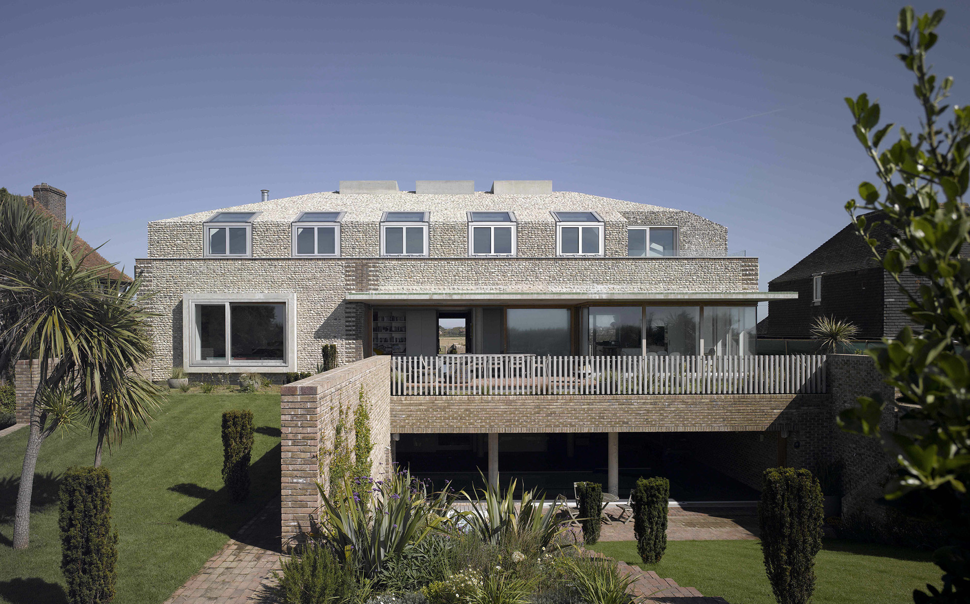 This RIBA Regional Award-winning home in Chichester, West Sussex, replaces a dilapidated 1950s house with a striking modern design perfectly suited to its exposed coastal setting. Positioned between the sea and the South Downs, the two-storey residence is clad entirely in pale grey knapped flint, creating a sense of permanence and harmony with the landscape. Constructed from reinforced concrete with high thermal efficiency, the home combines sustainability, solidity, and elegance. Its landscaped plinth, refined detailing, and connection to the outdoors make it an architectural landmark that embodies modern coastal living and enduring family design excellence.