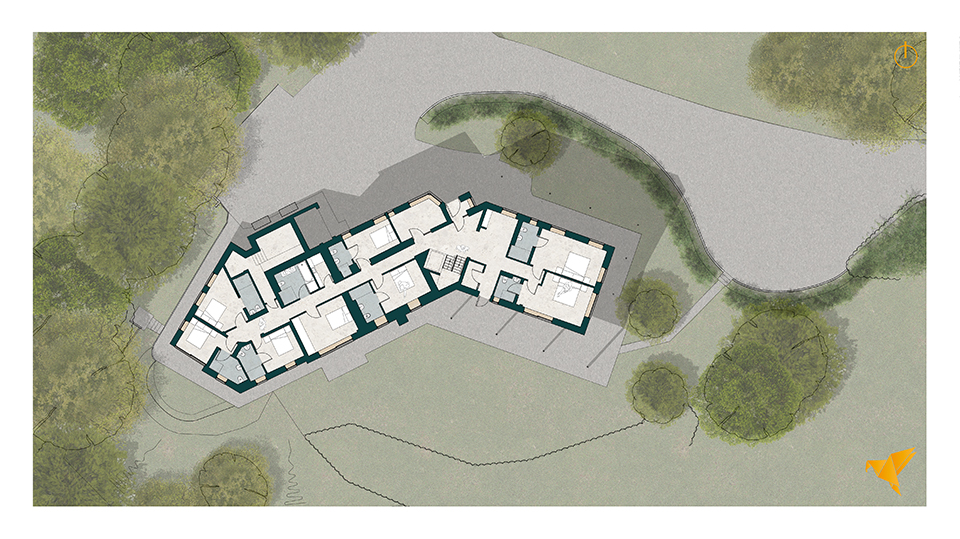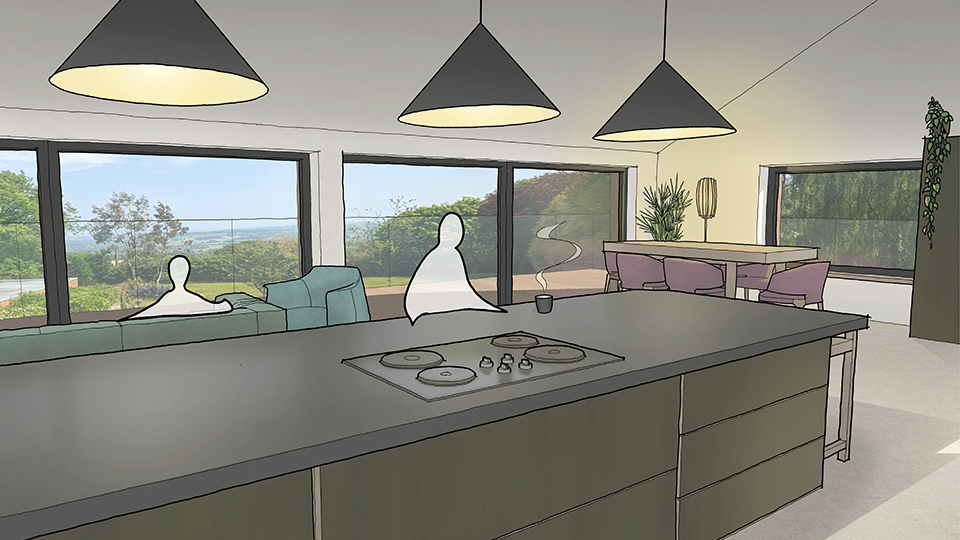 We have provided full architectural services for a radical retrofit project in North Somerset. The client wanted to turn a property which had been converted into two flats back into one house. Their aim was to enhance the property with natural materials and sustainable systems, whilst cutting down on construction waste. The changes to the building were designed to take advantage of the spectacular views across the countryside, to enact thermal and building performance improvements, and to alter the building and install facilities for better accessibility. The property has been reimagined with all of the sleeping accommodation at ground floor, including fully wheelchair accessible bedrooms, and adaptable rooms. Living accommodation has been moved fully to the first floor with large structural changes made to open the main kitchen dining room out for a larger living space. A new balcony and large glazed doors have been designed to connect this space directly to the surrounding countryside. The building has been improved with internal wood fibre insulation, airtightness improvements, new windows, and ASHP and UFH system within a limecrete floor, MVHR through the property, and a large standing seam solar panel roof. Completion is expected early 2026.
