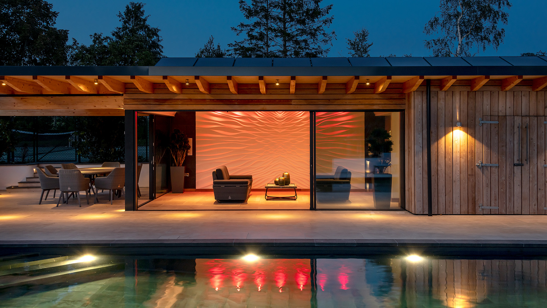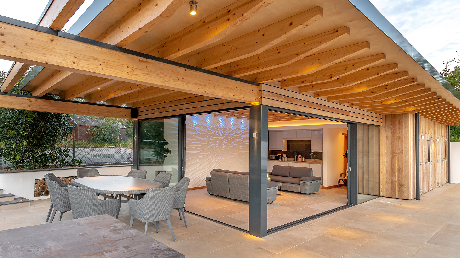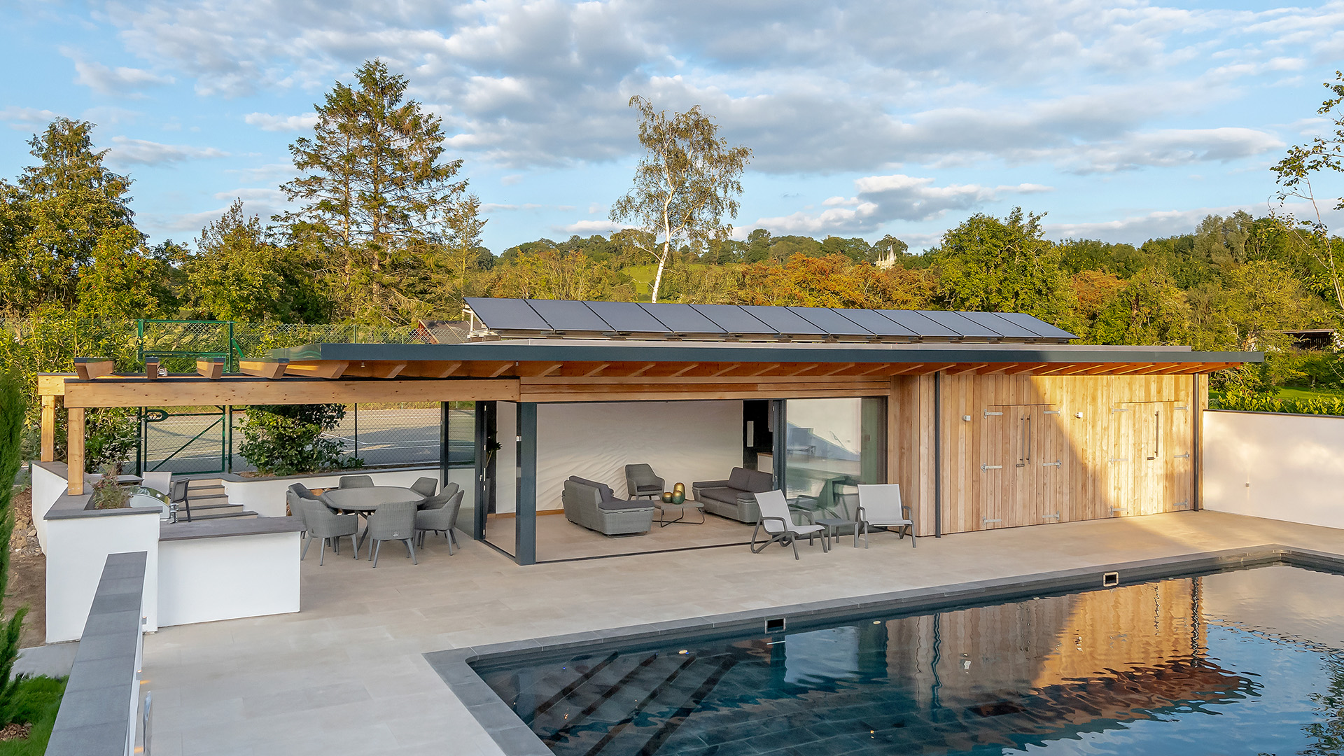 A new poolside pavilion and walled courtyard, near Glastonbury enhance a Somerset swimming pool which was renovated to provide a beautiful environment for outdoor freshwater swimming. We provided full architectural services to see this project through from inception to completion. We unlocked the potential of an existing run-down indoor pool in the clients’ garden and obtained planning approval for its transformation into a beautifully landscaped swimmers’ paradise. A large entertaining space seamlessly flows outside through wide sliding glazed doors. Extended eaves around the building cover an external dining area and integrated barbecue facilities in addition to providing solar shading to the building.