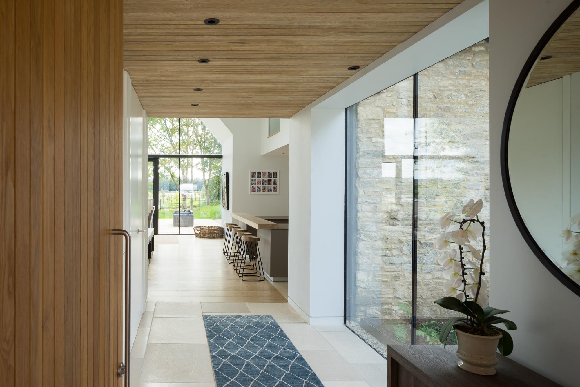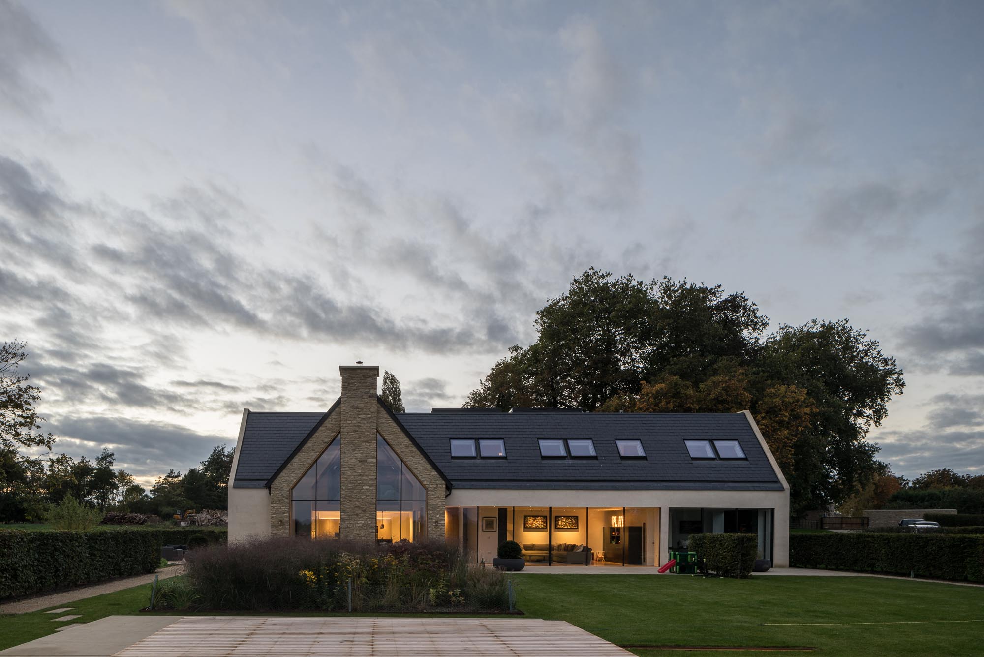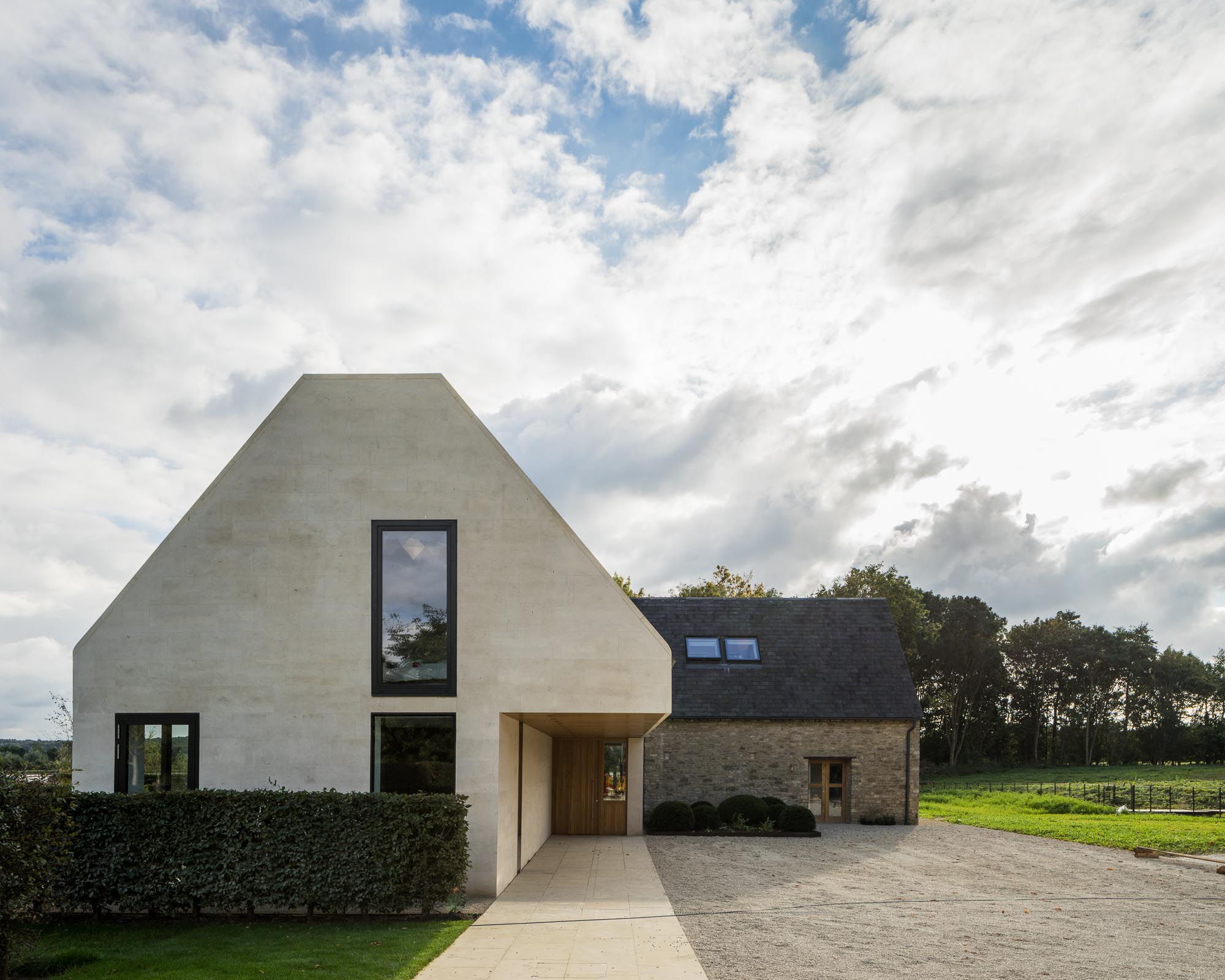 Doomsday Barn is a sensitively extended and refurbished 19th century barn in Oxfordshire’s Green Belt and part of a small holding mentioned in the Doomsday book, to form a modern 5-bed family home. The original barn and new steel framed extension intersect to form a double height living space with striking views across the gardens to the adjacent lake. The family bedrooms, study and playroom are accommodated in the new extension, whilst the kitchen, boot and spare room, with gallery to the living space, are in the wing of the original barn. The intersection of new and old is clearly expressed in the detailing internally and externally, with Oolitic limestone to original and new walls with a contrasting finish. As would be expected from a 19th Century farm structure, the existing building fabric suffered significant heat loss and air permeability problems. Despite its classification as an existing dwelling, all existing thermal elements of the Barn were upgraded, designed to exceed the thermal performance requirements of new dwellings. with WGP Architects