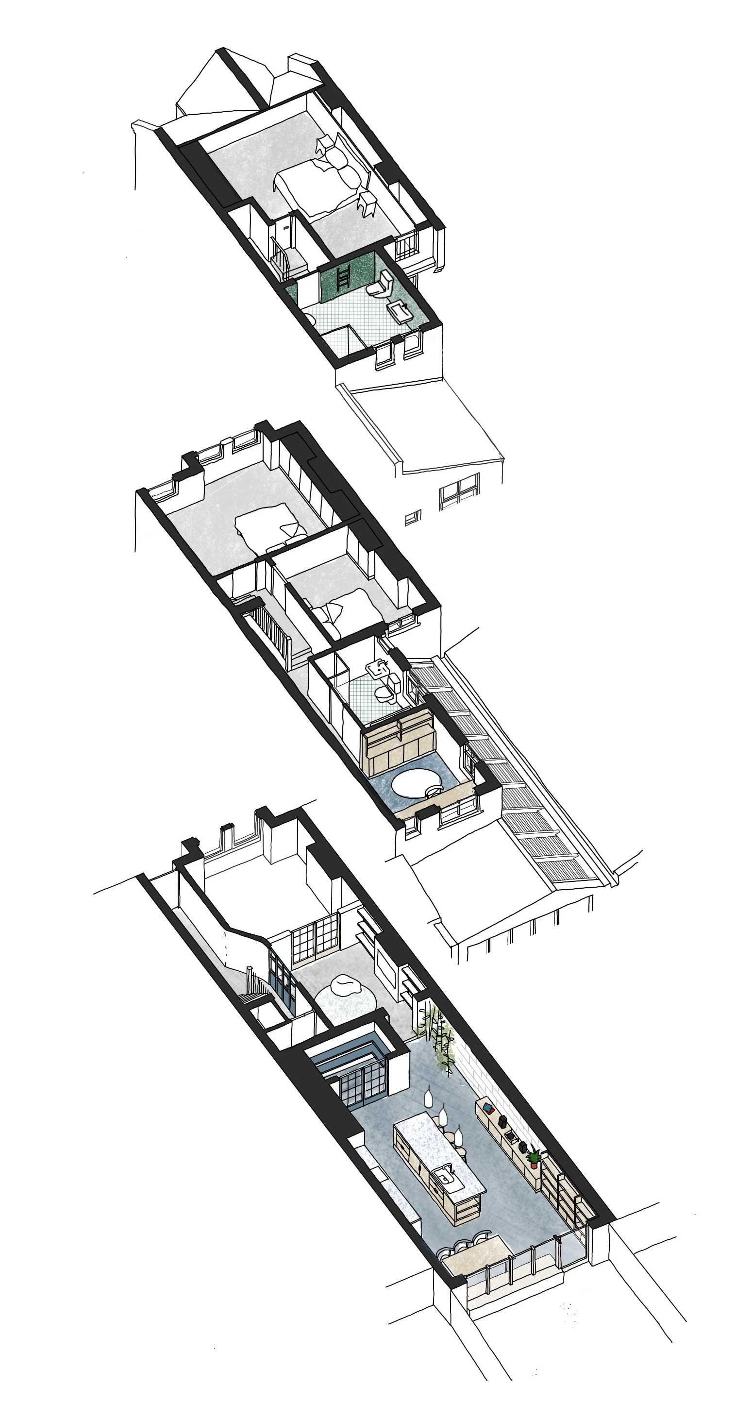 Commencing on site in spring 2023, this project on the Shepherd's Bush, Chiswick border is a whole house refurbishment, making use of dead spaces within the original plan of the Victorian Terraced House. The entirety of the house will be renovated along with a new loft master suite and remodelling of the ground floor plan - extending out to the rear of the property and the side return. The new ground floor plan makes use of the existing layout, keeping the separate living nook at the front of the property with a new double door entry way. The new side return extension provides a new route into the kitchen and dining space to the rear of the property. Locating the WC and Pantry at the centre of the plan allows for a bright and open kitchen / dining space, making use of the darkest spaces of the home for services. By creating a new entryway to the kitchen through the new side return extension, a grander entrance to the rear will be achieved, with new roof lights spanning the entirety of the side return flooding the space with sunlight throughout the day. Pushing the dining area towards the back of the property has allowed for a large kitchen and entertaining space. The internal layout of the scheme has influenced the treatment of the rear elevation. With a new large window bench seat, providing seating both inside and out, making use of the threshold between the dining space and the garden.
