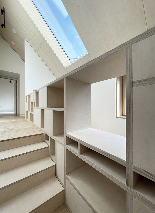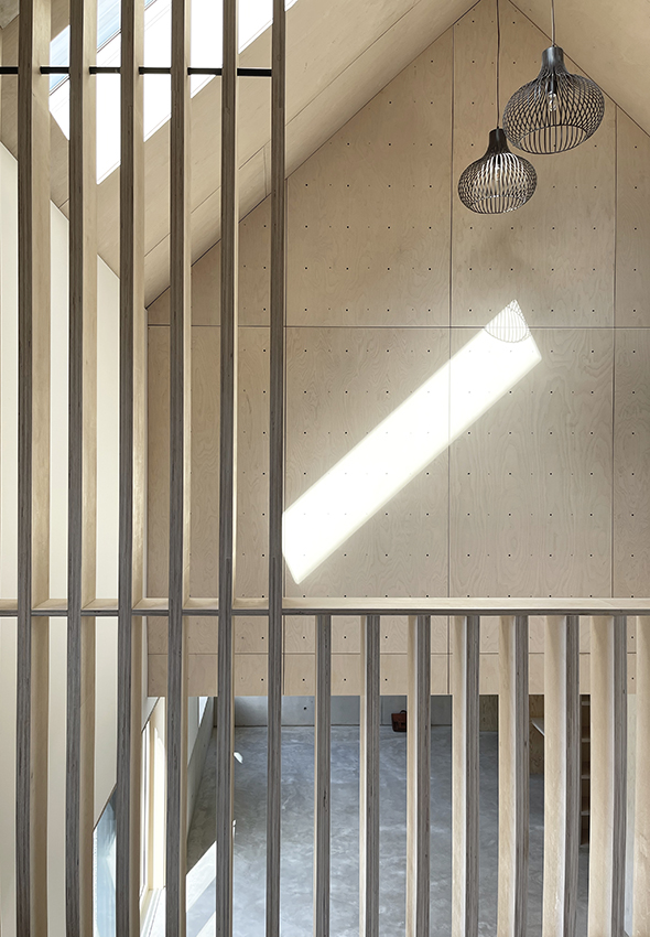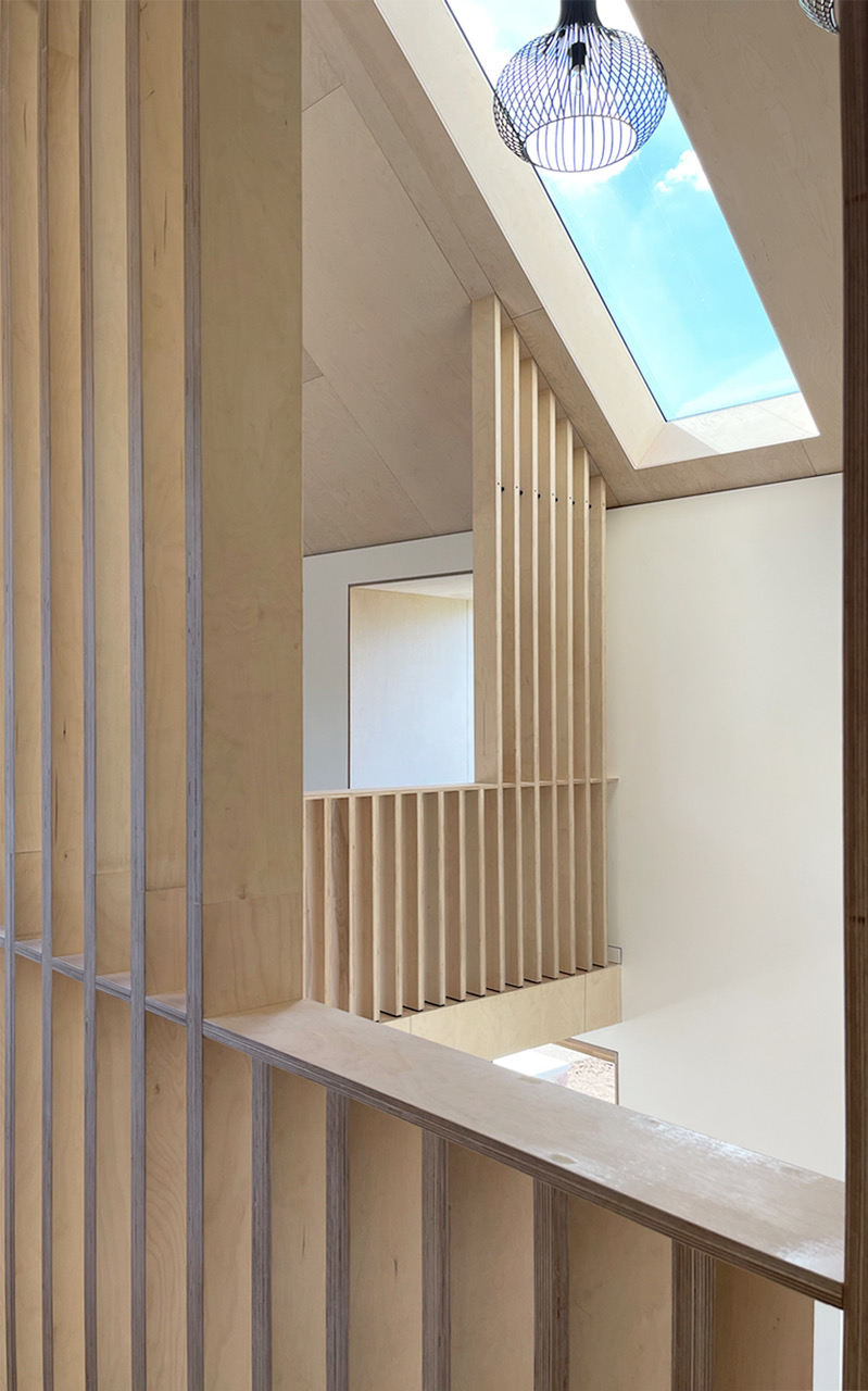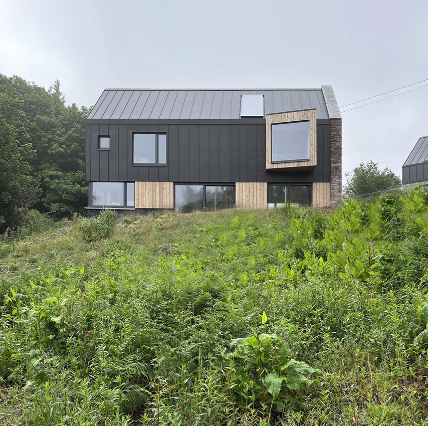 Brook Lea is a new build house in St. Briavels, Gloucestershire designed to Passivhaus standards. Replacing an existing cottage which had fallen into disrepair, the concept was to create a cranked house that took advantage of the sloped site and changing sun path at different times of the day and year. Our clients were keen to maximize the surrounding landscape and make a strong connection both visually and physically to provide a home that will support a growing and changing family. With the requirement to create a large open and connected space, kitchen, dining, living, work and play are integrated in one way or another. Large, carefully placed windows frame the landscape in each room, whilst internally, mezzanine and double height spaces visually and physically connect the inhabitants. Both ‘dirty’ and ‘clean’ entrances were developed in the scheme allowing the family to maintain their active outdoor lifestyle without impacting the order of this bespoke home. The use of stone, raw timber, and a light metal roof take their cue from the local farm outbuilding vernacular in the area, as do the two stone gables that form solid bookends to the house. The house is constructed on an insulated raft slab with an exposed polished concrete slab for thermal mass. Above the concrete slab the house is largely constructed using an engineered, offsite timber frame manufacturing process with recycled newspaper insulation. The scheme also includes triple glazed windows, MVHR and air source heat pump technology. The completed project achieved an airtightness test of 0.2 @50 Pa.