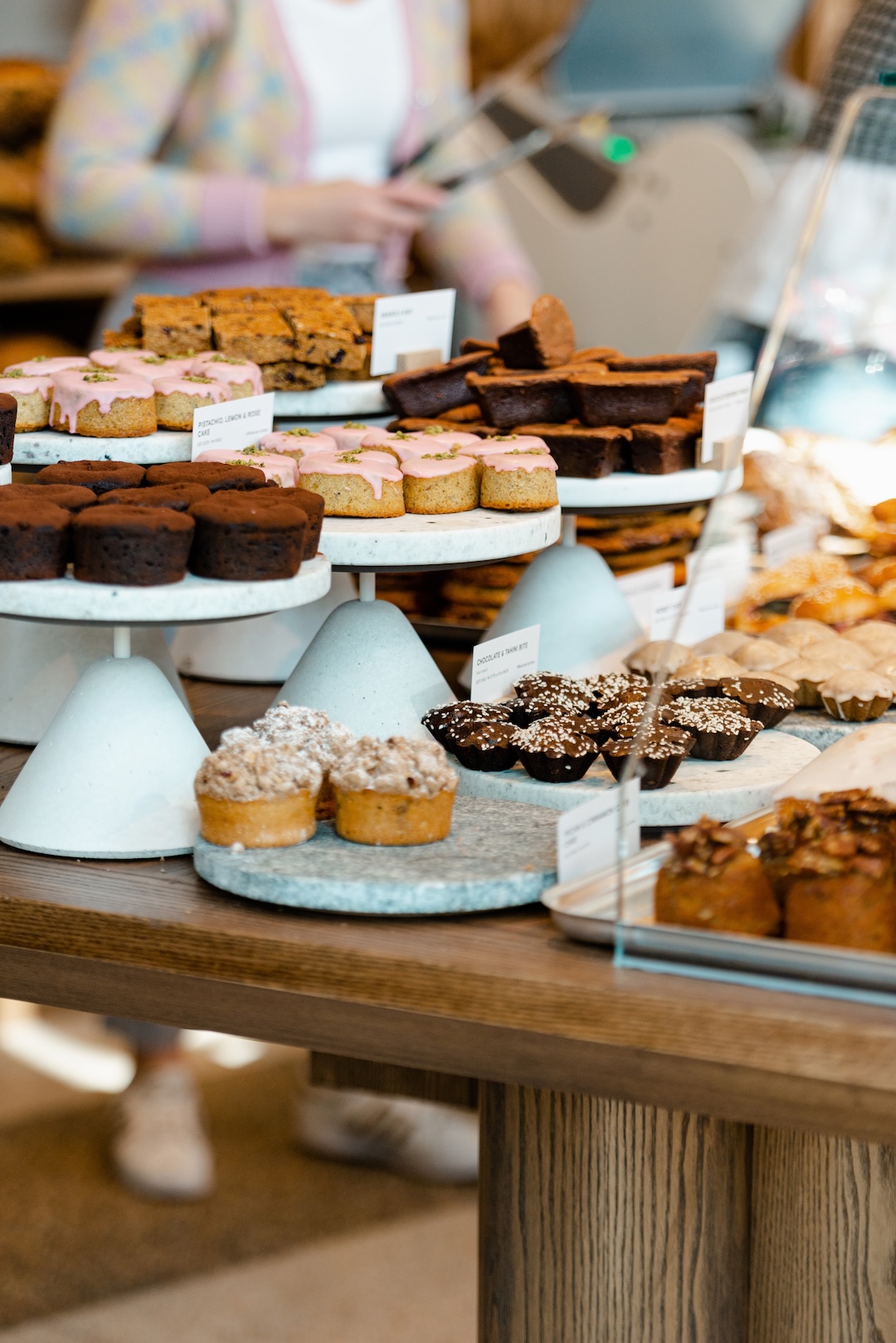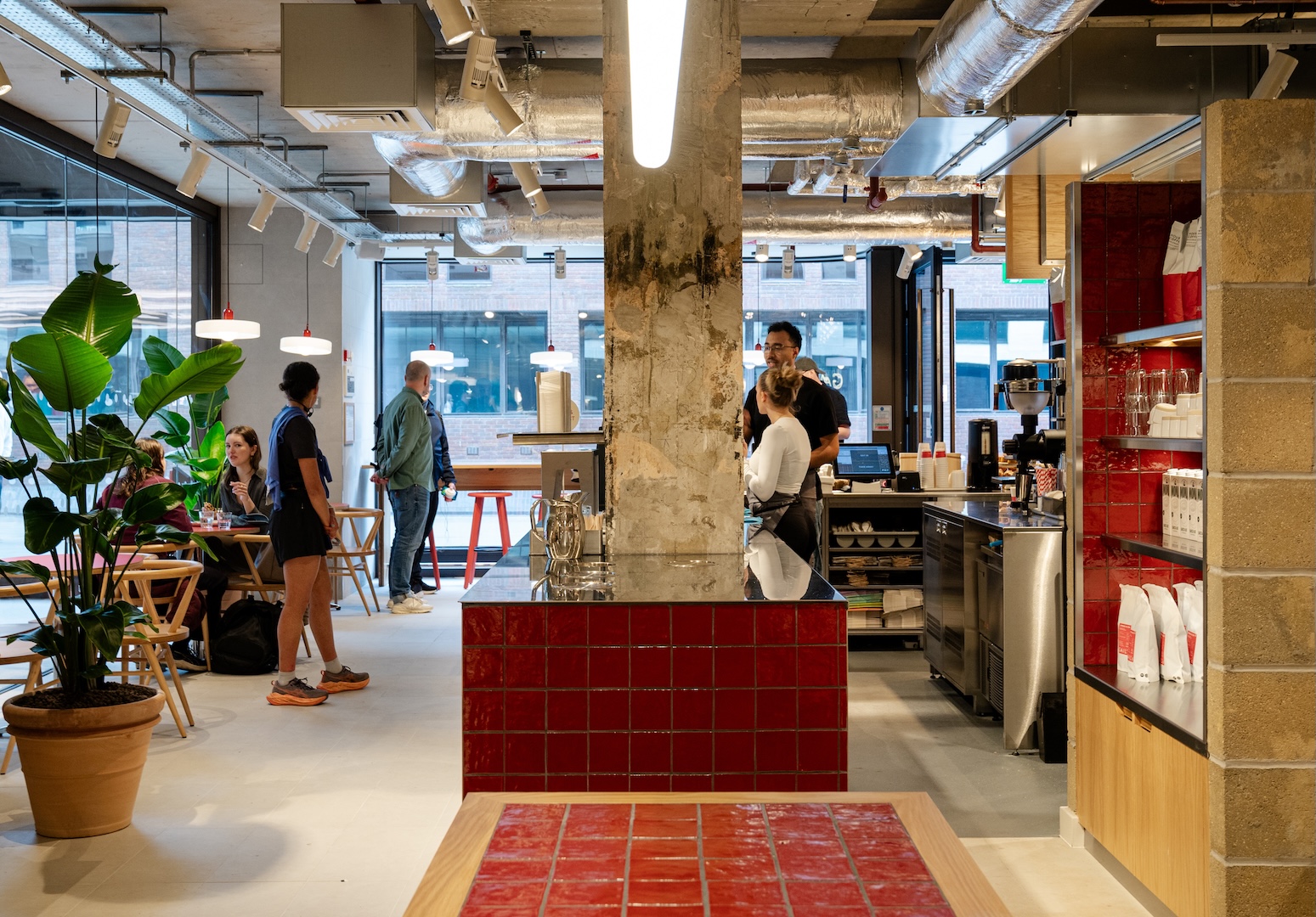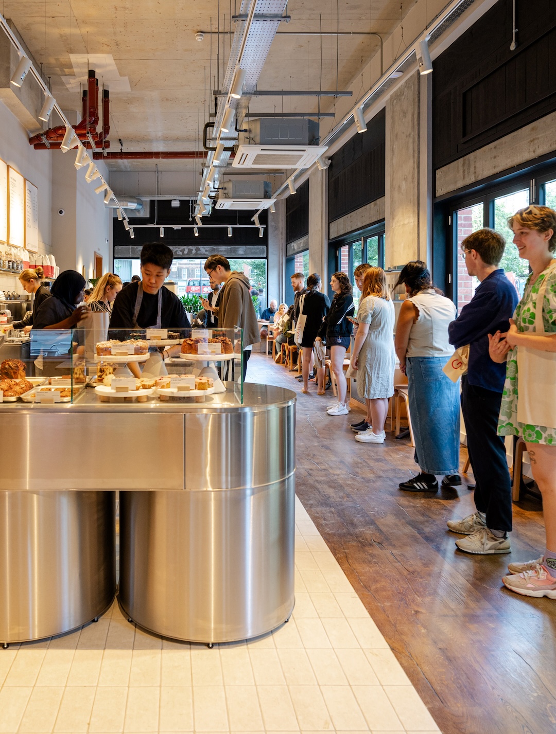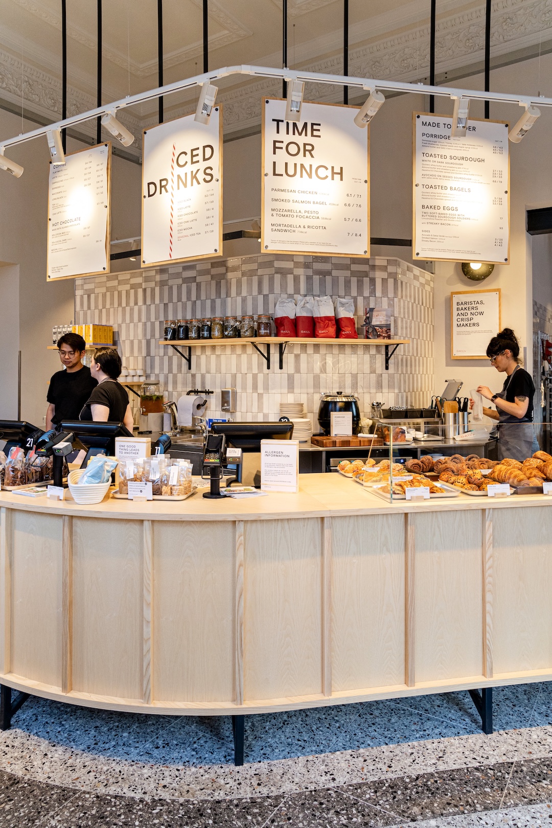 Holland Harvey has delivered over 90 bakeries for Gail’s across England. Our working relationship has spanned 10 years, and we continue to work with them to evolve their offering. Locations vary, from glass skyscrapers to Victorian banks, and each site offers new challenges and requires a unique design response driven by narrative and referencing a sense of place. Gail's is an established and well-known brand, yet every bakery is different. The common thread is a consistent approach to design that is aligned with the organisation’s values – this includes promoting ethical and responsible sourcing of materials and relationships that we maintain with social enterprises such as Goldfinger and RAW. The product is always front and centre, bread is stacked high in the windows or close to the main entrance as a primary indicator that fundamentally the brand is a bakery. Beyond this, a large table or counter displays an array of savoury and sweet baked goods that are popular both as eat-in or takeaway items. Gail’s is primarily a retail offering, however, has become well-loved for their dine-in experience. Comfortable seating creating intimate spaces encourage customers to enjoy the spaces. Their operations have evolved over the years, and we have delivered many iterations of their brief.