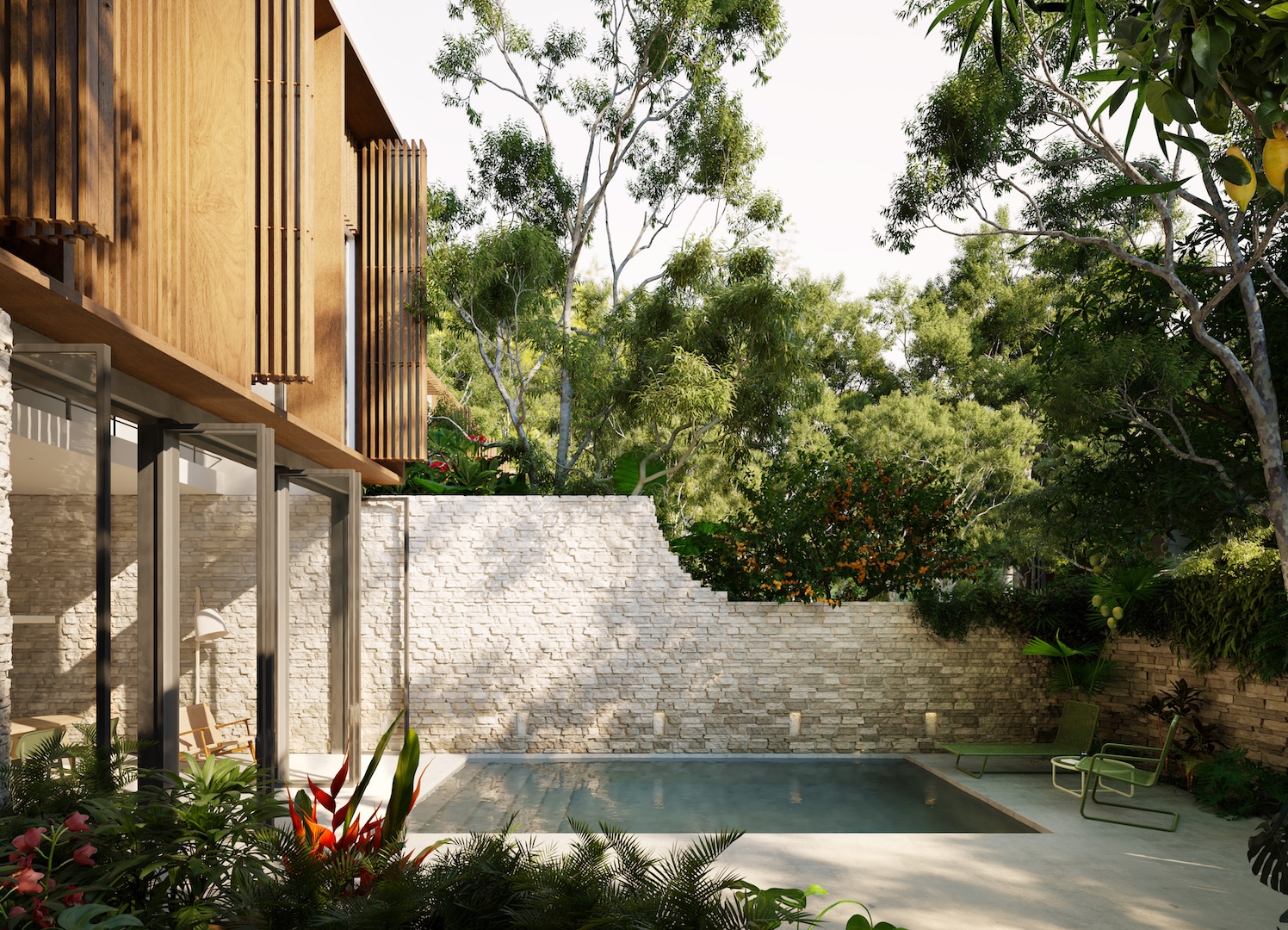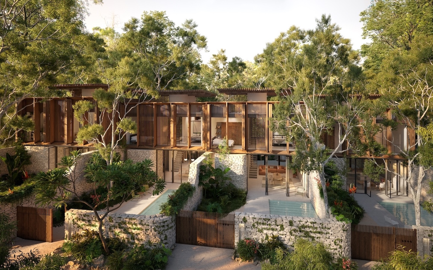 K’in Lum Ha is a boutique hospitality development of eight private villas in Tulum, Mexico, designed in collaboration with TTF Group. Set within the Yucatán Peninsula’s unique limestone ecology, the project prioritises biodiversity, cultural sensitivity and low-impact design. Working closely with local landscape designers, botanists and ecologists, the scheme retains 60% of the site as permeable landscape or natural jungle floor, with a commitment to replacing any trees removed during construction. The villas are designed for short and long-term stays, offering guests an immersive experience rooted in place. The architecture responds to the tropical climate through passive ventilation, openable façades and sustainably sourced hardwood brise-soleil. Ground-floor walls use offcuts of local limestone, while lime plaster finishes are applied by Mayan craftsmen, embedding indigenous knowledge and material heritage. K’in Lum Ha sets a new benchmark for regenerative hospitality where ecological stewardship, cultural integrity and contemporary comfort converge.