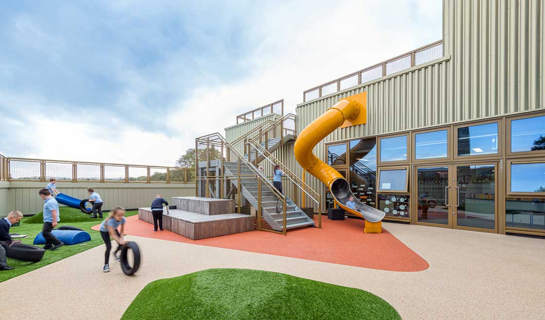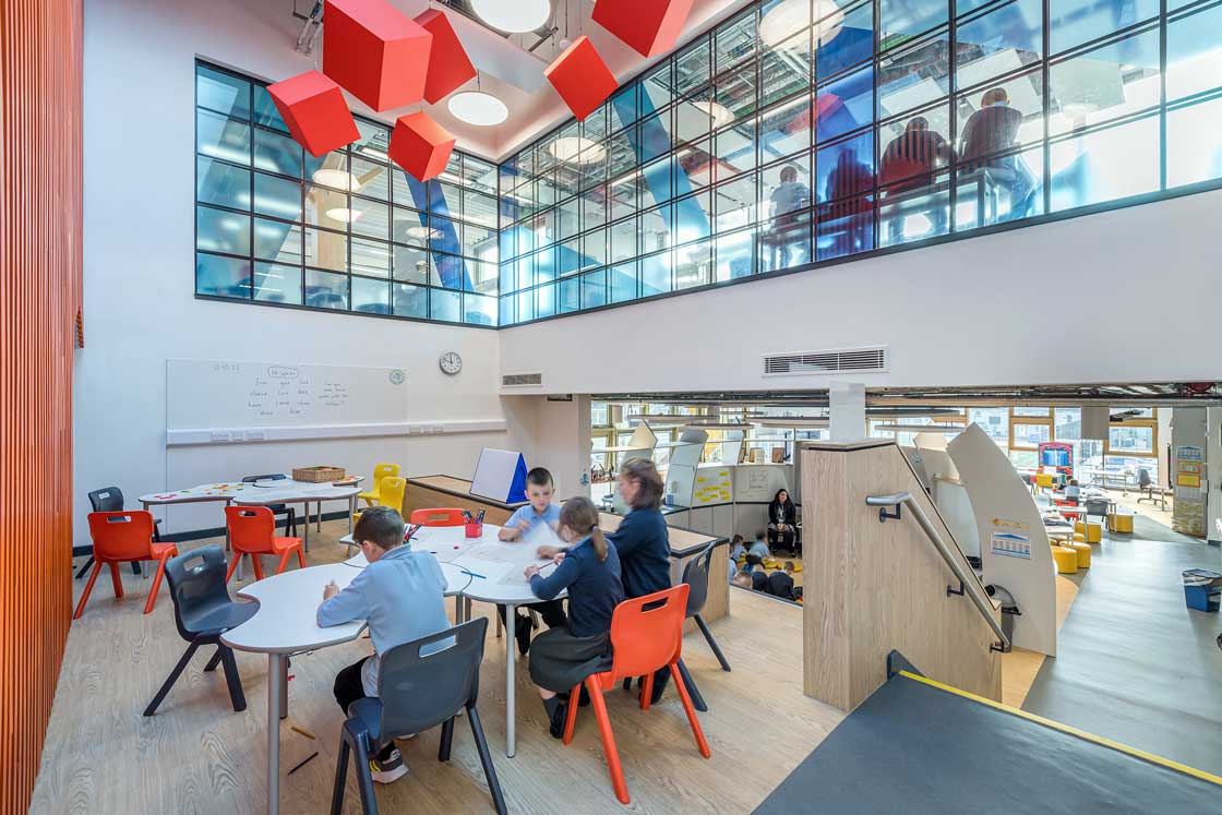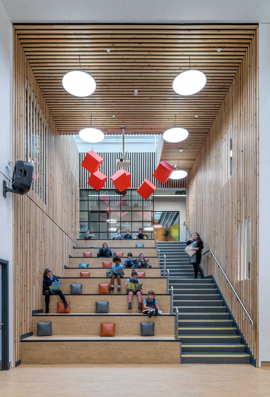 Renton Campus comprises a new primary school, ASN unit and ELCC for around 300 pupils. An exciting and innovative project which provides a state-of-the-art learning environment moving away from traditional teaching methods. The campus maximises a constrained site and connects indoor and outdoor learning through stimulating rooftop terraces with teaching zones and play equipment, giving every level direct access to an outdoor space. Internally, learning spaces are innovative and stimulating providing a variety of flexible, task-based activity spaces. Amphitheatres, reading nooks and a STEM space sit amongst open plan learning zones providing connections and visibility between age groups.