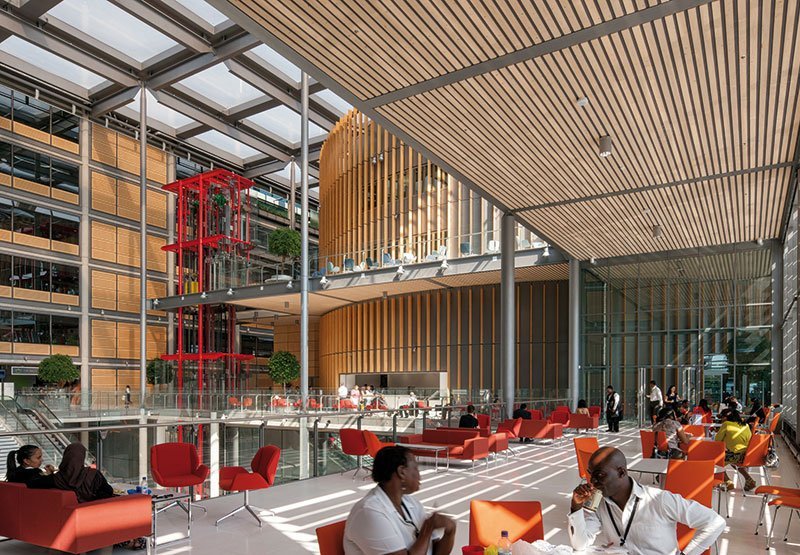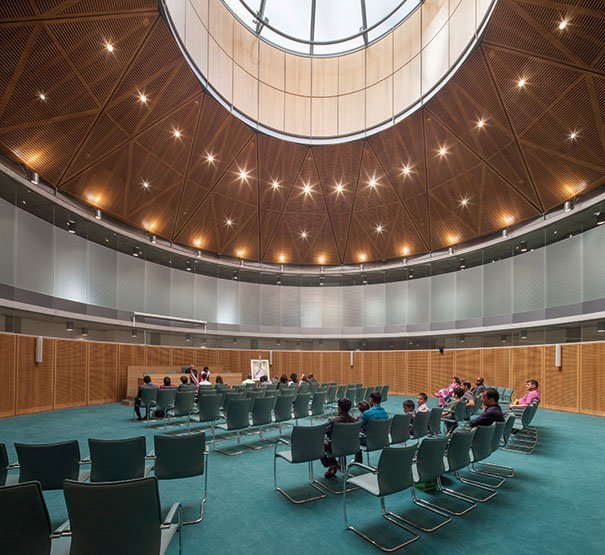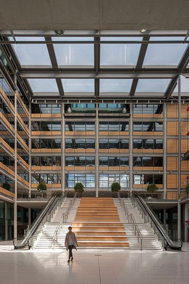 Located on a prominent site next to two well-known civic icons, Wembley Stadium and Wembley Arena, the new Civic Centre streamlines all aspects of the Council’s activities and has become a new hub and heart for the community where residents can meet, shop and eat. It houses Brent's civic, public and administrative functions under one unified roof, providing office space for 2000 staff. The building’s spaces are arranged around a soaring, naturally-lit foyer and atrium which houses a large public amphitheatre and staircase that host a programme of high-quality arts and cultural experiences that further enhance the building. A circular Drum clad in timber fins features prominently in this space and houses a multi-purpose community hall, library, one-stop shop and civic chamber. Behind this, glazed office wings are open-plan and flexible to provide a future-proofed solution to the diverse community’s administrative needs. The building also includes space for retail outlets and a landscaped garden to help it to connect further with the surrounding Wembley Regeneration Area. The project has been awarded the coveted BREEAM ‘Outstanding’ rating, the highest possible, and is the first project in its category to have achieved this. As such, it features a 33% reduction in carbon emissions thanks to a combination of solar shading, natural ventilation, high-performance façade, and combined cooling, heating and power which utilises waste fish oil. It is the most sustainable local authority building to be completed in the UK. Hopkins have also provided interior design services throughout the project.