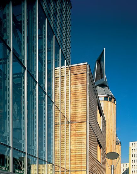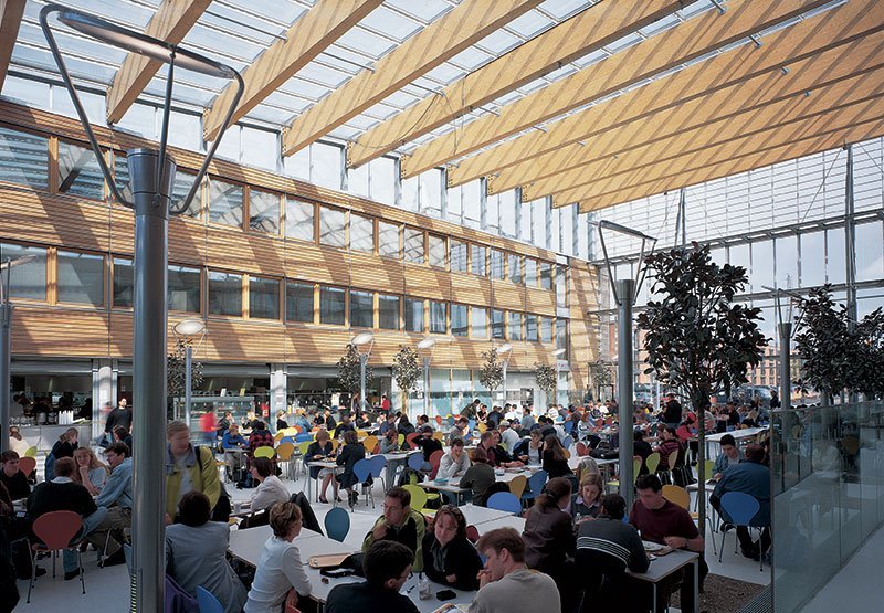 A former bicycle factory site has become an academic park for the University’s expanding faculties and student residences, using energy-saving design and construction to balance communal, functional and operational priorities. The University of Nottingham is proud of its architectural heritage. When it acquired a six hectare industrial site it decided to develop a campus suitable for its Centennial Jubilee. Our competition-winning design created a lake along the site. The principal buildings, three faculties, a learning resource centre and a central teaching building overlook the lake along a path leading to the University’s playing fields and original campus. There are also 850 student rooms in five halls. Colonnades on the pathside buildings engage pedestrians and invite them to look into the gardens and atria between the finger-like wings. Ground floors accommodate functions like catering, shops and meeting; above are faculty rooms. The unusual shapes of the free-standing circular learning resource centre and conical lecture halls which appear to float in the atrium of the central teaching building, proclaim their importance. Halls of residence have more privacy; those for undergraduates adopt a traditional courtyard layout, while the postgraduate residence is crescent-shaped. A low pressure drop ventilation system uses corridors and stair towers as air plenums, reducing the energy needed to circulate air. Under normal conditions specially-designed chimneys create adequate wind effect; during hot weather photo-voltaic cells on the atrium roofs generate supplementary power for extra cooling. Such ideas attracted the largest ever Thermie Grant from the European Union, allowing a small premium above the stringent cost guidelines for academic buildings, and ensuring that the new campus is a worthy companion to the original one.