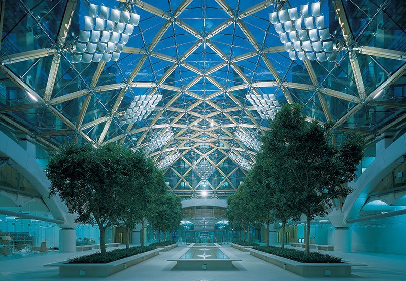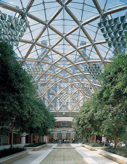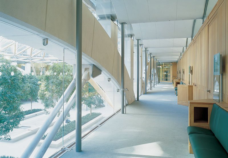 Conceived in the tradition of Thames-side palaces facing the river, the building integrates the disparate buildings of the Parliamentary estate. The accommodation is arranged in a six storey rectangular block, around a central courtyard. This is roofed at ground floor level by a diagrid of oak members with stainless steel joints, covered by a frameless glass skin. Surrounded by restaurants and the library, with shady trees and tranquil pools, it has become a meeting place and focus for Parliamentary life. The first floor gallery overlooking the courtyard gives access to a range of Select Committee Rooms. Above, there are five floors of MP's offices with views out either side over the courtyard roof or to the surrounding streets and river embankment. The building structure had to be co-ordinated with the Westminster Underground Station below. The inner walls around the courtyard are supported on only six columns, tied by a transfer structure of concrete arches. Gullwing precast concrete floor units span onto the perimeter walls of sandstone piers. Welded box girders, doubling as air ducts, form spider-like roof frames on top of the piers. The chimneys are the terminals of a sophisticated, energy efficient, ventilation system.