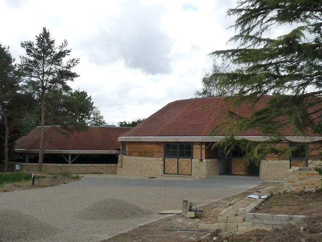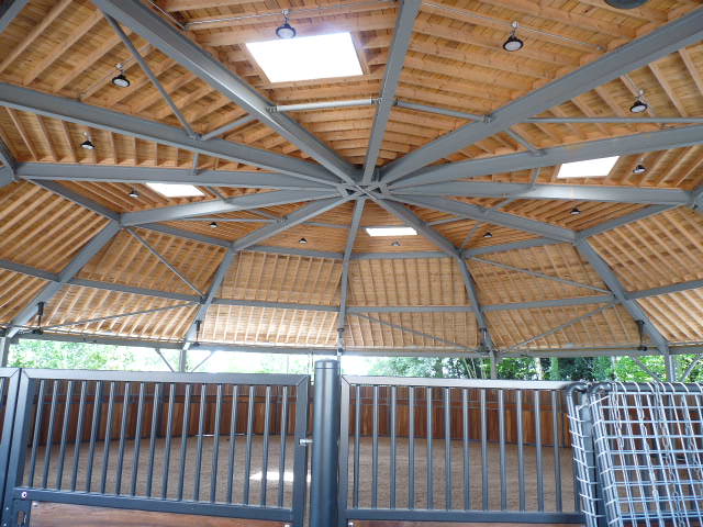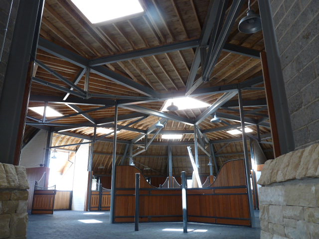 9 box stable building with enclosed central courtyard; with a covered link to a horse walker and lunge