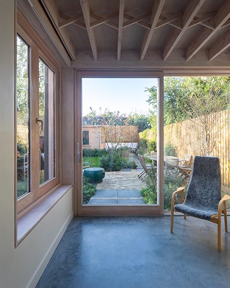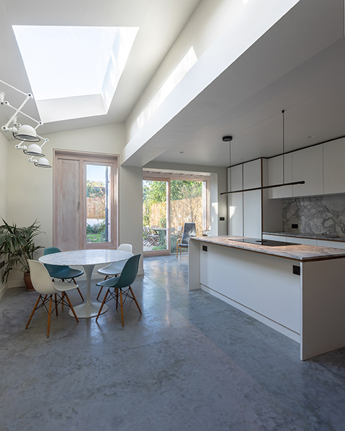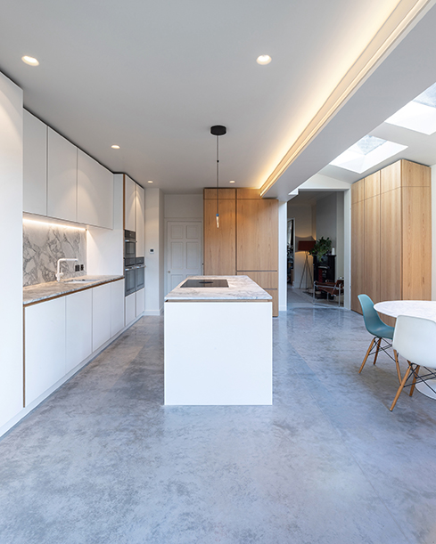 The brief for this project was to reconfigure the rear of the Edwardian townhouse within the Hollygrove Conservation Area in Peckham. The existing extension is poorly configured and provides a small kitchen and limited additional living space. The extension has a very contemporary aesthetic. A cream brick plinth supports bleached douglas fir cladding with douglas fir clad sliding doors and casement windows and ventilation. Internally this pared back aesthetic is continued through the use of bleached exposed douglas fir structure, polished concrete and light natural stone. Hidden LED's provide discreet ambient lighting and large rooflights to the side pitch flood the dining area with natural light and bring light deep into the rear library room of the existing house. Planning permission was granted in mid 2020 and construction was completed in mid 2022.