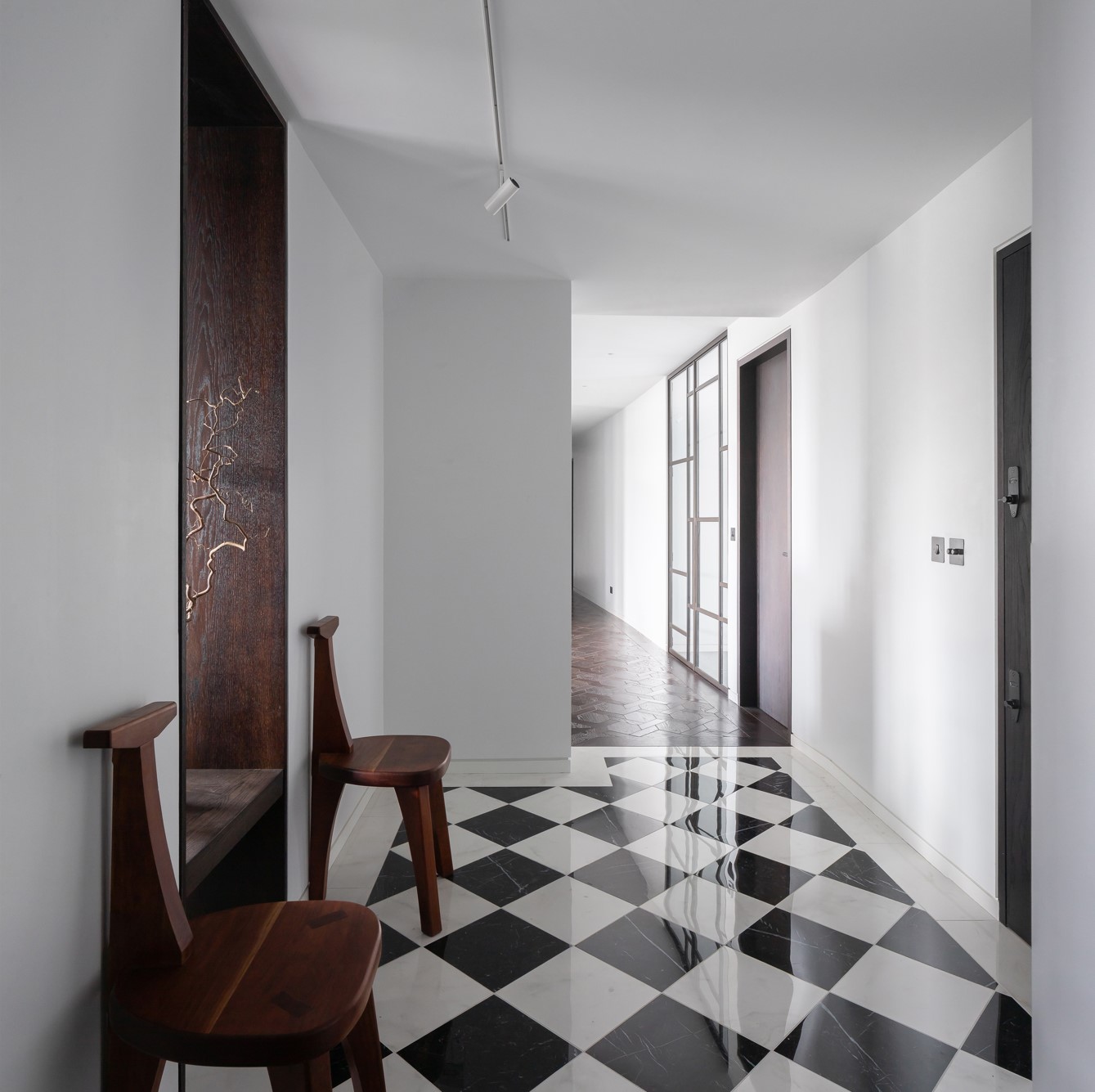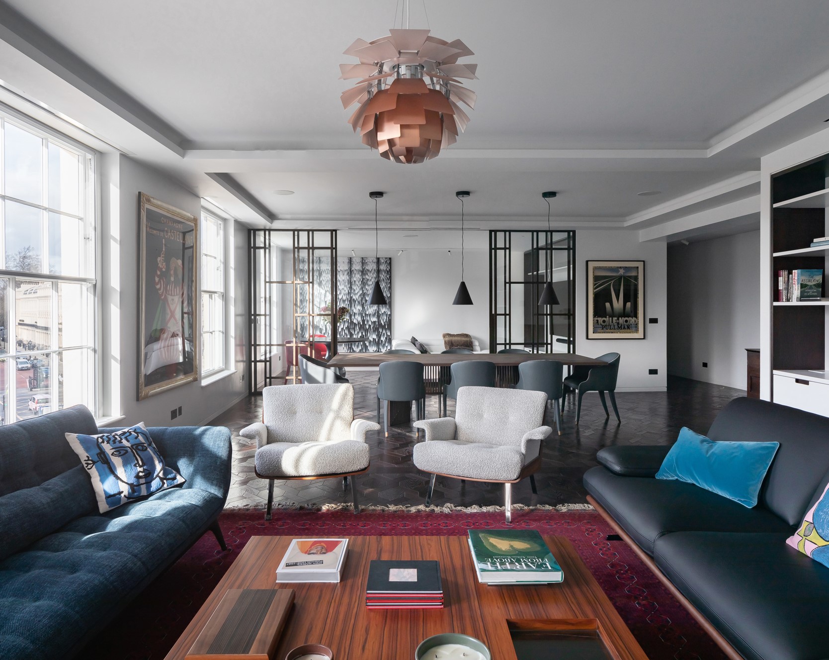 This project involves the complete overhaul of a 230sqm apartment within an historic Grade 1 listed John Nash building fronting Regents Park. The building was badly damaged during the war and only the facade was retained. The building behind the facade is of mid century concrete slab construction and we are removing all internal fittings and finishes to expose the original structure. The new layout provides two guest bedrooms and a master suite, a large open plan kitchen, dining and study space and a separate large kitchen. The apartment is full of bespoke features, specifically designed for the room and setting, such as sliding steel framed windows, walnut joinery and a bespoke lozenge parquet floor. Work is now underway on site and we are looking forward to completing in late 2022.