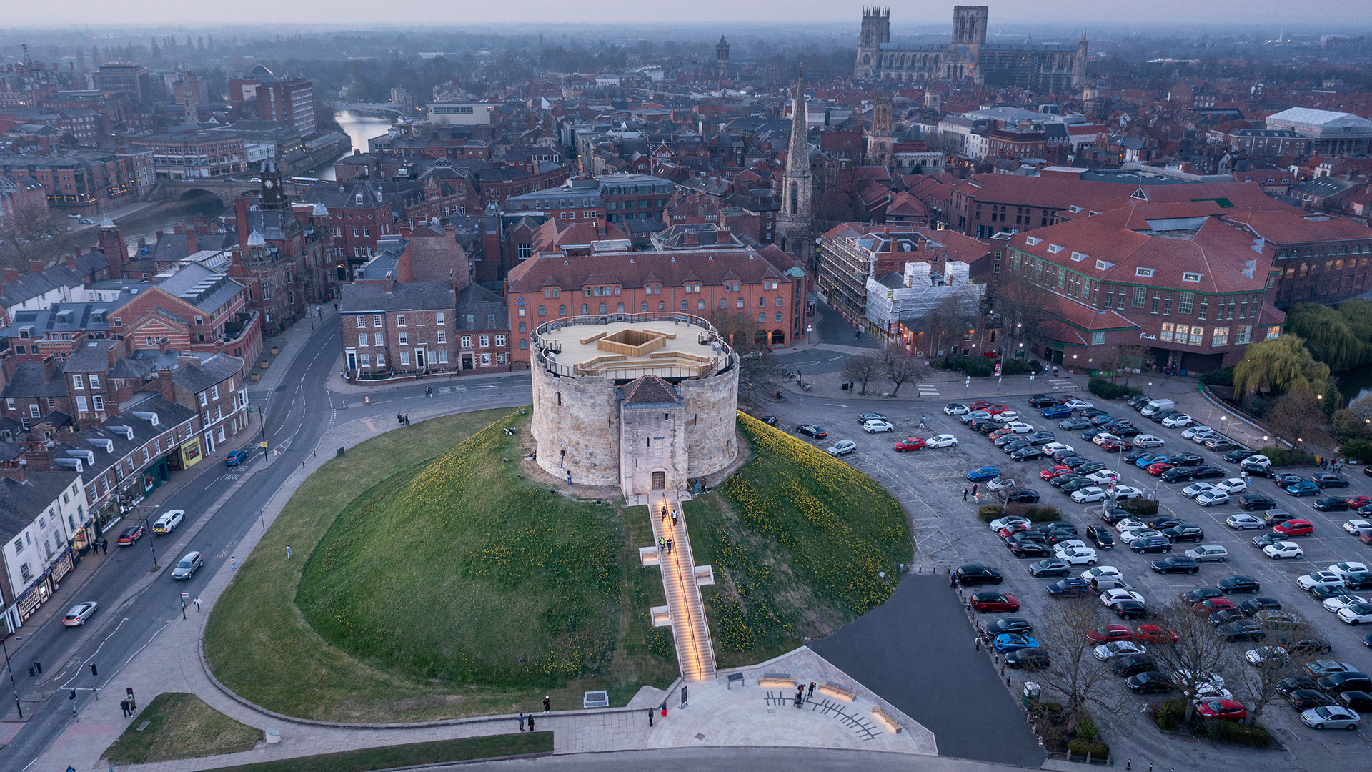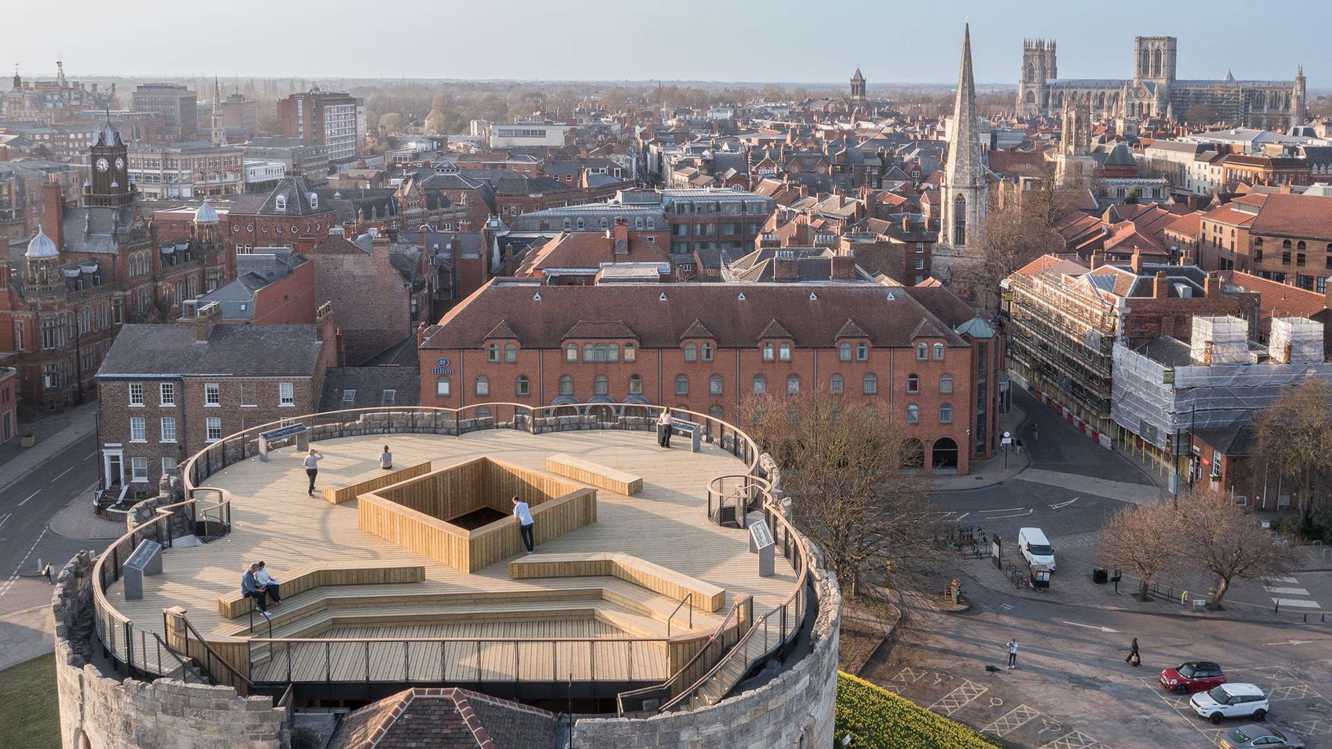 Our work for English Heritage at Clifford’s Tower demonstrates our skills in designing technically challenging and appropriate interventions within the context of a Scheduled Ancient Monument, improving access and visitor facilities whilst fostering better interpretation of the site and Monument’s history. A timber structure has been installed to partially cover the ruin and provide fantastic viewing and activity space at roof level. Suspended metal walkways give access to previously unseen features at first floor level, enhance access to the roof and help celebrate the ruin. The structure of the intervention rests on a raft foundation, which spreads load without impact on archaeology within the tower.