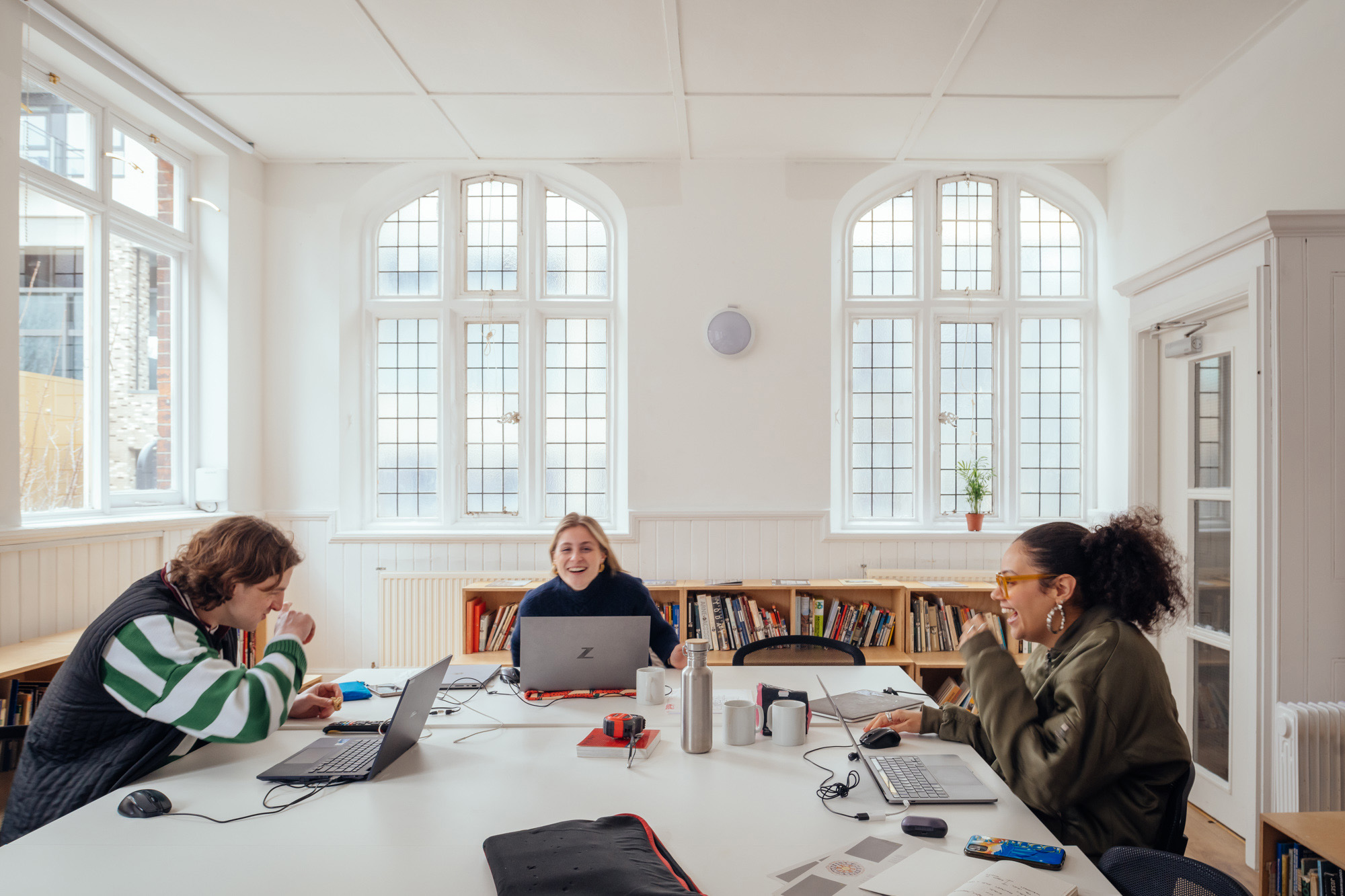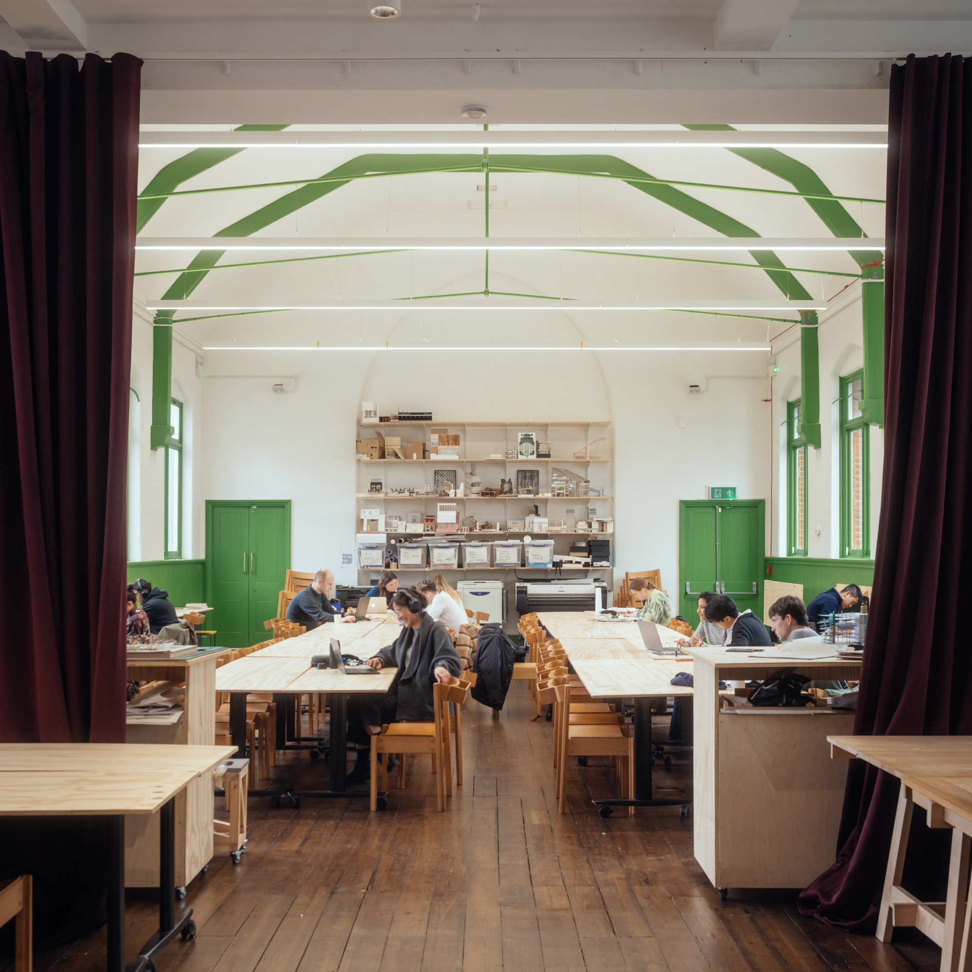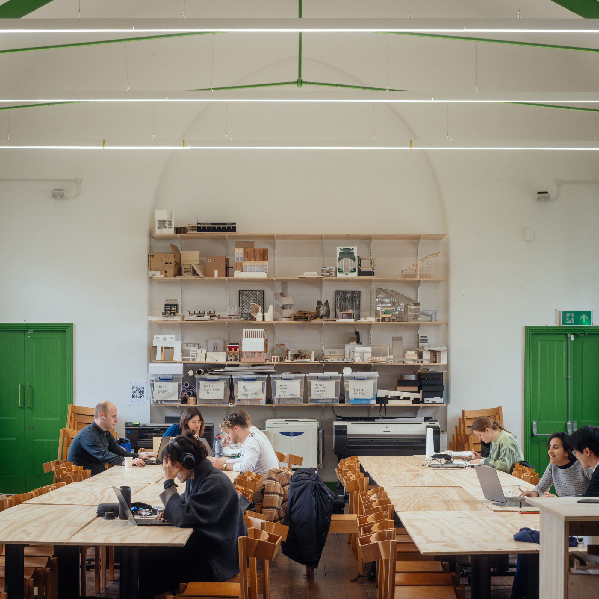 The restoration and refurbishment of a late 19th century church hall in Dalston to provide a design education centre for the most accessible architecture school in the UK, the London School of Architecture. Working within a tight budget, IDK designed an affordable scheme to convert a church hall in disrepair into a design education centre for the London School of Architecture. Resources were channelled to where absolutely necessary, with the layers of previous piecemeal additions stripped out to return the building to a sense of its former self. This created the necessary spaces for a super flexible community institution. The London School of Architecture is home to an architecture school, a furniture making school, shared workshops, seminar spaces, a large adaptable studio space and administrative offices. Circular procurement methods were used where possible. All of the studio furniture is second hand, with the chairs salvaged from a brutalist church slated for demolition. The lighting was salvaged from department stores and remanufactured to near-to-new quality at a fraction of the market rate, and a fraction of the carbon (a saving of 80%). Monitoring equipment within the building tracks fluctuations in air quality, temperature and humidity, collating data which will inform the second phase retrofit strategy. This approach to minimum viable restoration, careful measurement and future action has been critical in allowing the school to open quickly and plan for a more sustainable future.