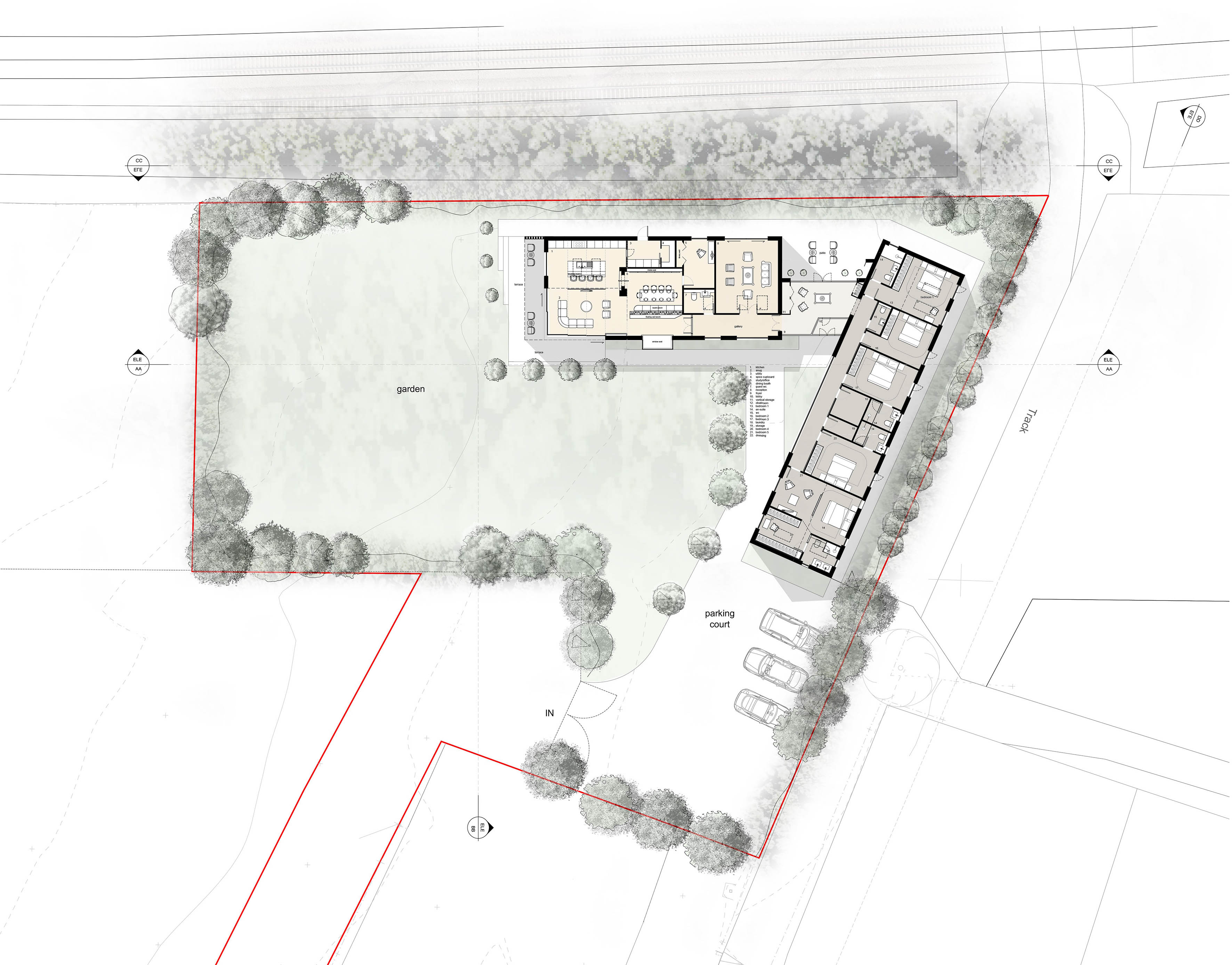 The project brief involved the design and development of a bespoke dwelling set within Green Belt land. The design has been informed by the existing ‘low level’ equine buildings that occupy the site. The split nature of these buildings and their contribution to ‘openness’ are reinforced within the proposal by creating two distinct forms link by a transparent foyer of smaller proportions thus ensuring openness is maintained and enhanced.