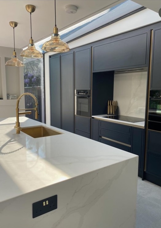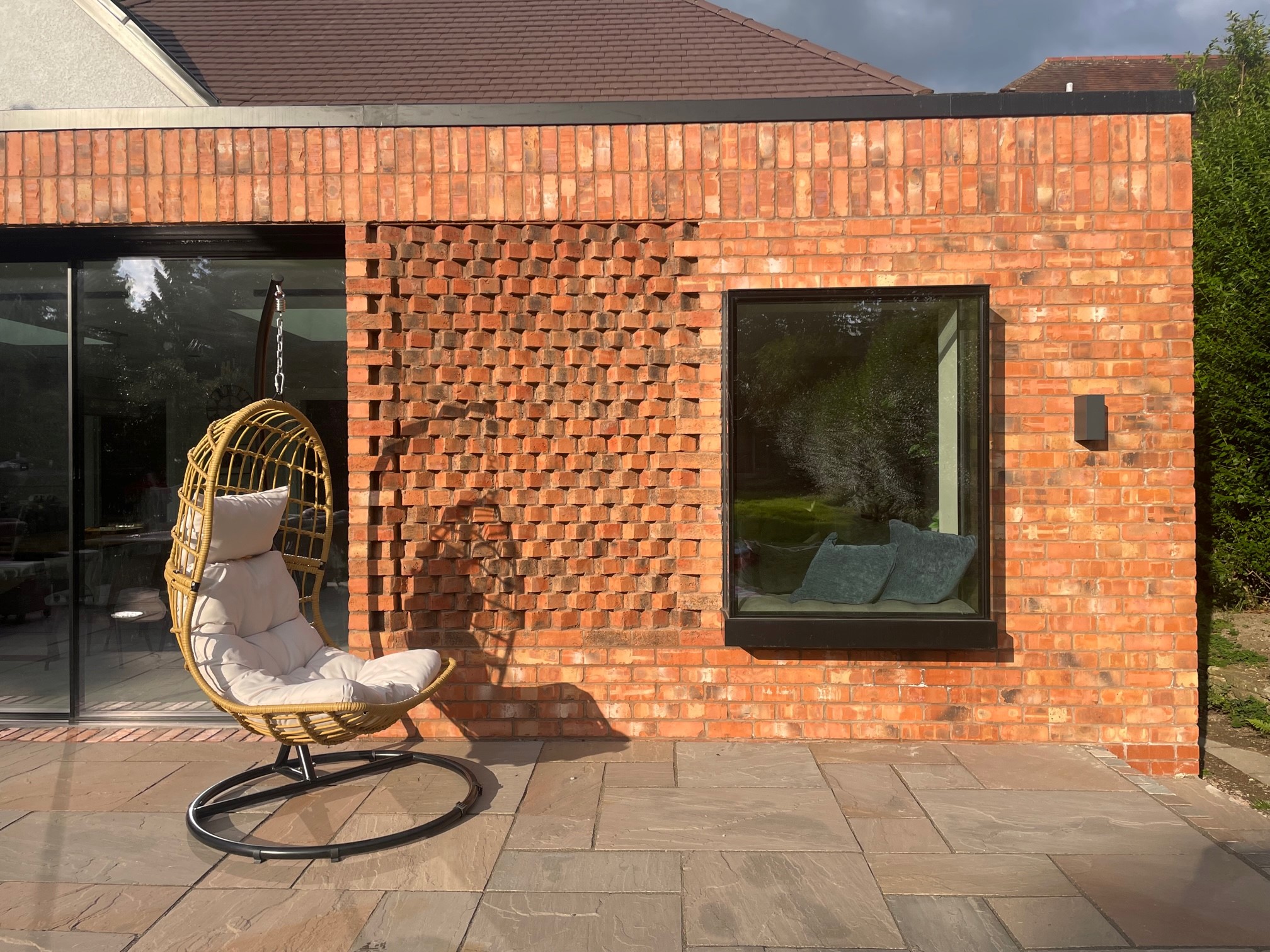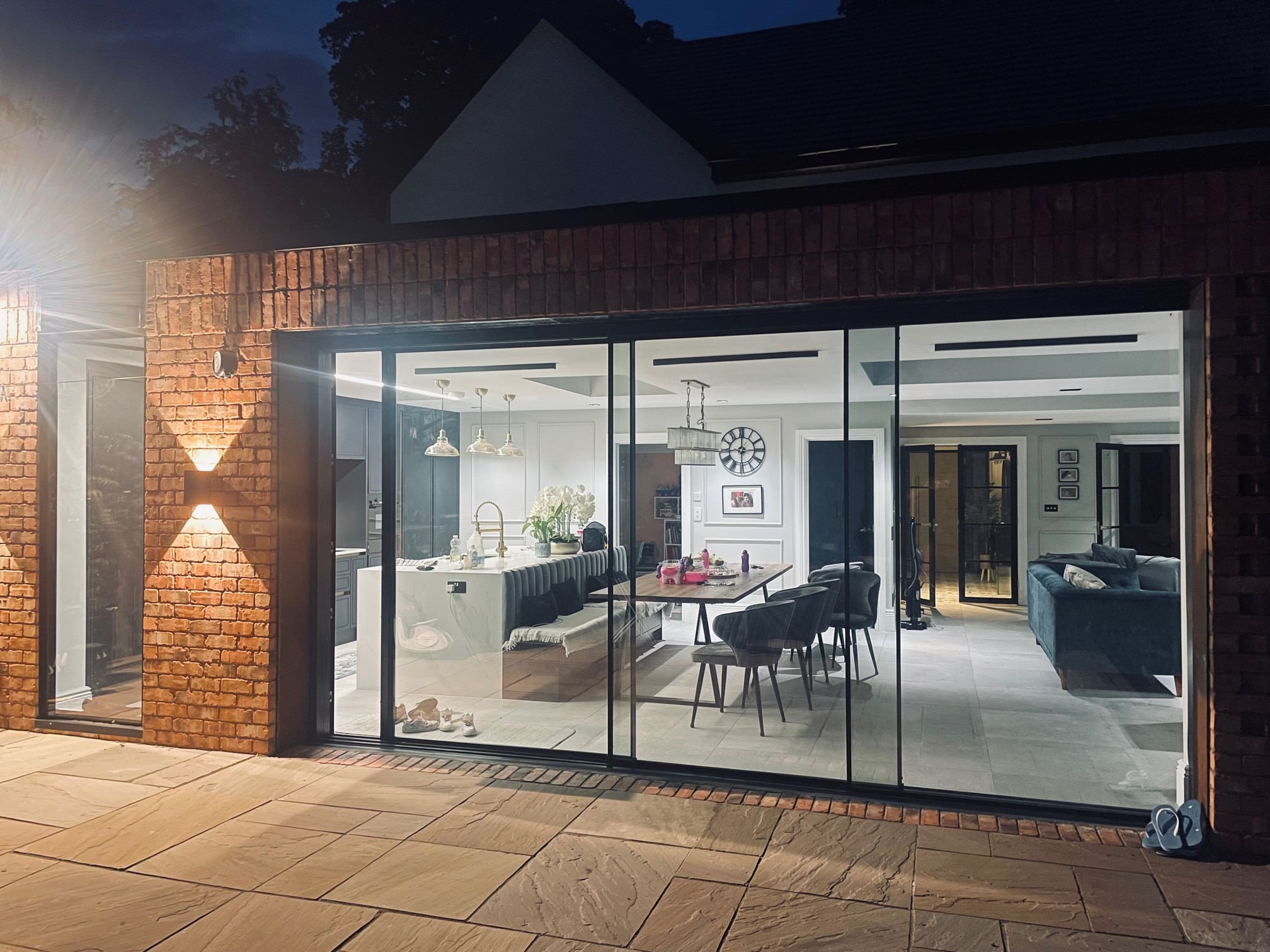 The recently completed full renovation and extension at Park Hall to create an open plan living kitchen/dining/living to the rear with feature glazing to maximise natural daylight into the property. The brief was to create a desirable space with the flexibility to open out into the garden for the family to enjoy. Large feature glazing created framed views and the feature panoramic concealed sliding door allows the whole space to extend out to the the external dining area.