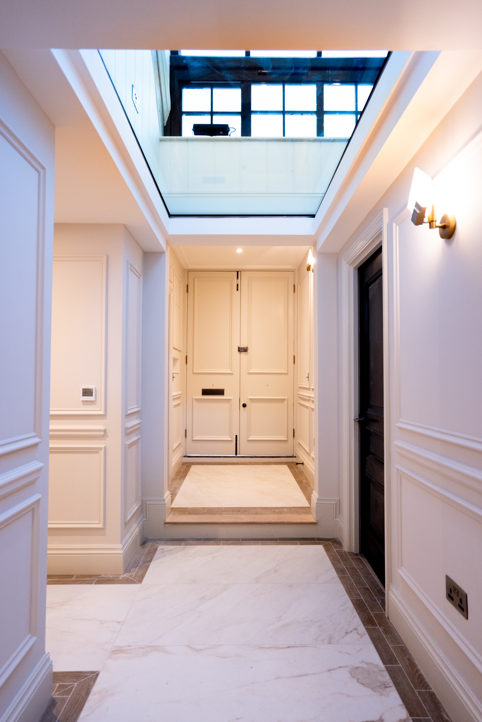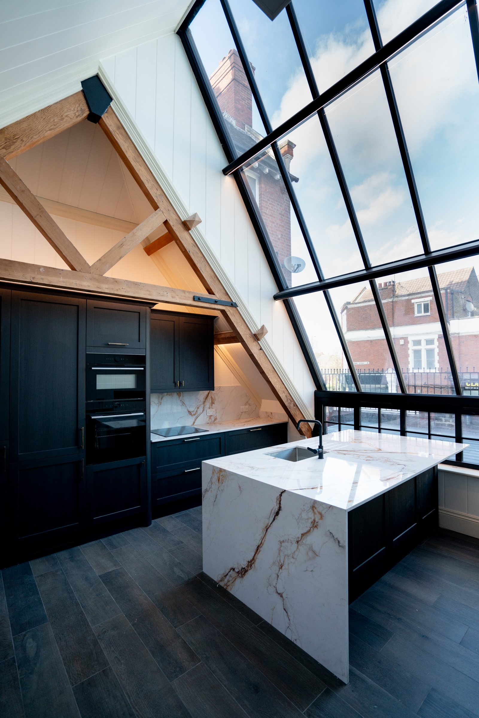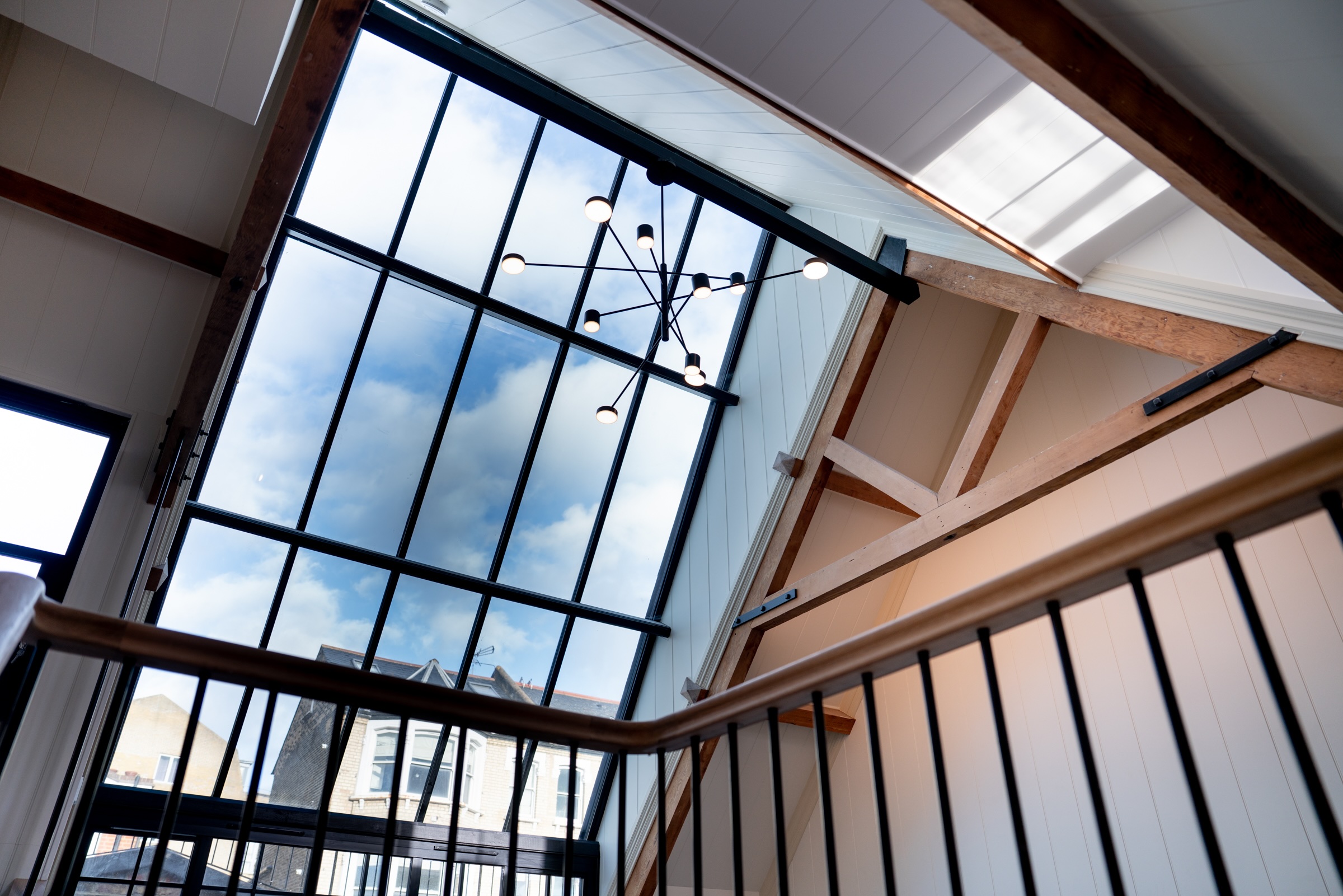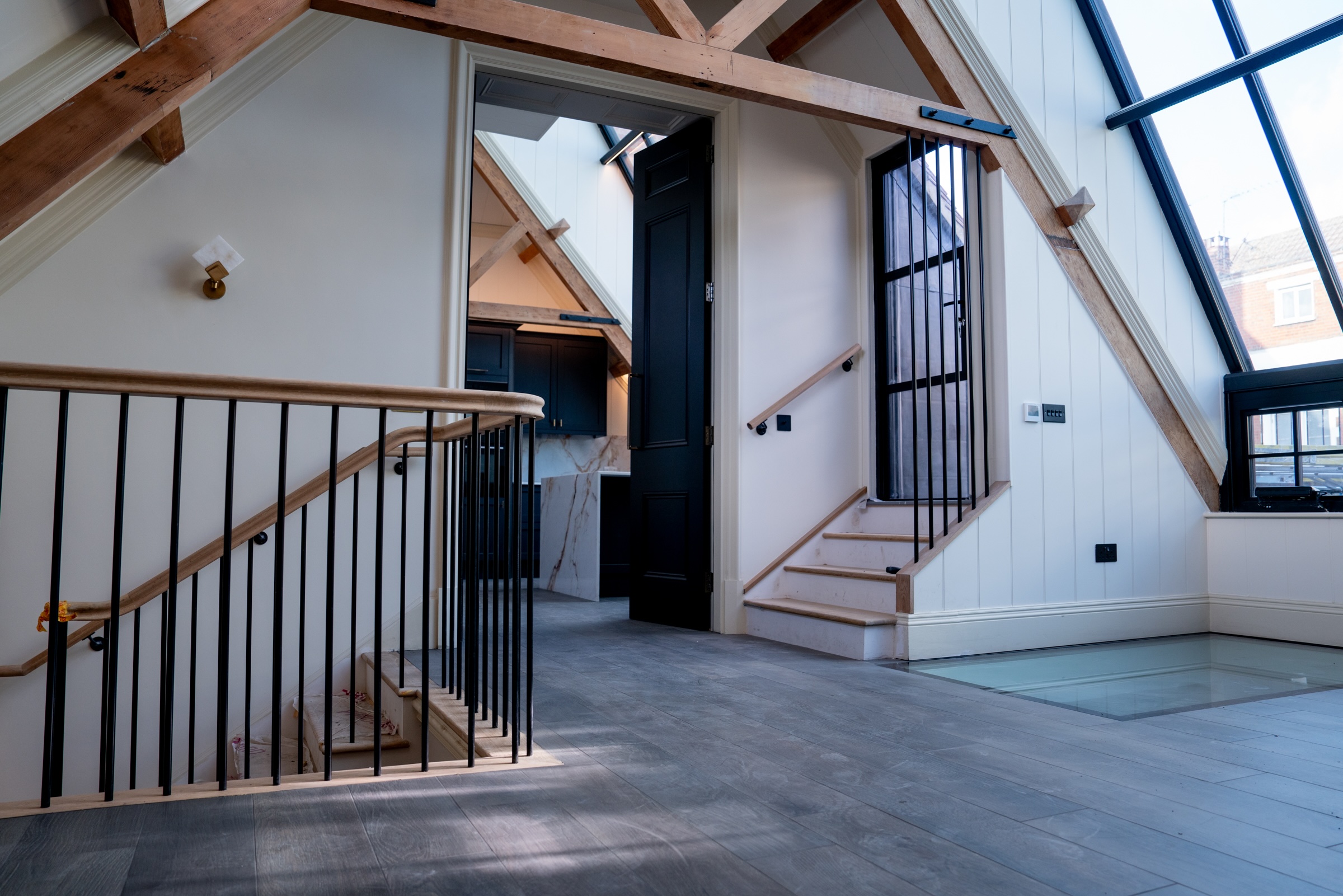 Located in the Abbeville Road Conservation Area and adjacent to the Grade II listed ‘Mission Room Building and Stable Block’ this sensitive refurbishment sought to reconfigure and upgrade the existing property, transforming it into a modern, light filled and energy efficient property. Despite the two large patent glazed rooflights and internal floor voids, the existing ground floor living spaces suffered from low levels of light and poorly connected spaces. We took the property back to brick and made several important moves to significantly improve the function of the space. This included flipping the accommodation between floors (bedrooms to ground floor, living to 1st). Across ground floor, the staircase was repositioned, a lightwell was introduced at the rear, and bathrooms relocated. The existing walls and floors were insulated, where previously none was present, new double-glazed sash windows fitted, and under floor heating installed throughout. The existing structure was largely retained, utilising existing openings to minimise costly temporary works. Four double bedrooms, an ensuite, family bathroom, guest shower room, and plant/ storage spaces were provided. Moving up to 1st floor, the existing floor void was infilled to add additional floor area and provide a modern open plan living space. Clerestory dormer windows were installed to the rear roof pitch, providing additional light and natural cross ventilation, and the existing patent glazing was replaced with new triple glazed, solar coated glass to maximise energy efficiency and daylight. Access to the roof terrace was repositioned with the existing roof being stripped, insulation and re-tiled. The existing roof trusses add real character to the space so were refurbished with the bottom chord repositioned to a higher level to improve head height across the floor. Due to contextual constraints, the existing redundant chimney stacks were removed to allow for a recessed plant deck where a new air source heat pump (ASHP) was installed. This results in no adverse visual or acoustic impact upon the setting of the adjacent listed building or conservation area and provides clean and efficient energy for the property.