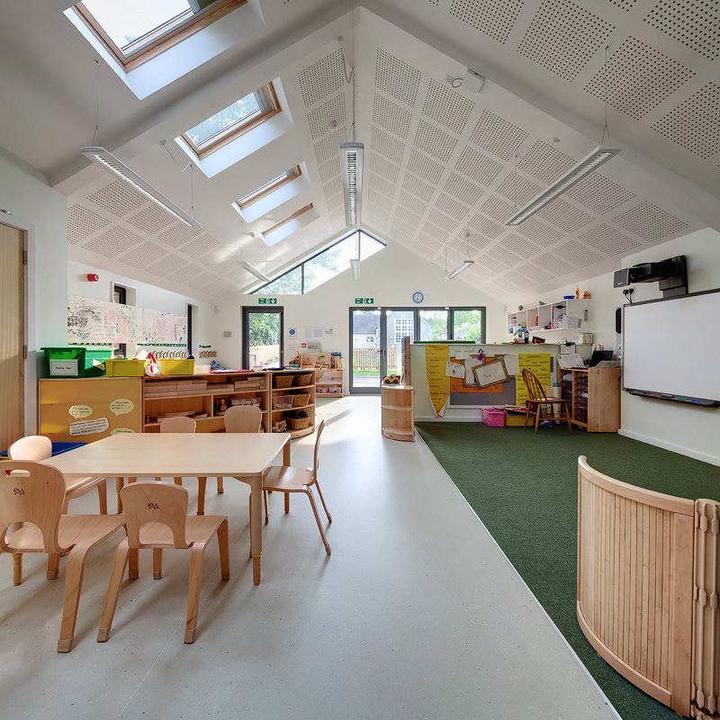 Jessop and Cook entered a competition bid for a new foundation-stage classroom, and won with this proposal for three offset elements which reflect the form of the main school buildings in a playful way whilst creating enclosed outdoor spaces. Internally the main teaching space provides a light and airy environment created by the rooflights, strip windows along the south elevation and large high-level windows which all help to capture light throughout the day. It offers a variety of spaces through the use of extruded window bays and a raised play area to create an engaging environment for the children. Jessop and Cook provided full Architectural Services from concept to completion, as well as Contract Administrator Services.