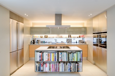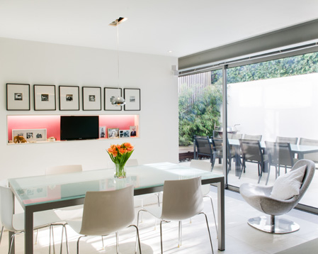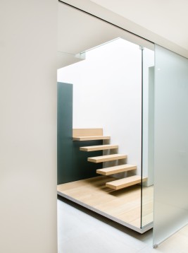 A 1970's speculatively built detached house in a quiet lane close to Blackheath in south-east London, was completely reconfigured and transformed to create a spacious contemporary home. Limited daylight in the original house caused by large trees surrounding the property was remedied by the introduction of a large roof light over a centrally located stair. This, coupled with an entirely glazed rear elevation to a private courtyard, allows the ground floor to be flooded with natural light. Doors to the courtyard, which is floored in the same porcelain tiles as the interior, are designed to slide into the adjoining room creating a full width opening that seamlessly links the courtyard with the interior, producing a true indoor-outdoor living space.