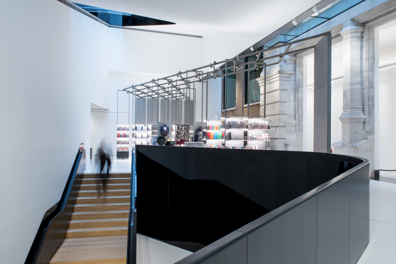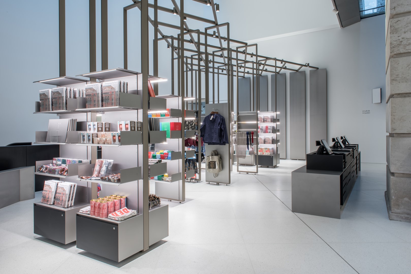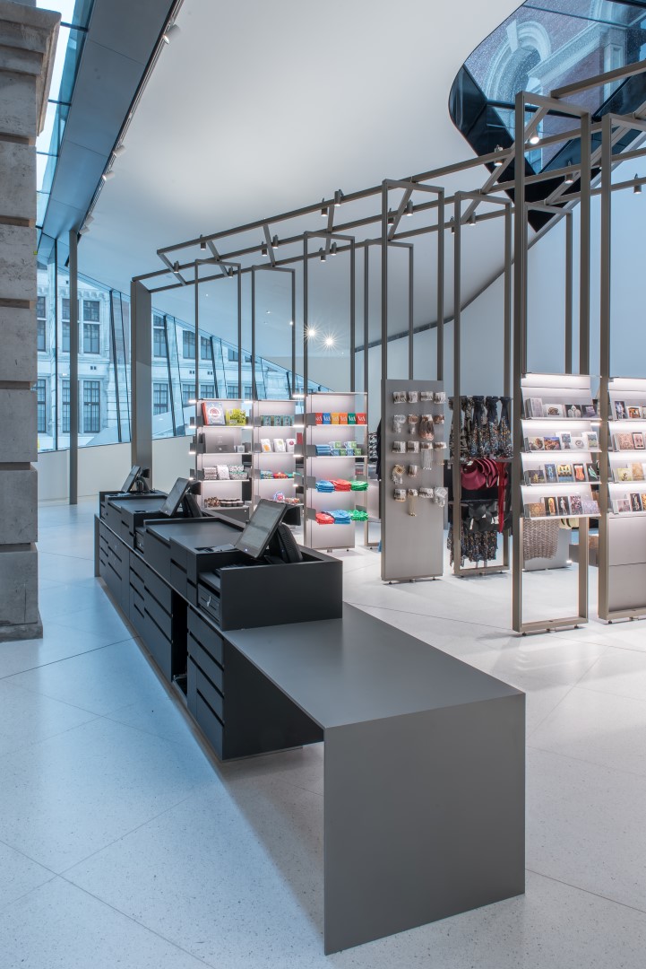 The competition-winning design for a shop within the new Exhibition Road extension created a series of 4.5m high, demountable pivoting frames with slender, bespoke extruded sections developed with Vitra. The open frames are retained at their head by a diamond grid, steel lattice structure and can be fitted with a combination of shelves, hanging rails, storage bunkers and showcases, enabling a wide variety of merchandise to be displayed. The upper levels of these frames provide an opportunity for high level flexible display, and can be pivoted and/or removed to allow differing circulation routes around displays and through the space to respond to the varying themes of individual exhibitions.