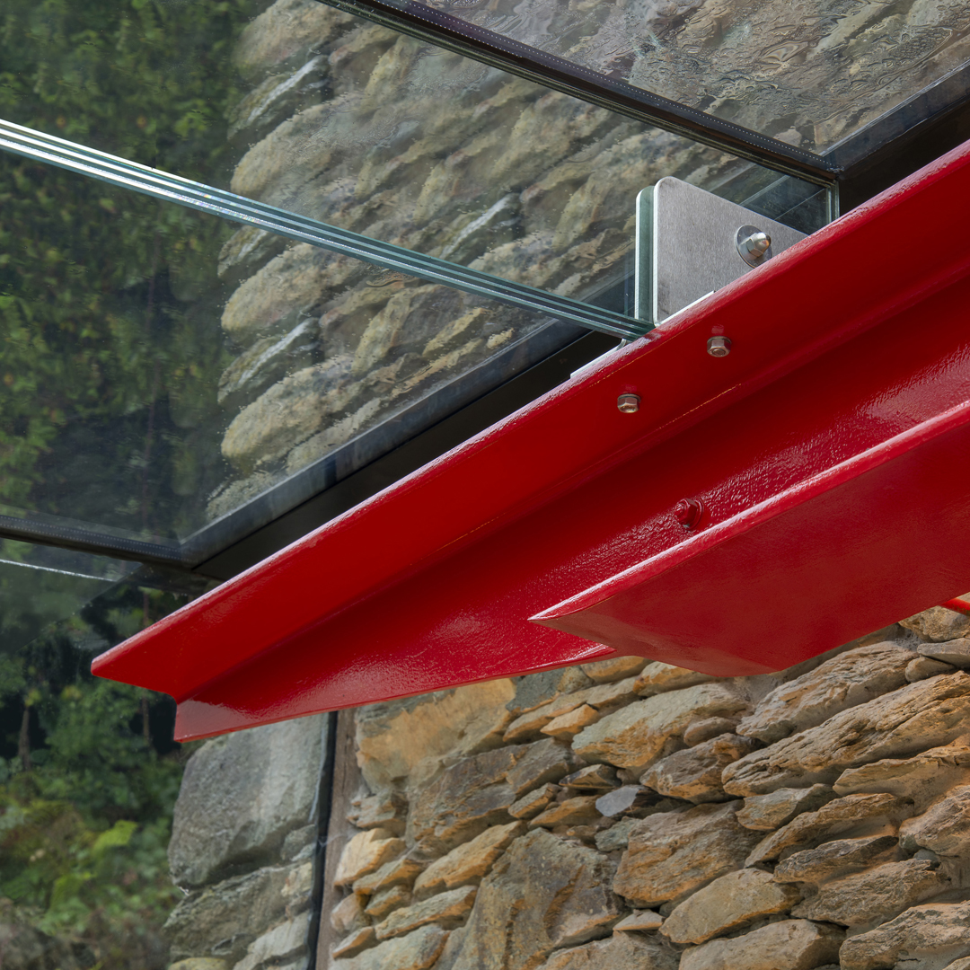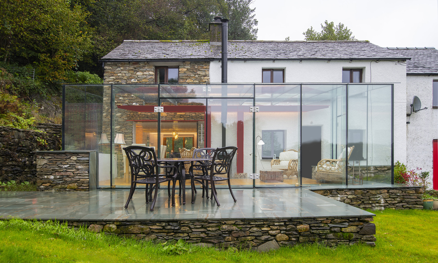 Wood House sits on an exposed hill side in the southern part of the Lake District National Park, and enjoys spectacular views over the Duddon Estuary. In order to take advantage of such a magnificent setting, the core idea driving the design was to maximise the transparency and connection between inside and out. Comfortable outdoor living, all year round. The structural solution was key to achieving our aim. The main solid elements of structure are located centrally and cantilever out, allowing the enclosure to be a completely glazed box constructed from high performance, laminated, structural glass. By taking a holistic view of the whole house, as opposed to just the extension, we were able to reconfigure the ground floor to make the access, storage and functionality more useful; whilst also enabling the main kitchen, living and social spaces to work more effectively as one fluid space suitable for large gatherings and everyday family use. As the clients manage the surrounding woodland, they have a free and sustainable source of firewood. Working with this, the design incorporates a new wood burning stove and zonal underfloor heating, linked to the existing hot water system and air source heat pump. The result… hot water and a heated house, for free, for ever!