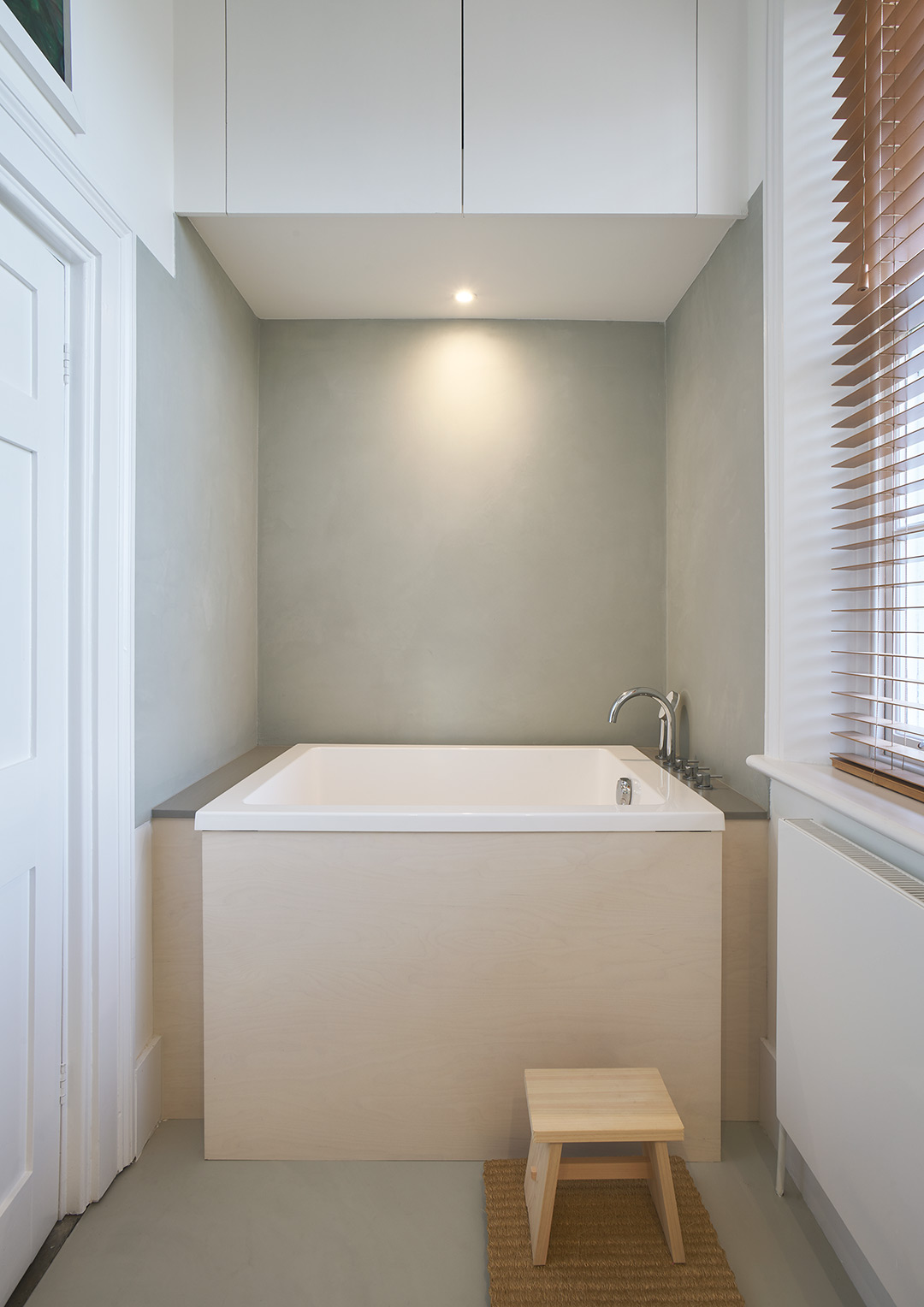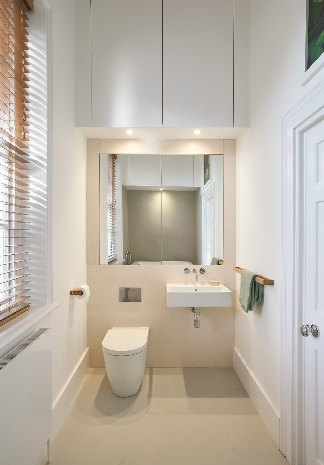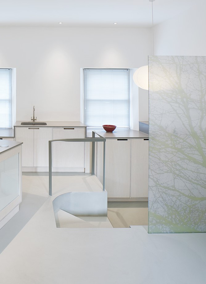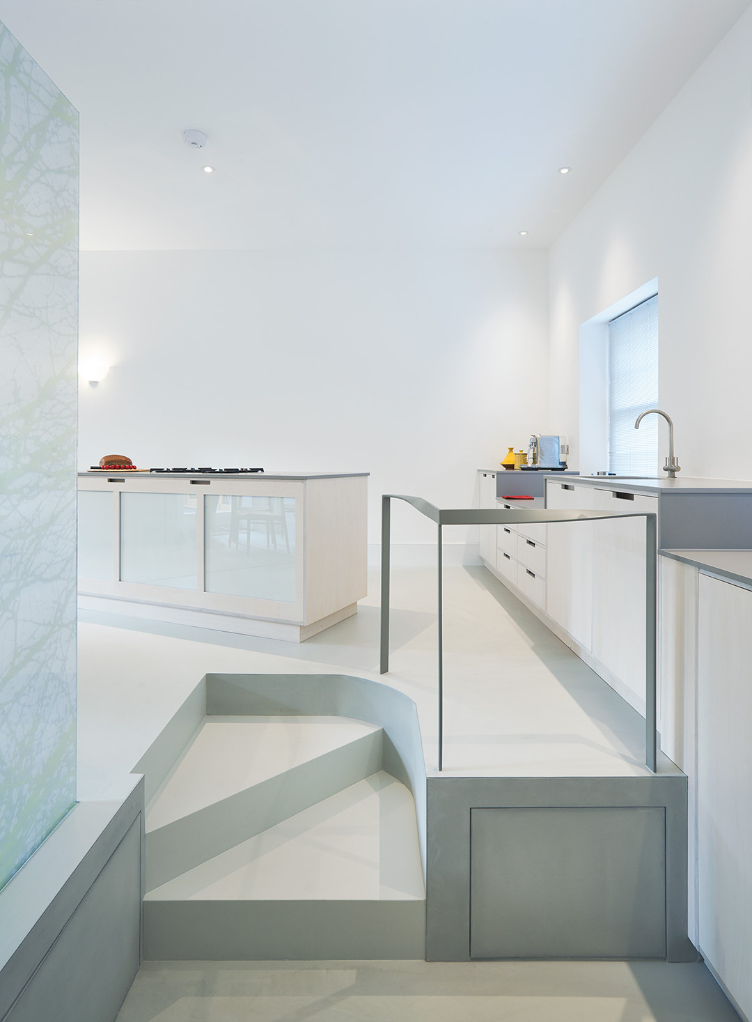 Strip 1980's fittings and arrangements to install minimalist interiors, including resin floor, glass screens, new kitchen and bathroom