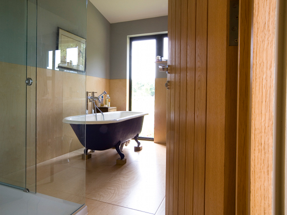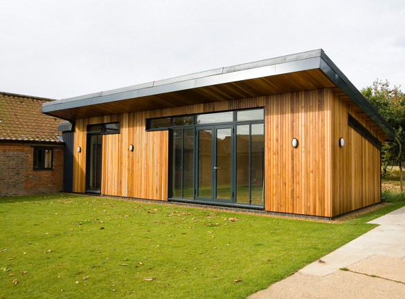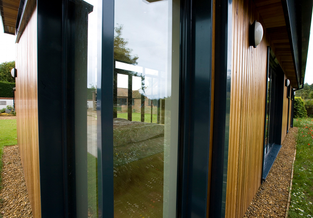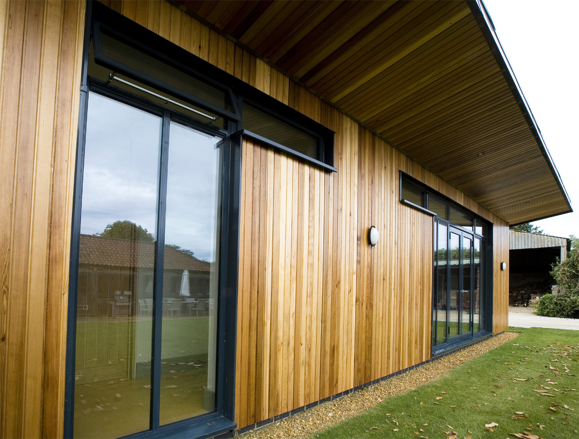 The aim of the project was to create a contemporary extension to the existing converted farm buildings. The objective was also to create a sheltered environment to the courtyard area formed by the building. As such, a mono-pitch design was sought to give high, airy spaces to the new extension. These mirrored the open roof void areas to the existing extension which gave the existing property a characterful open plan feel. The design of the new extension contrasts strongly with that of the existing with a vertical Cedar boarded form with dark brown aluminium windows with large elements of full height glazing. Internally the design incorporates ply flooring throughout with a high standard of finish and shadow gap details. The building has been constructed to very high thermal standards using a 200mm deep timber frame constructed on site with shredded newspaper insulation. The mono-pitched roof is constructed in a similar way also with a high thermal performance level. The windows are thermally broken aluminium and have not only a very long life span but also can be very efficiently recycled if required. The roof is the Eternit Profiled roofing panel blending in with the agricultural location generally. The Cedar cladding externally picks up on the existing detail of the current buildings. The timber frame construction has a lower embodied carbon energy. The heating is via an underfloor heating system connected to the existing boiler. The building sits well in its surroundings and has enhanced the existing house and enabled it to become a more successful house.