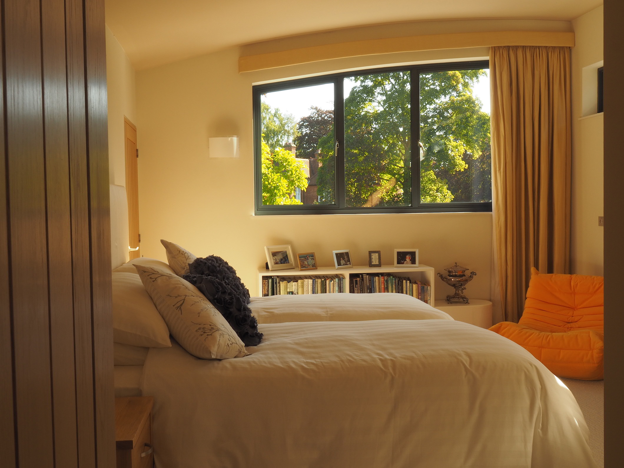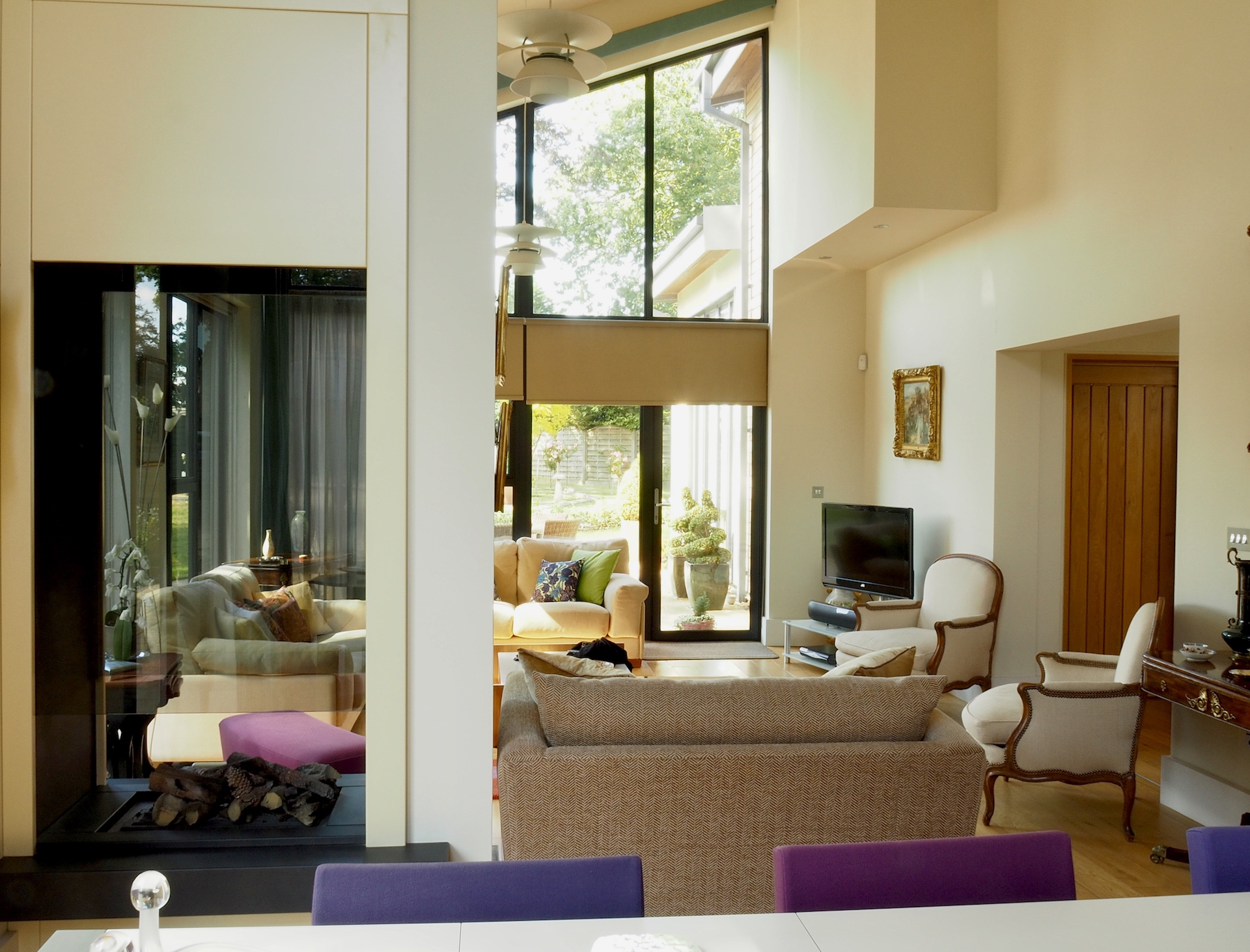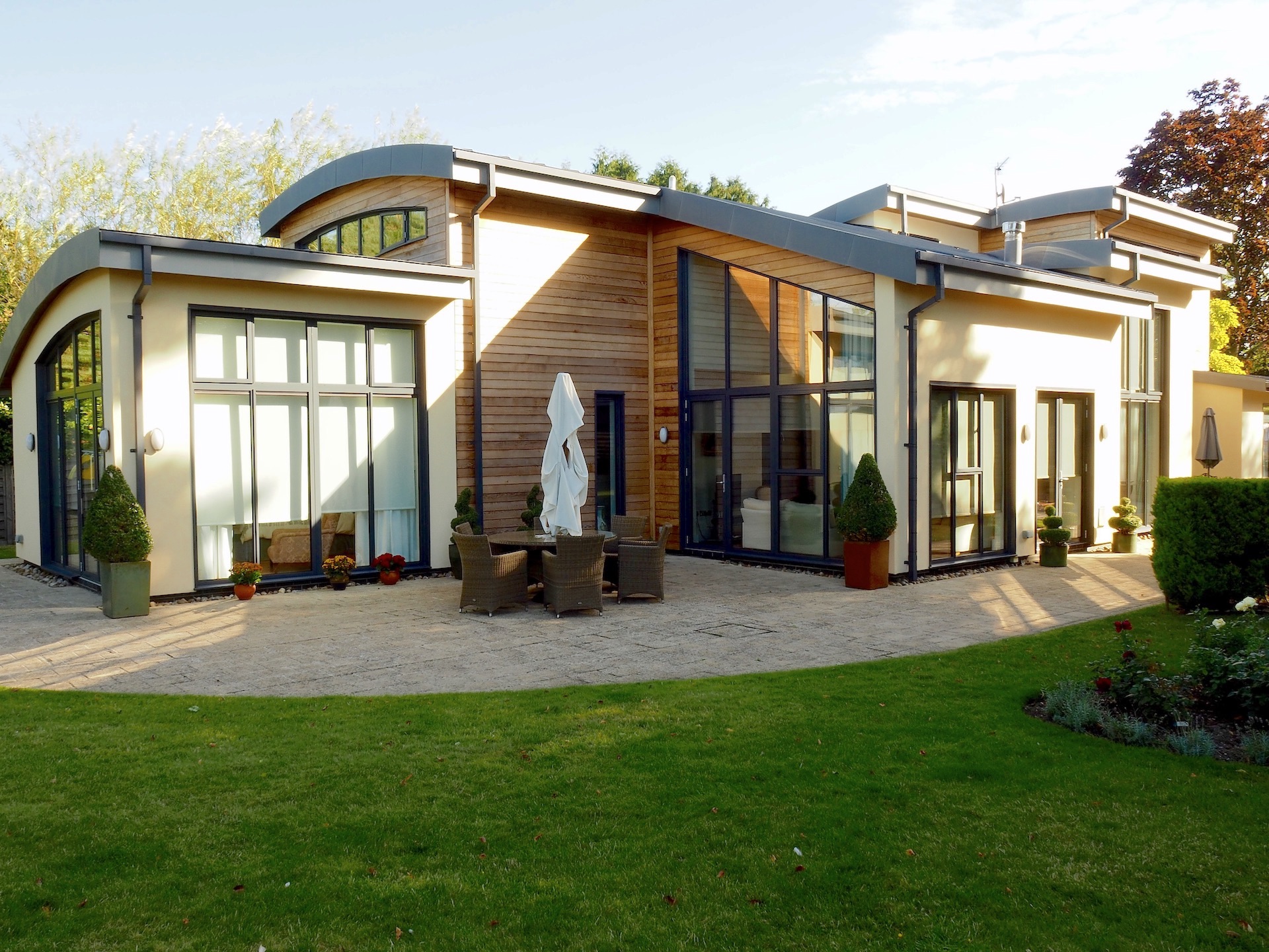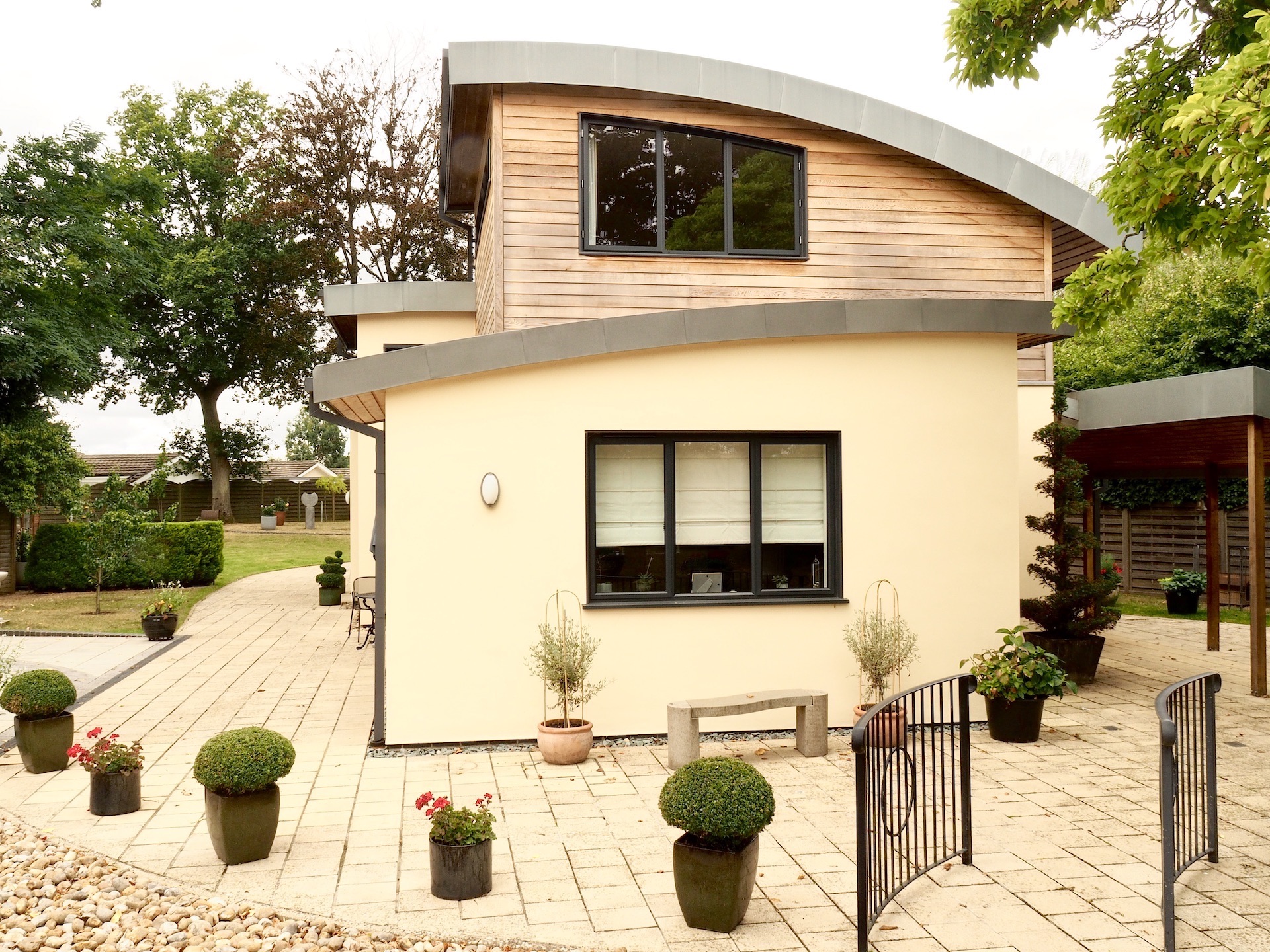 A sustainable house constructed with off-site timber frame technique, shredded newspaper insulation and ground source heat recovery. Very high levels of thermal insulation are provided. Special features include a vaulted roof with aluminium cladding, external cedar cladding on walls and natural lime render.
