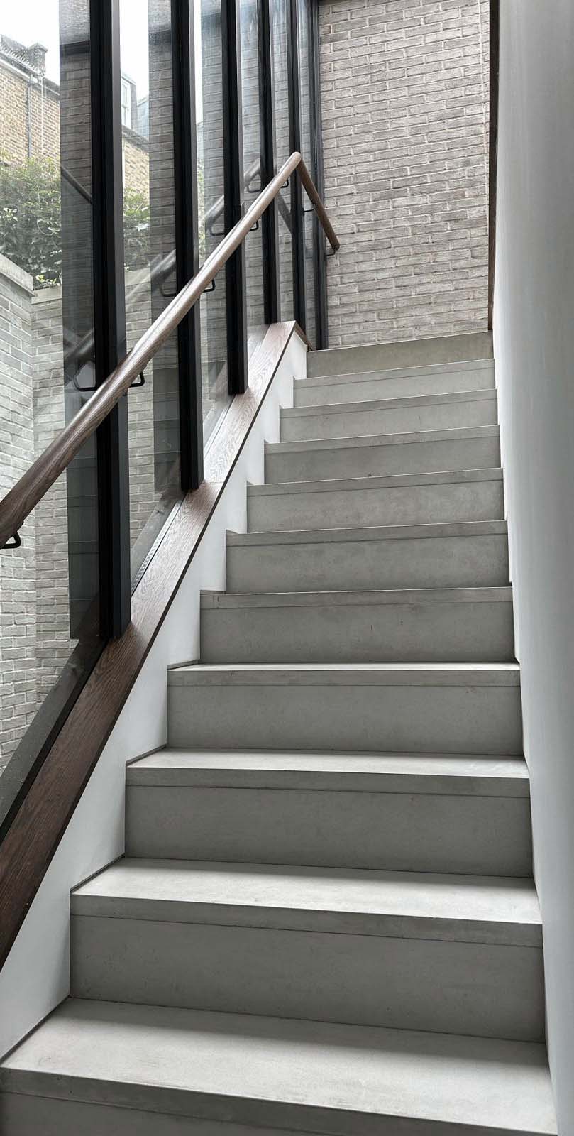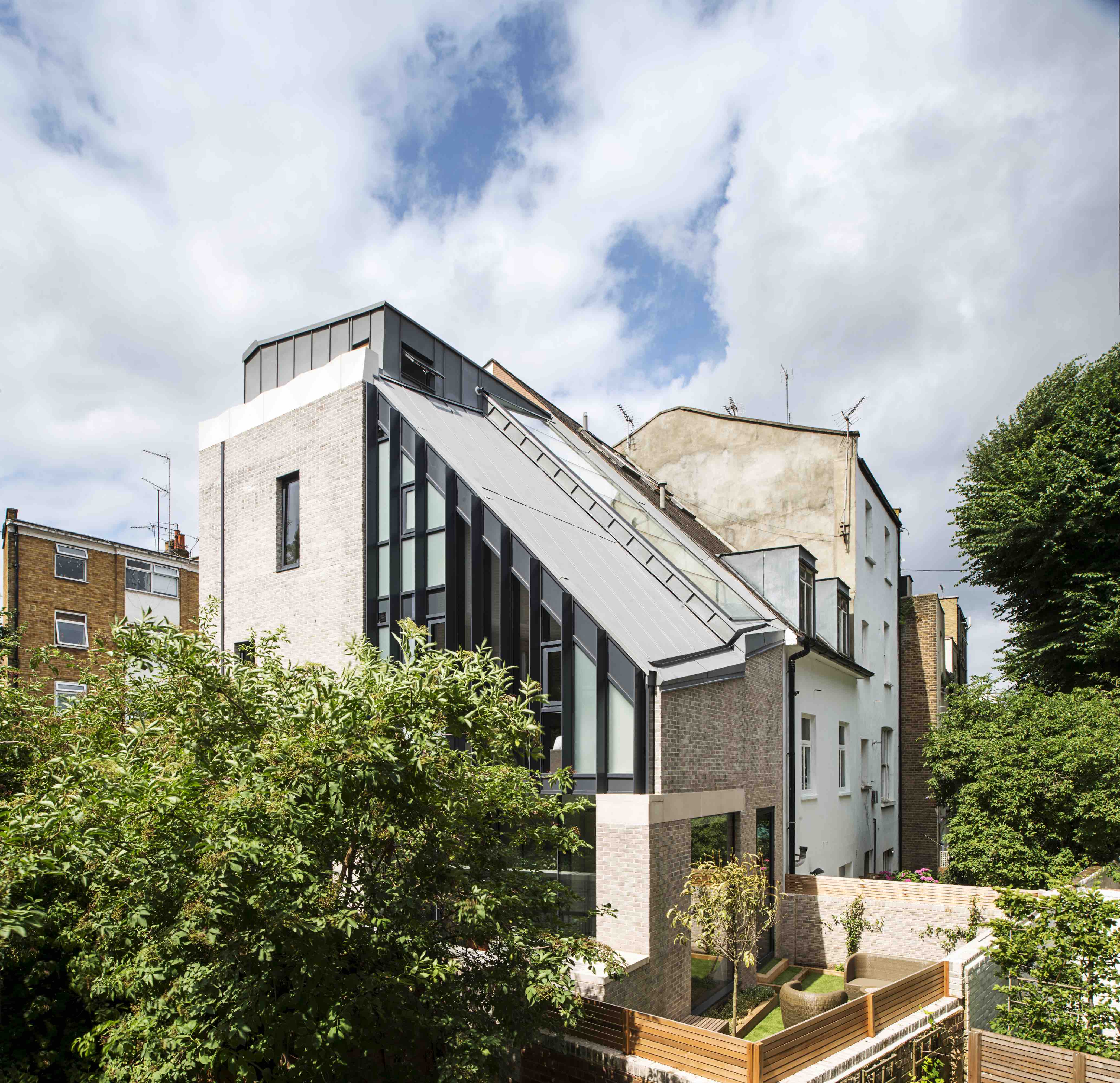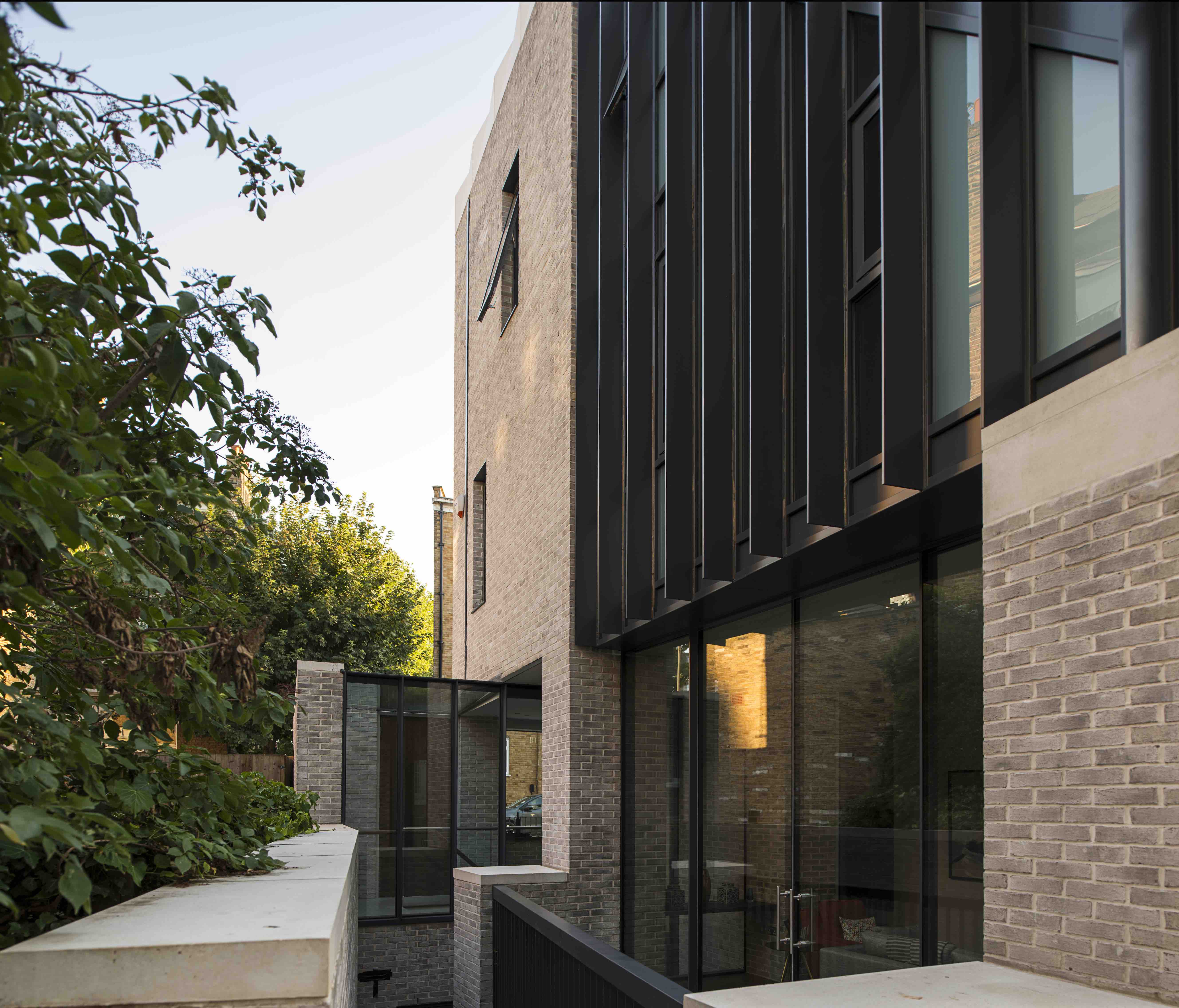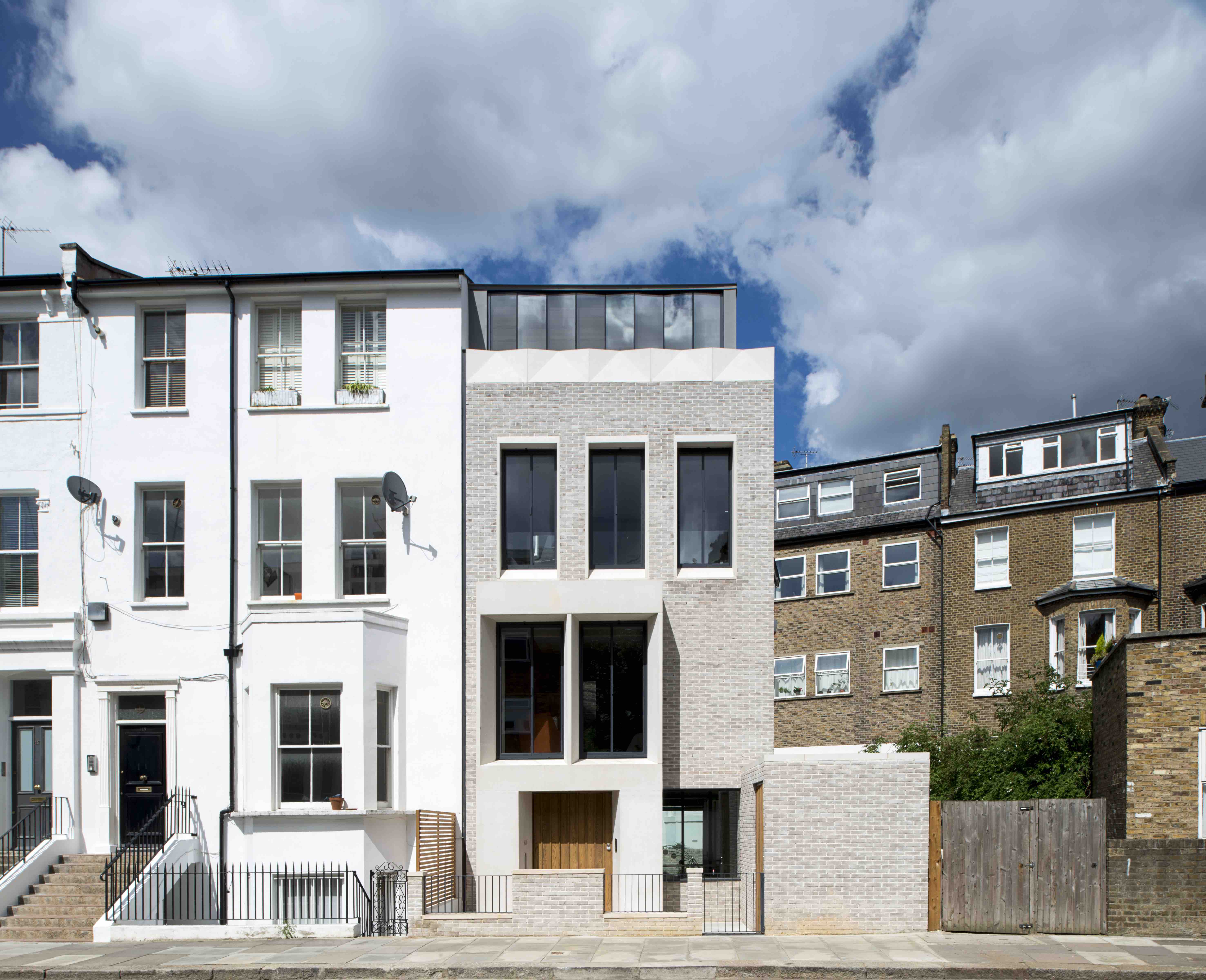 Shortlisted for a London RIBA Award, and commended at the New London Architecture Awards, the 5 bedroomed Tailored House draws an analogy with a tailored suit – elegant, cogent, and intrinsically familiar when initially apprehended, but revealing material opulence and individuality in details. The ‘sartorial’ brief called for a variety of spaces – expansive settings for social gatherings and inner ‘pocket’ sanctums for treasured moments of solitude – in a house of equal stature to the neighbouring Victorian townhouses, but entirely modern and unique. The 2,000 sqft build is conceived as a series of layers receding from the street, variously lifted, punctured and fanned open to allow light to the interior. The street fac¸ade – in overlayed planes of loadbearing Roman-format brick, render and Carrara Arabescato marble – dissolves along the flank, which is cranked outwards to gather light, tracing a faultline in the urban grain. The brickwork gives way to a screen of stone fins that conceal sheer glazing behind. These contrasting planes of striated, abrasive textures and sumptuous stone are accented by tall, bronze-framed windows.