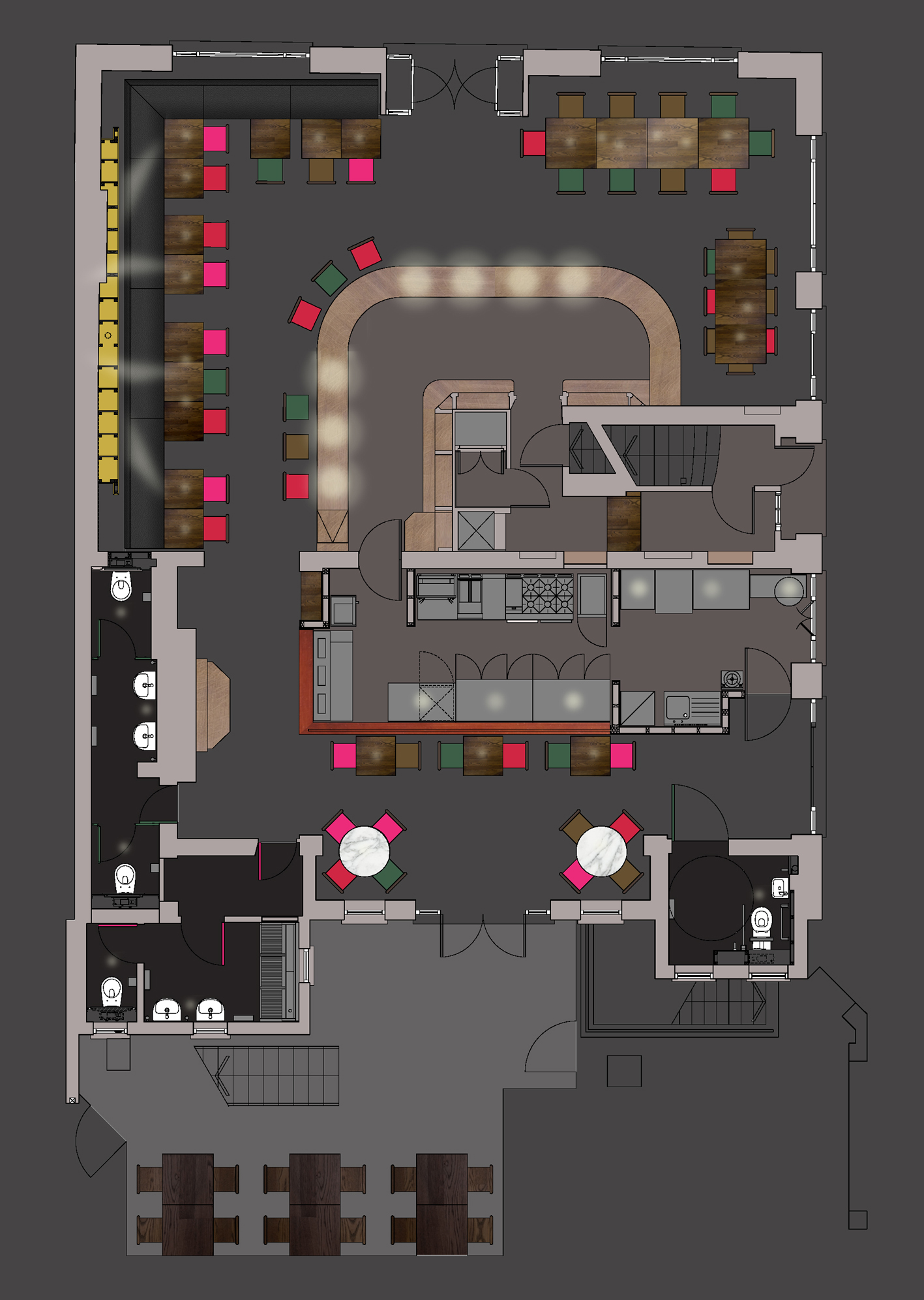 The Bluebell is an elegant pub with rooms that resonate with the stories of its past. Think of it as an idea; a metaphorical link from the city to a rural past. A painted mural, occupying an entire wall, suggests a dream-like connection to the beautiful Irish countryside, and provides, as backdrop, the narrative of a family’s life journey. It also creates a kind of portal through which dreamers are invited to escape the city. Within the lounge sits a new kitchen set within a timber and pink striped box. Perhaps the use of such emotive colour is the antagonist in the identity conflict of the post industrial man. The kitchen has glass walls, behind which the chefs show-off their virtuosity both as cooks and performers. Taunting the definition of traditional masculine space. The old bar, displays a touch of displaced Victoriana. It is somewhat gnarled, displaying each of the changes wrought upon it over the years, like the scars from a violent mass brawl. It now hosts new satin polished stainless steel equipment that glows softly in the delicate yellow electric light of the evening. The mood is dark, brooding and enveloping. The pub is the city, whose rich memory of grime and industrial heritage, has been worked -over with fine leather seating and dark oak tables. Beer, now served in vase-like glasses,is consumed with wine and fine food to follow. Disorientated boozers might stare wistfully into the secret forest at the other side of the mural wall. Perhaps they try to recall the days when the beer was served warm and the salted peanuts were dinner's main course.