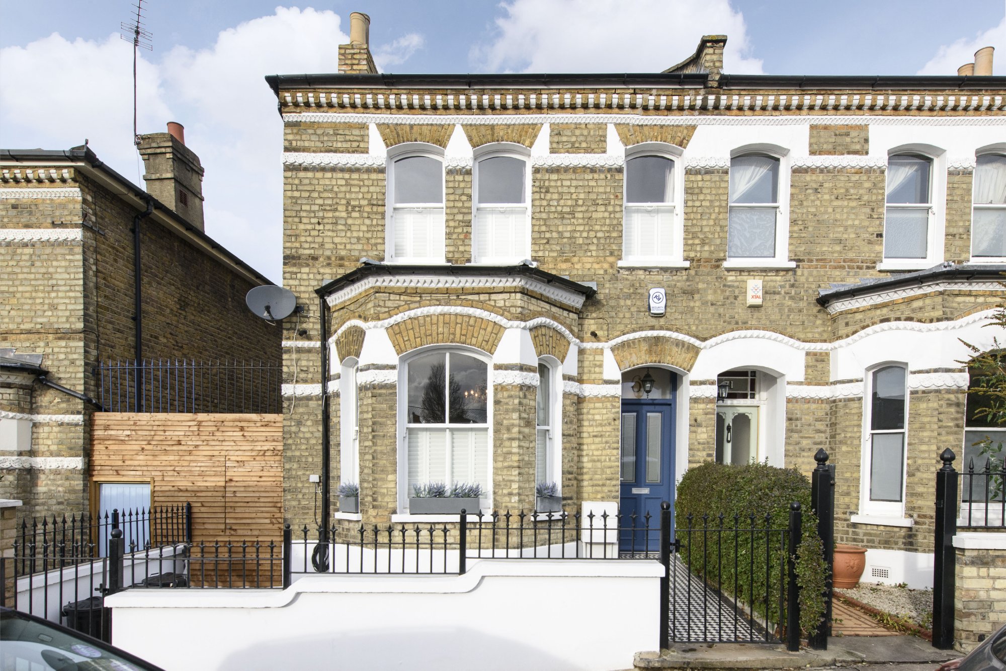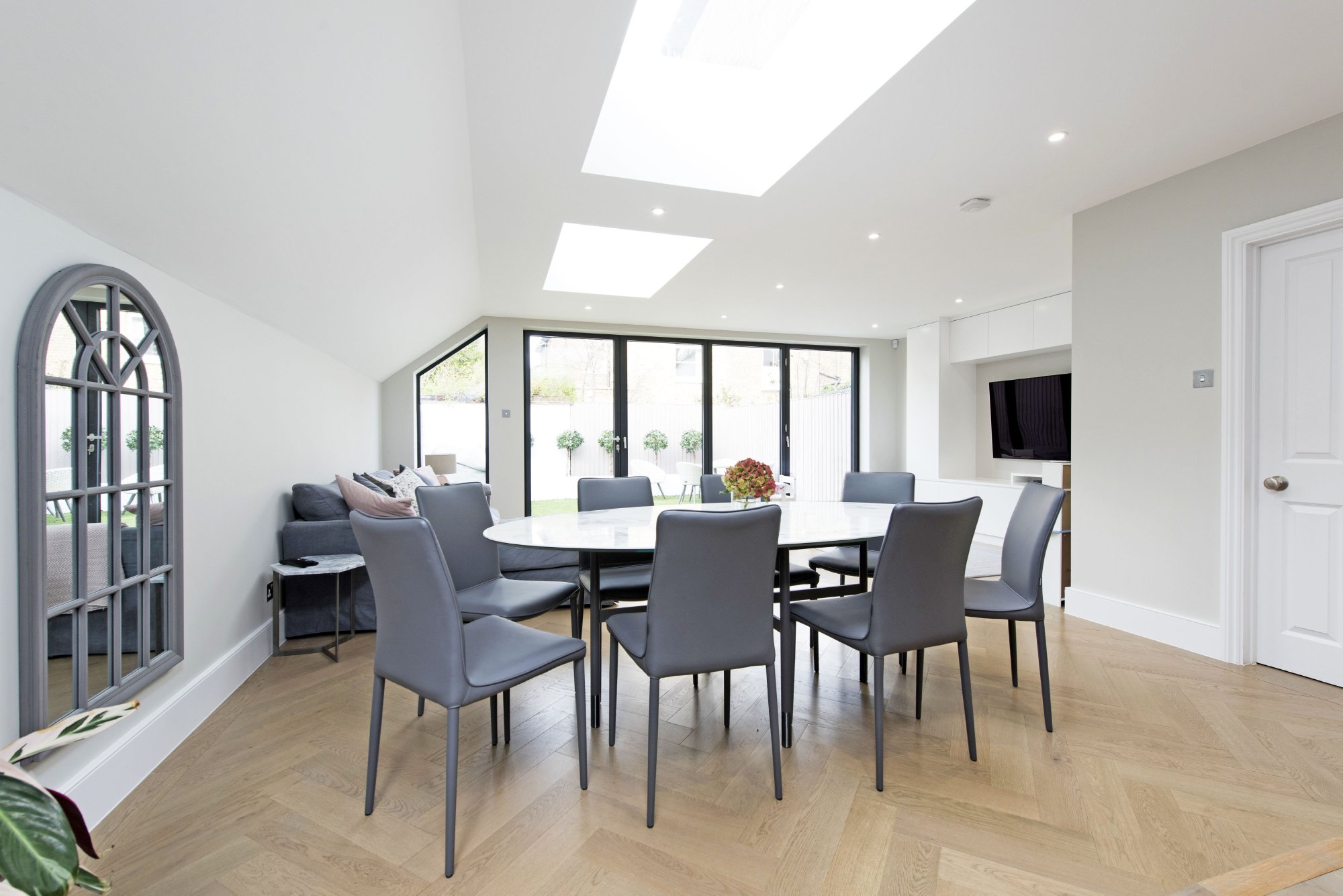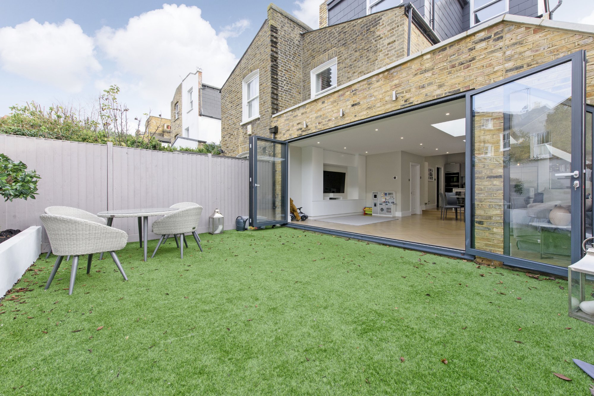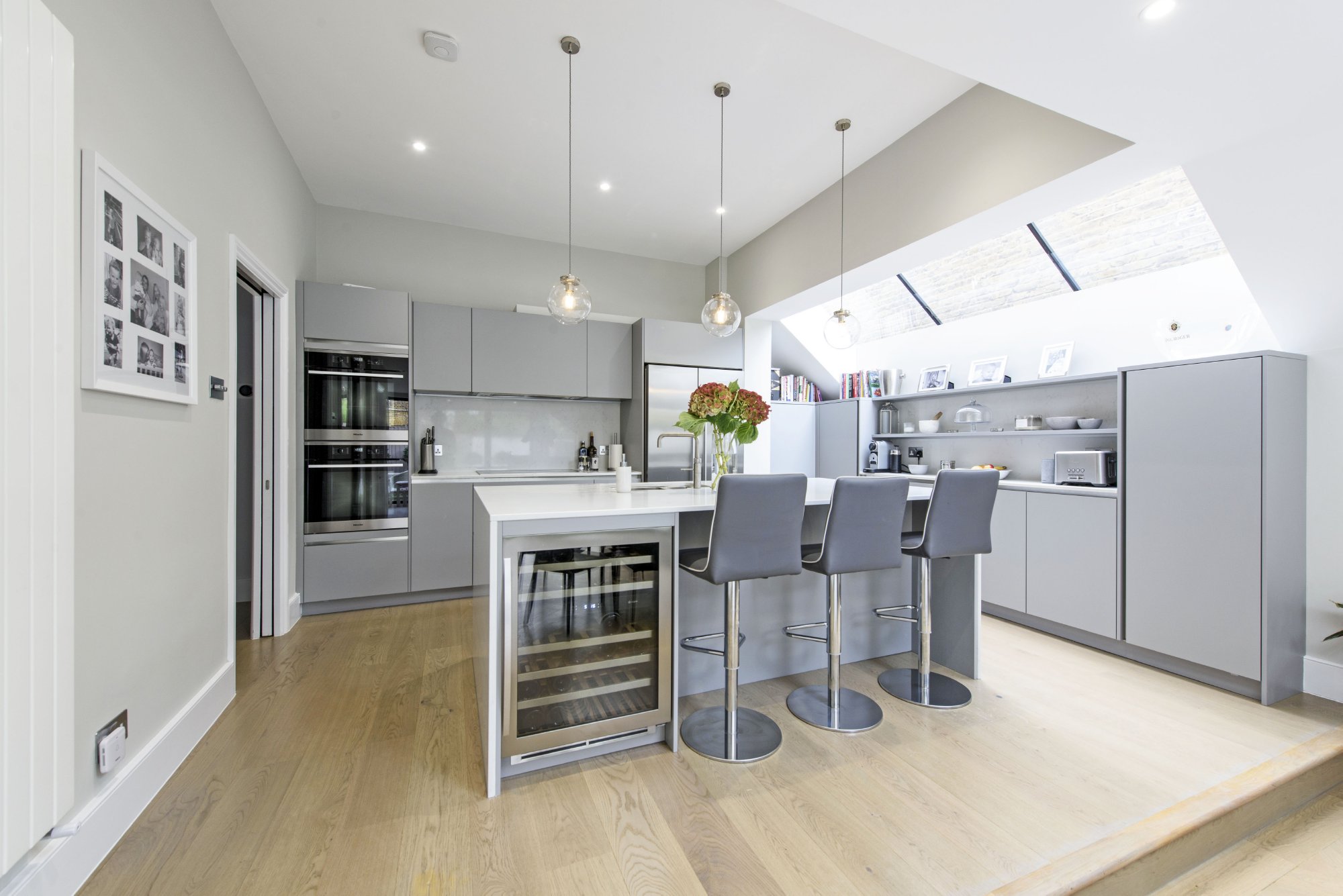 A semi-detached housed on three floors has been extended at the side and rear to provide a large open-plan kitchen and living area with bi-folding doors opening onto the garden and a glass roof over the kitchen. Structural alterations included the removal of the wall between the dining room and the new extension and a new cloakroom was inserted adjacent the main staircase off the entrance hallway.