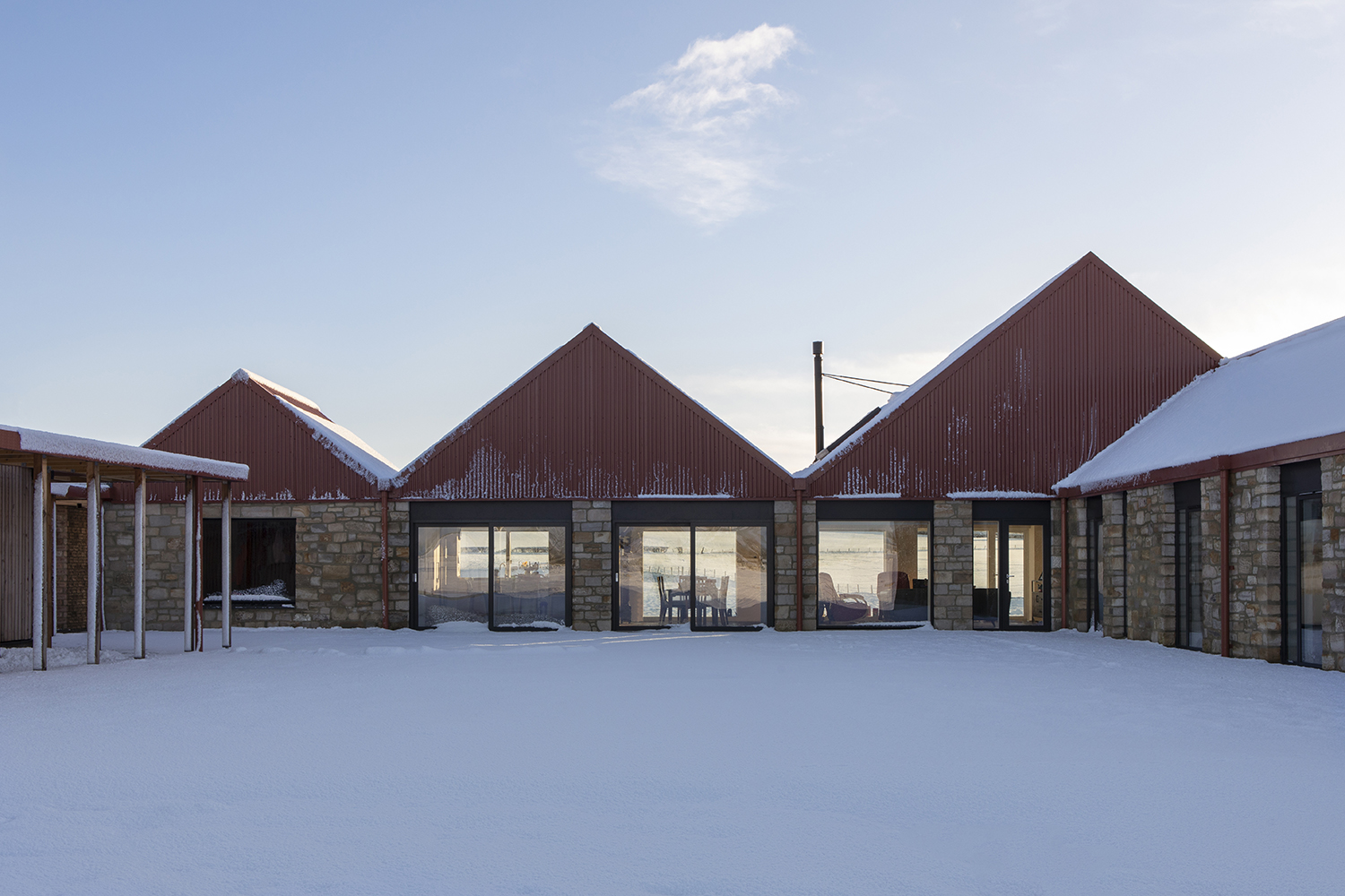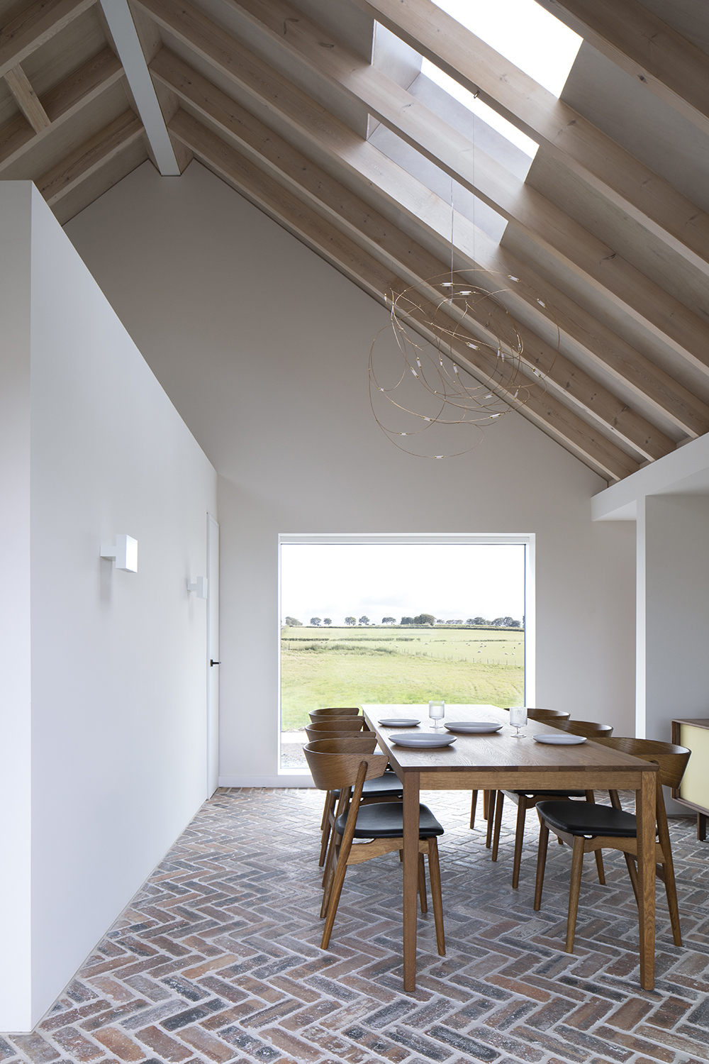 We were approached in 2017 to design a new family home in a working farm on the outskirts of East Kilbride, South Lanarkshire. The home was to replace a dilapidated farm steading that the family had owned for over 100 years. Key to the design was the formation of a new courtyard to offer protection from the elements on the exposed site. The building is characterised by three pitched volumes taking their form from the adjacent buildings and clad to respond to the agricultural context. Existing reclaimed materials were also reused throughout the new building in order to reduce embodied energy within the building and retain the character of the existing materials from the site. The house name draws inspiration from the Scots Gaelic origins of the site and the word 'Ceangal' means to 'bond' or 'link'. This reflects the materiality of the building, and the family connection to the site.